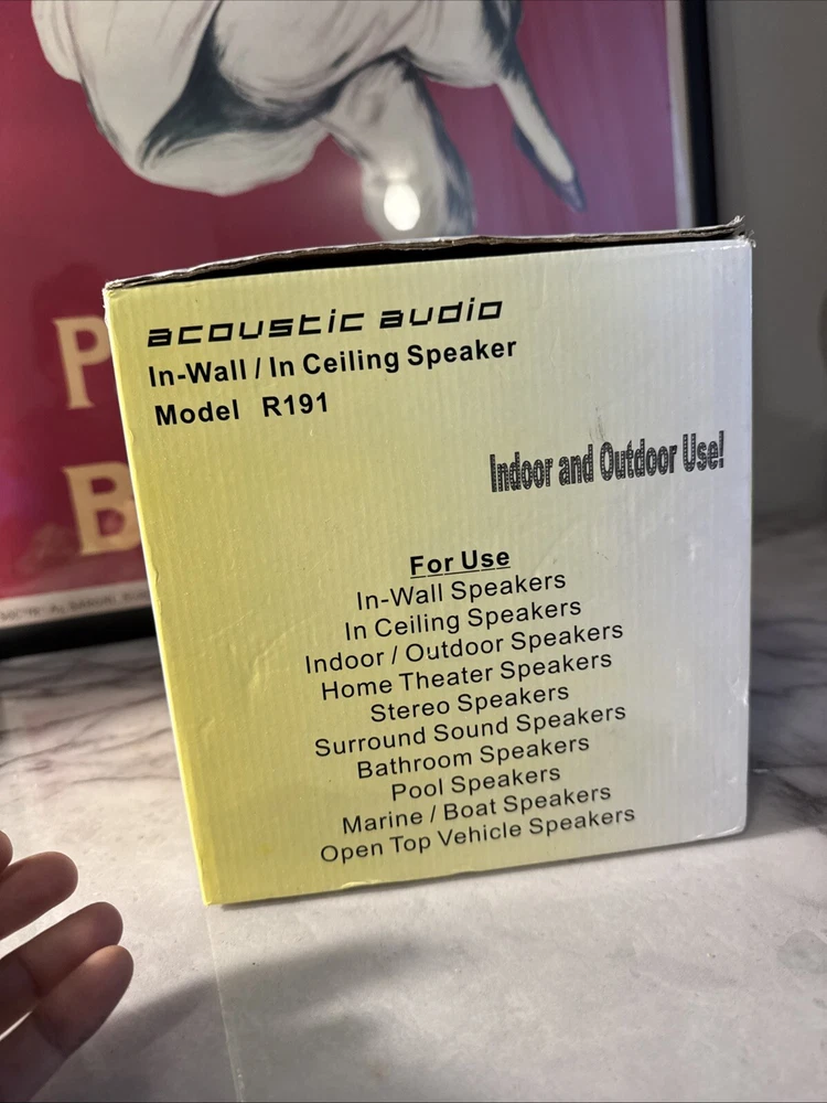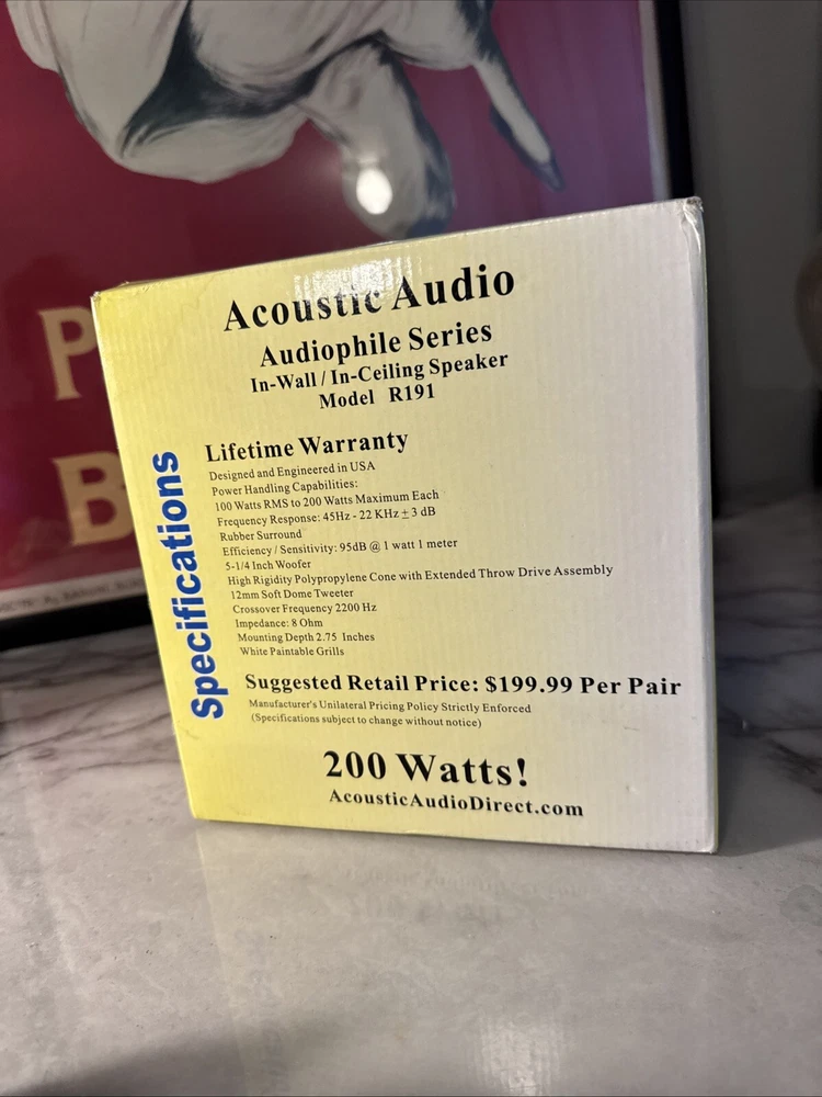 The product is a pair of Acoustic Audio by Goldwood r191 in-ceiling speakers with a driver size of 5.25 inches. These sphere-shaped, frameless white speakers have a wired connectivity, RMS power of 200W, and an impedance of 8 Ohms. The set includes two speakers suitable for home audio setups.