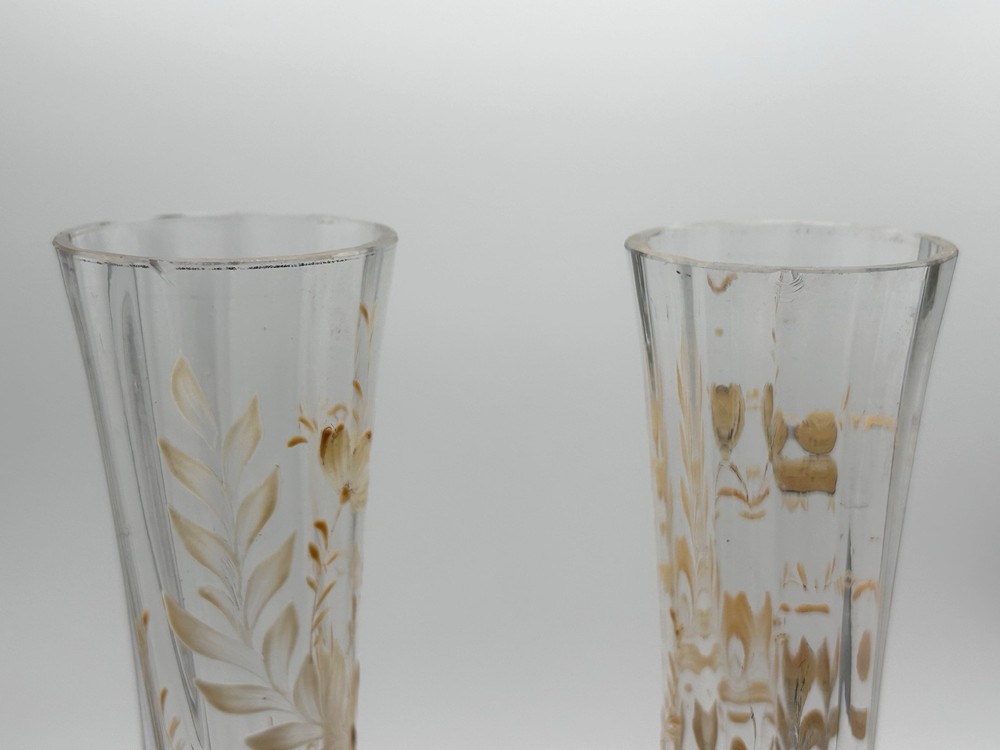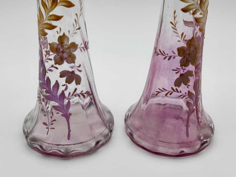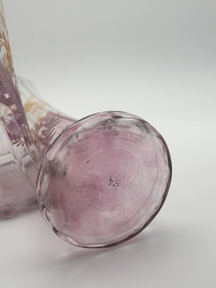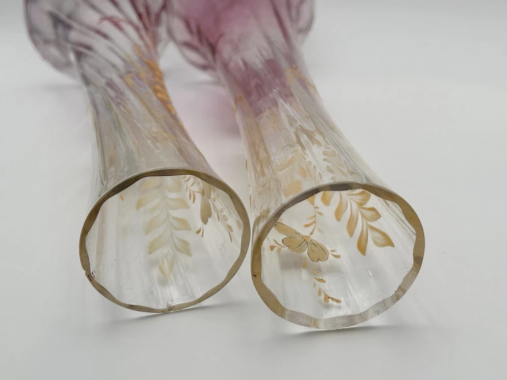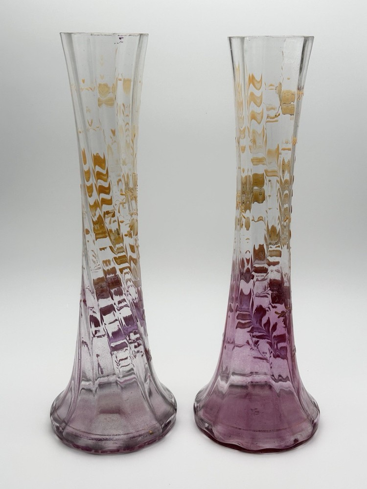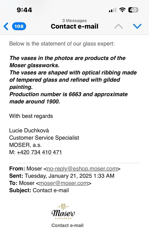 This listing is for a beautiful pair of authentic Moser Karlsbad Bohemian amethyst glass bud vases, dating from around 1900. Each vase is hand-blown and features delicate hand-painted gilt floral decoration with enamel highlights, a hallmark of Moser’s artistry during the Art Nouveau period. Maker: Moser Karlsbad (Karlovy Vary, Bohemia, Austria-Hungary) Material: Amethyst glass with gold & enamel floral decoration Size: approx. 10 & 1/4 inch tall Markings: Each vase bears a faint hand-applied workshop mark (“K” with numbers) on the base, consistent with Moser’s production practices of the period (see photo). Verification: This pair has been verified as authentic by the Moser Glass company, Karlovy Vary. A screenshot of their confirmation is included among the photos for buyer reference. Condition: Very good antique condition with only small flea bites to the rim of each vase (see close-up photos). No cracks or major damage. Decoration is well-preserved with some expected age-related wear. These vases display beautifully and are a fine example of Moser’s early 20th century craftsmanship. They are being sold as a matched pair. Please review all photos as they are part of the description. ✅ Ships carefully packed, double boxed, and insured for safe arrival.