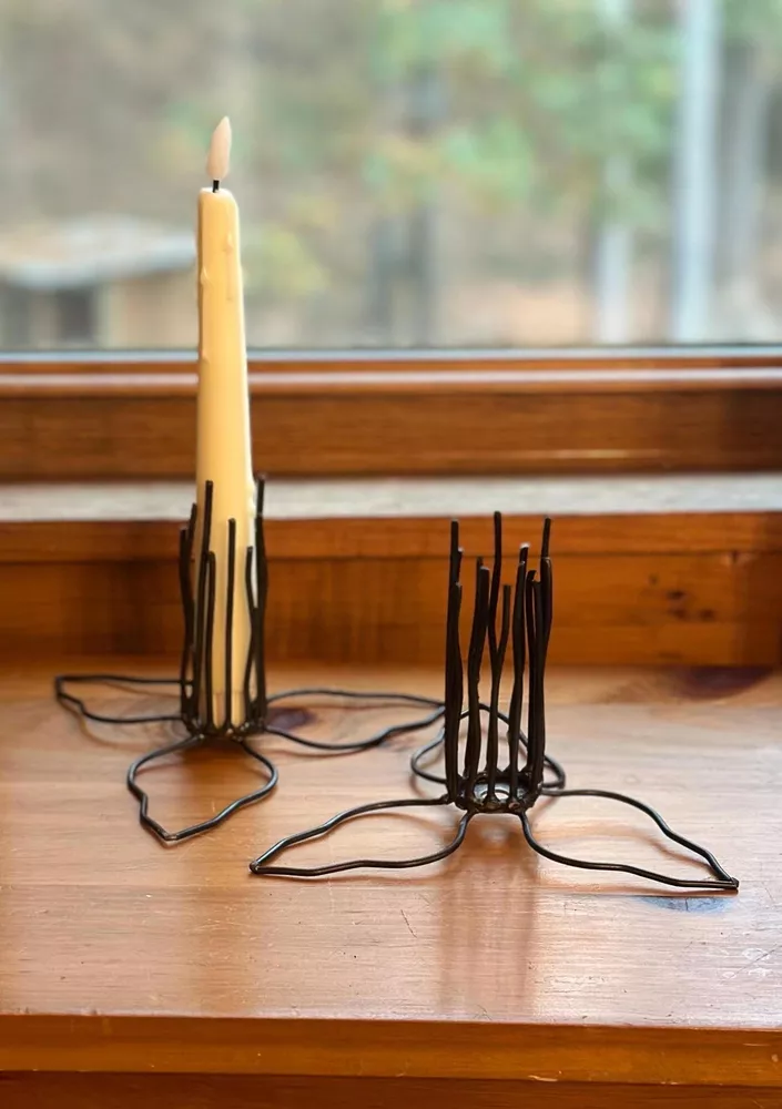 Unique pair of iron candle holders shaped like flowers. Each measures 4.5” tall x about 7” across. The opening is about an inch but could be adjusted just a bit. To prevent wax from getting everywhere I would consider using a fake taper candle like in the image or a set of drip rings.