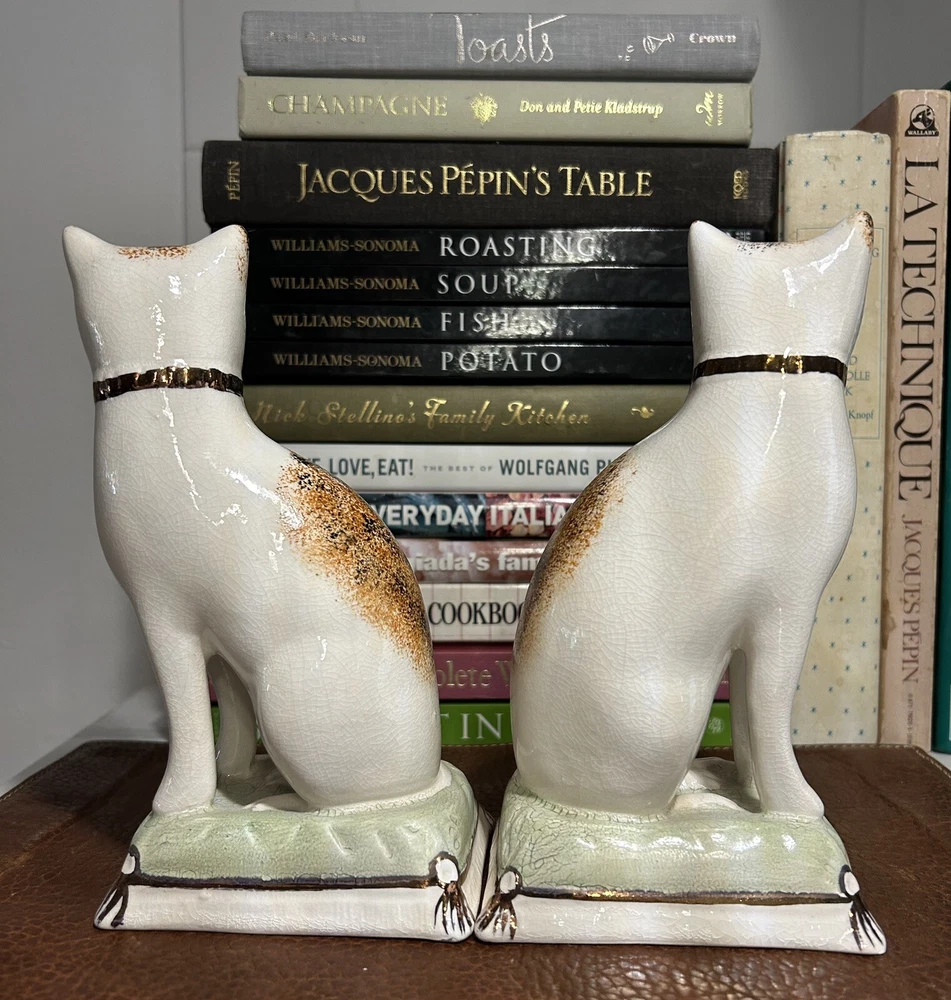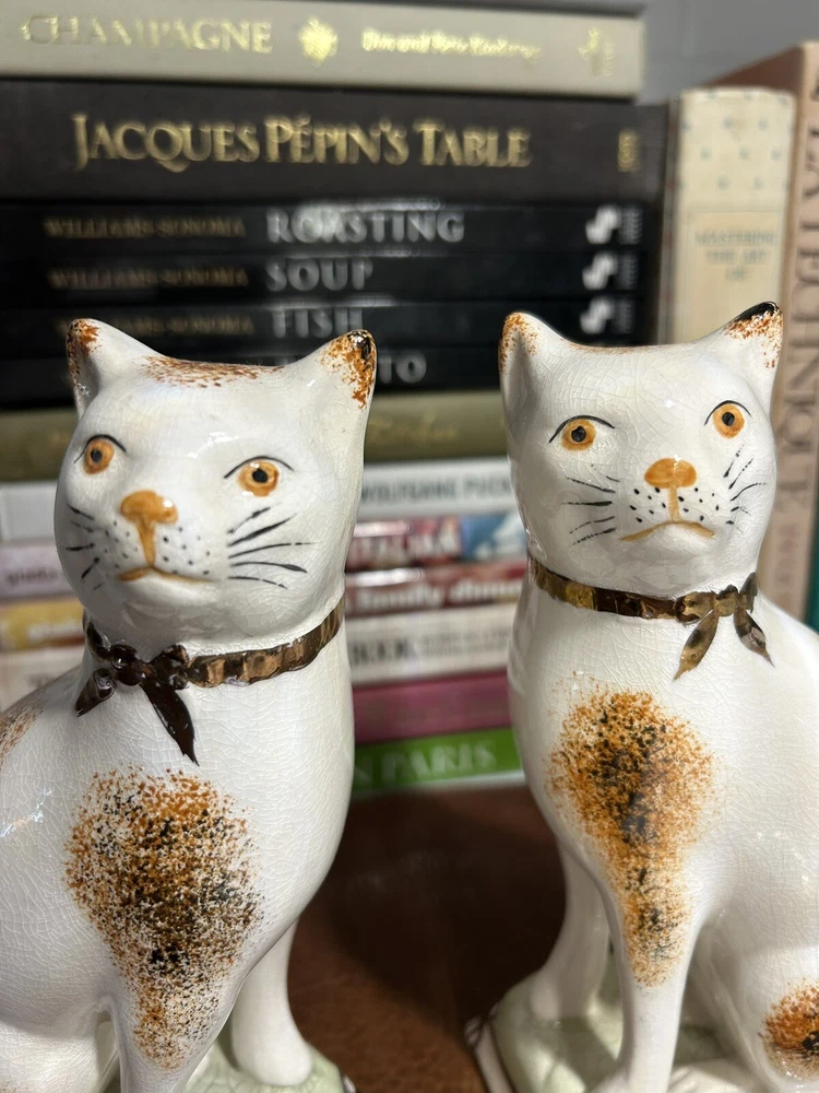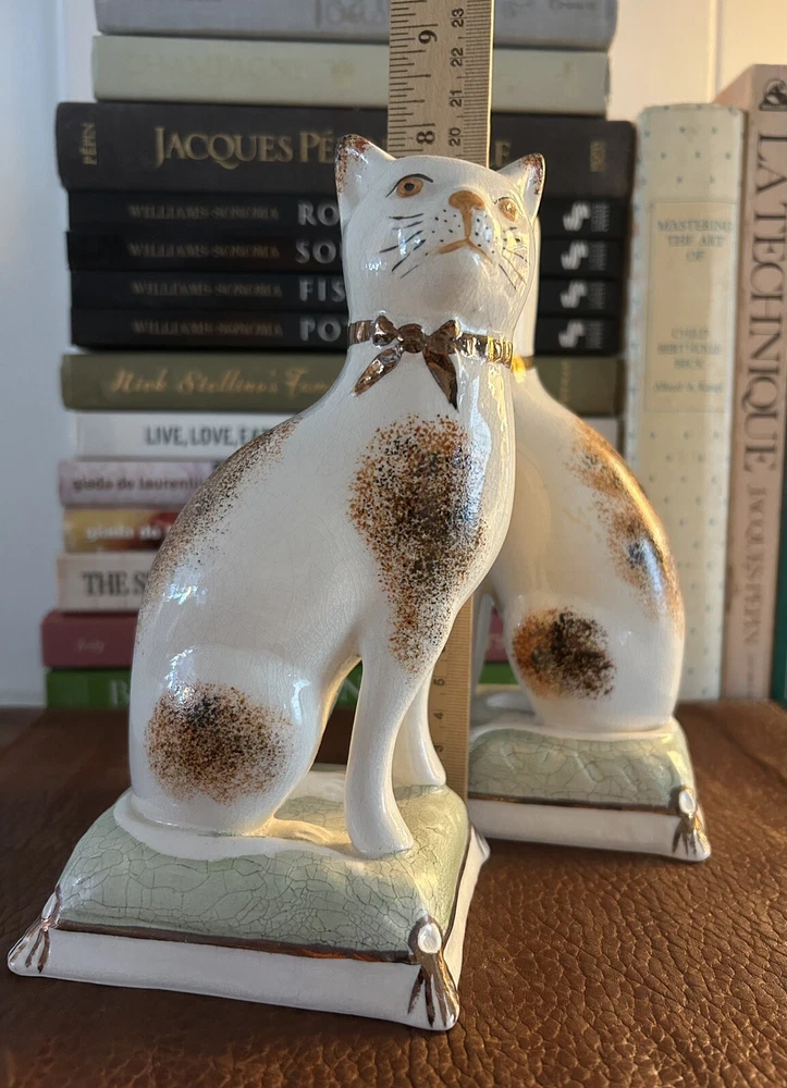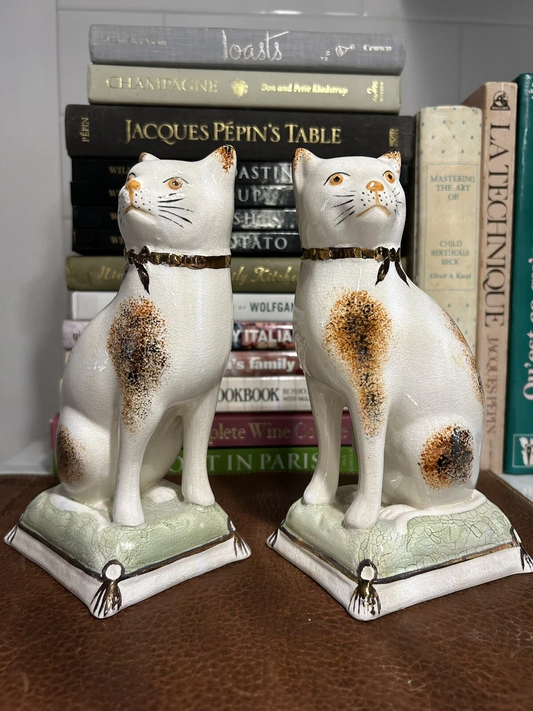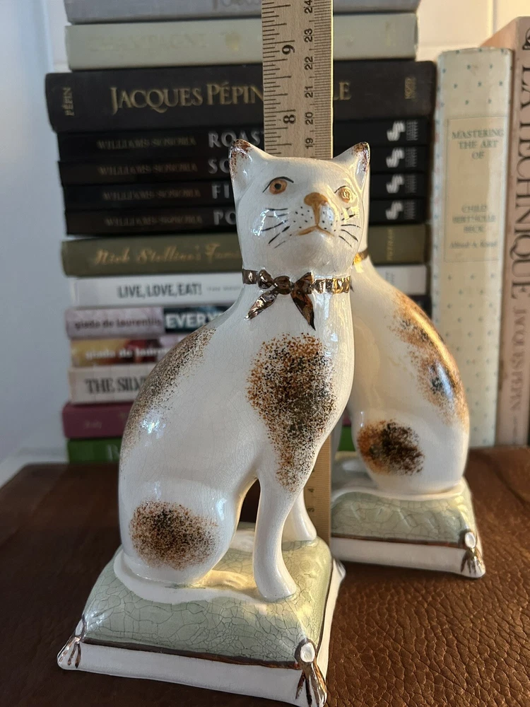 Your chance to own an Exquisite pair of large Staffordshire Cats. We Purchased these in England 40 years ago. They were made by Willian Kent Potteries about 1950. The Calico cats strike a pose sitting on sea-foam green pillows trimmed in gold. They are wearing gold collars. Rare large size: 7 1/2” tall Pillow is about 4” in width and 3” deep. In EXCELLENT condition with no chips or cracks. Ships from Naples, Florida