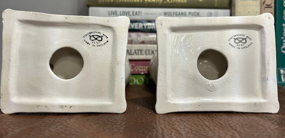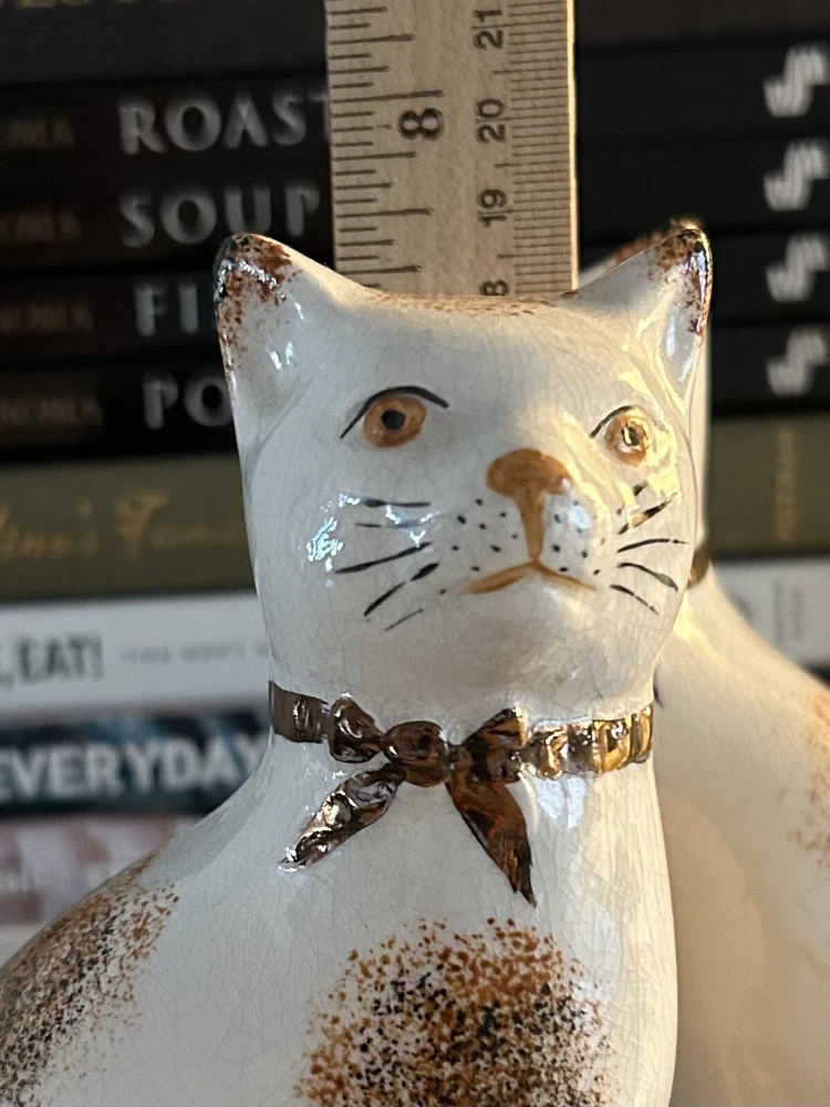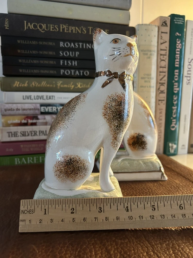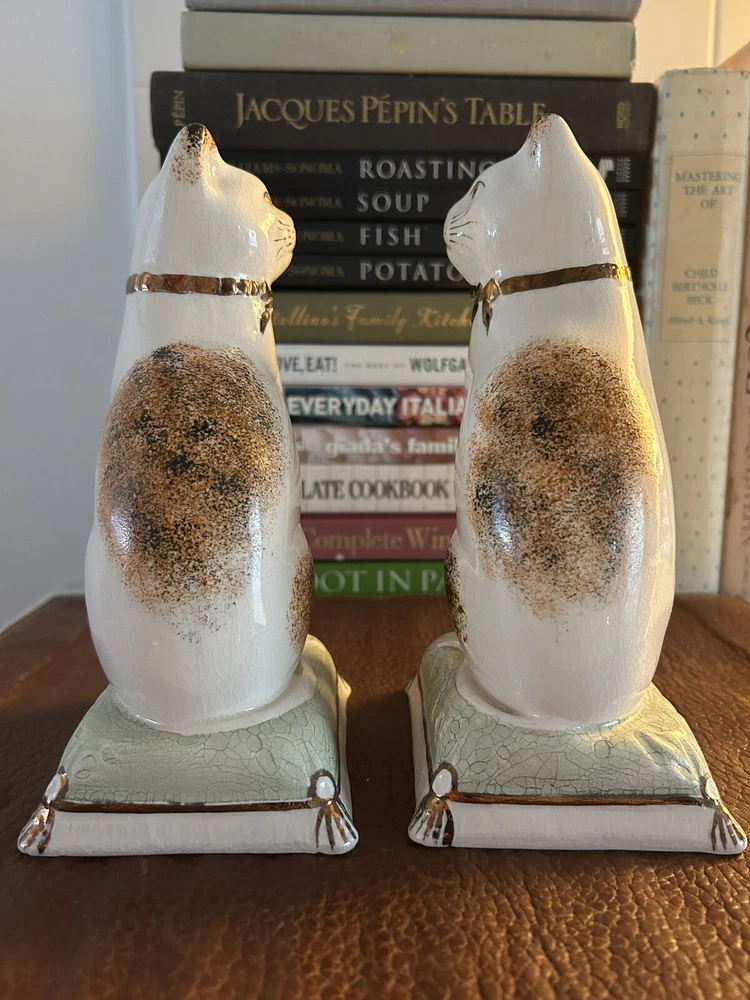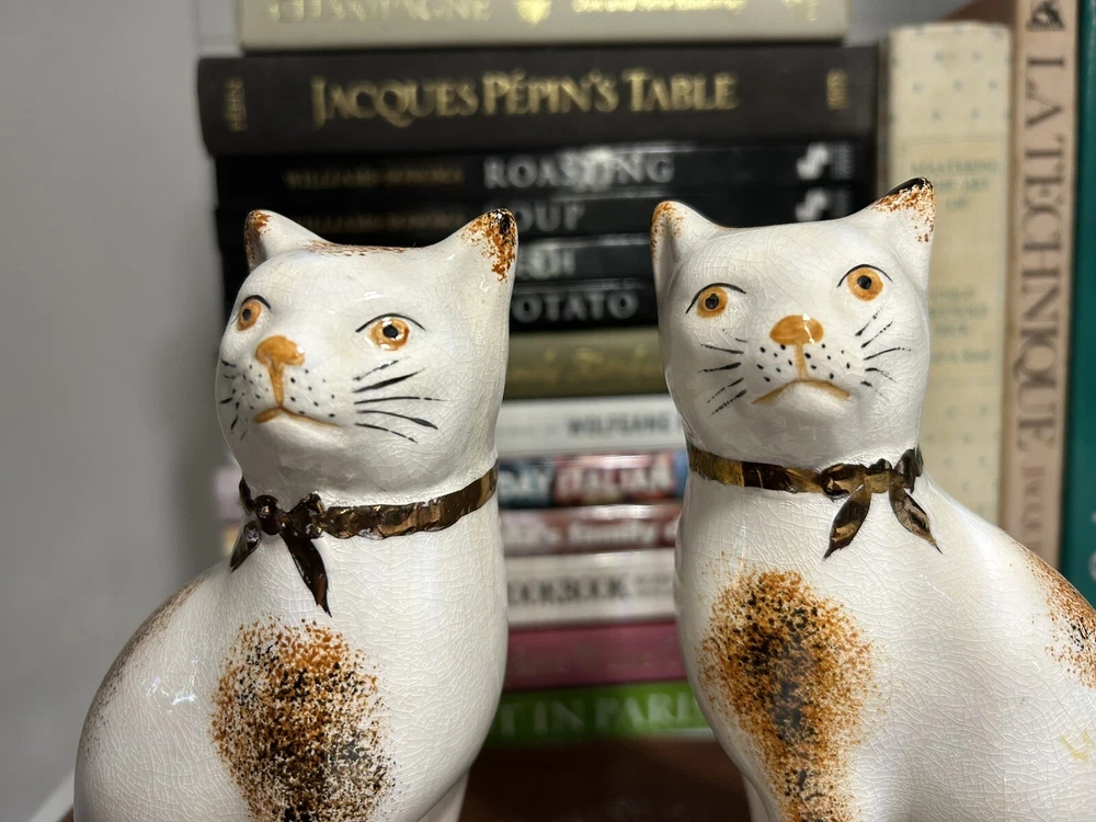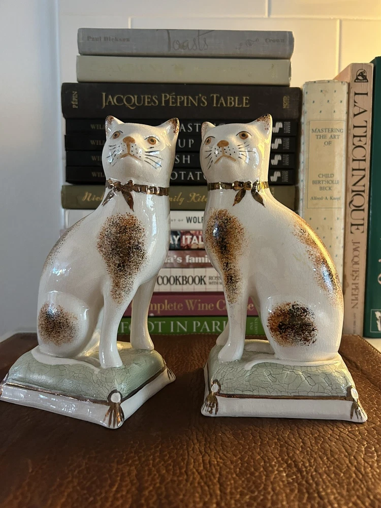 Your chance to own an Exquisite pair of large Staffordshire Cats. We Purchased these in England 40 years ago. They were made by Willian Kent Potteries about 1950. The Calico cats strike a pose sitting on sea-foam green pillows trimmed in gold. They are wearing gold collars. Rare large size: 7 1/2” tall Pillow is about 4” in width and 3” deep. In EXCELLENT condition with no chips or cracks. Ships from Naples, Florida