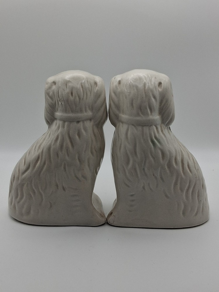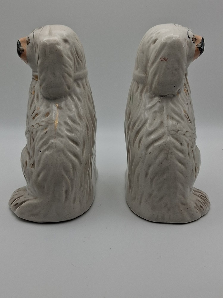 This pair of vintage Staffordshire style spaniel mantel dogs figurines are a charming addition to any Victorian-inspired décor. Made from ceramic with a glossy finish, these white figurines capture the essence of dogs with a classic and elegant style. Unmarked in terms of brand, these original pieces are a nostalgic nod to the art pottery production techniques of the United Kingdom, specifically in the Pot Dogs product line. Perfect for dog lovers and collectors alike, these figurines are a delightful touch of history and craftsmanship to any room.