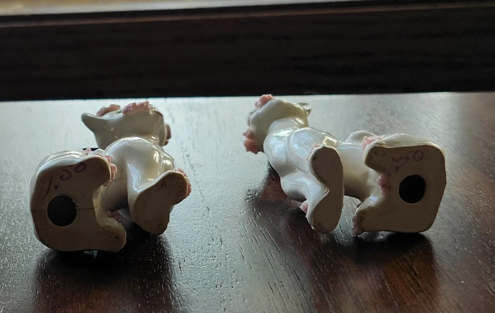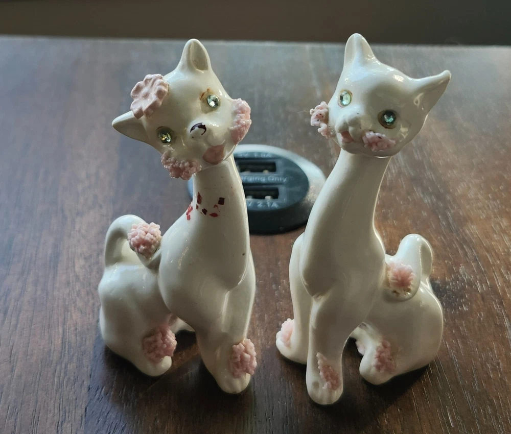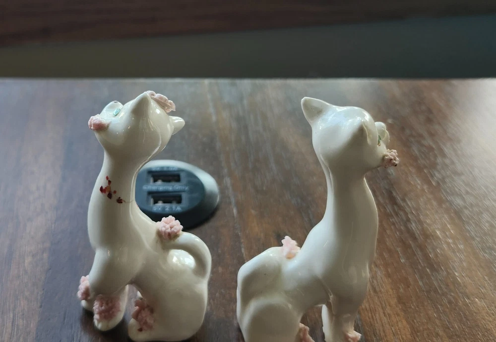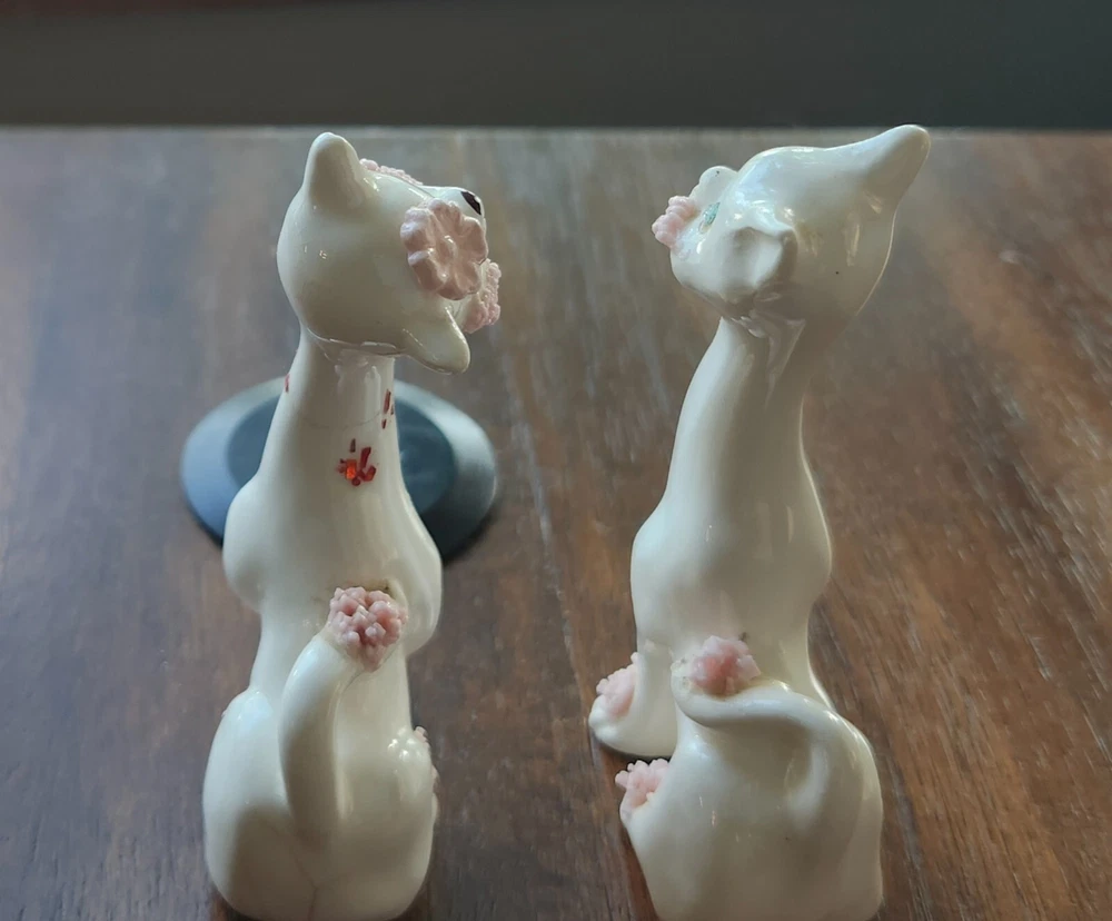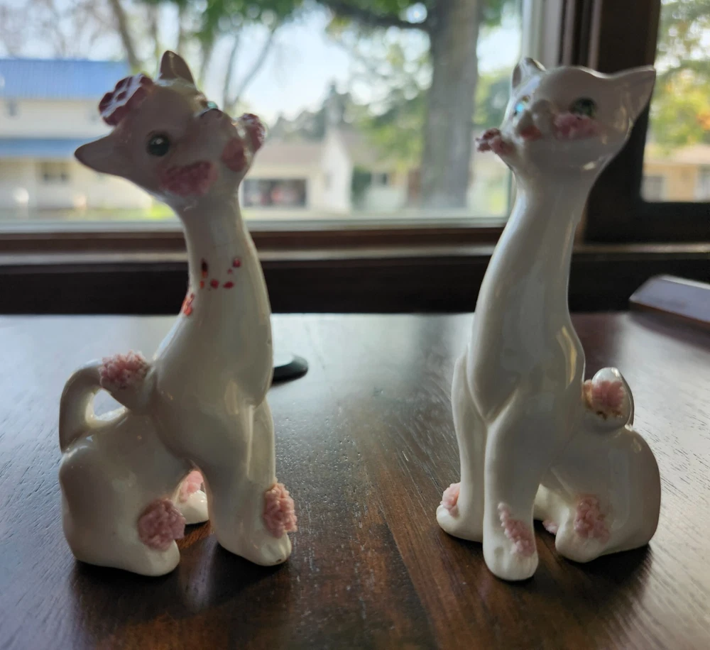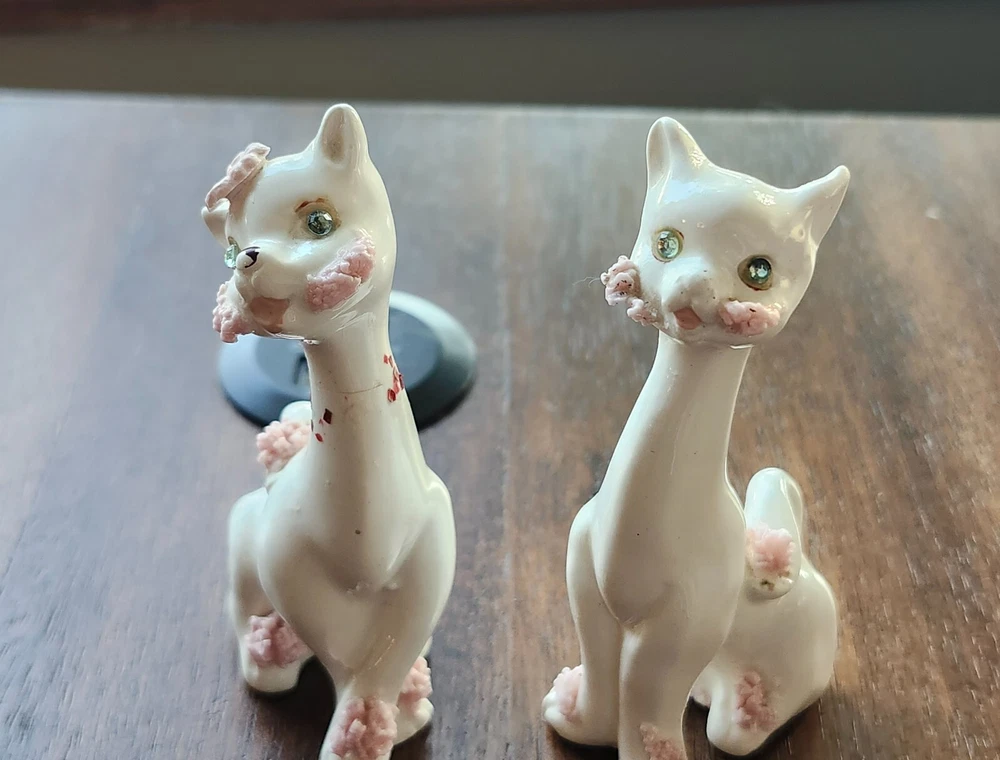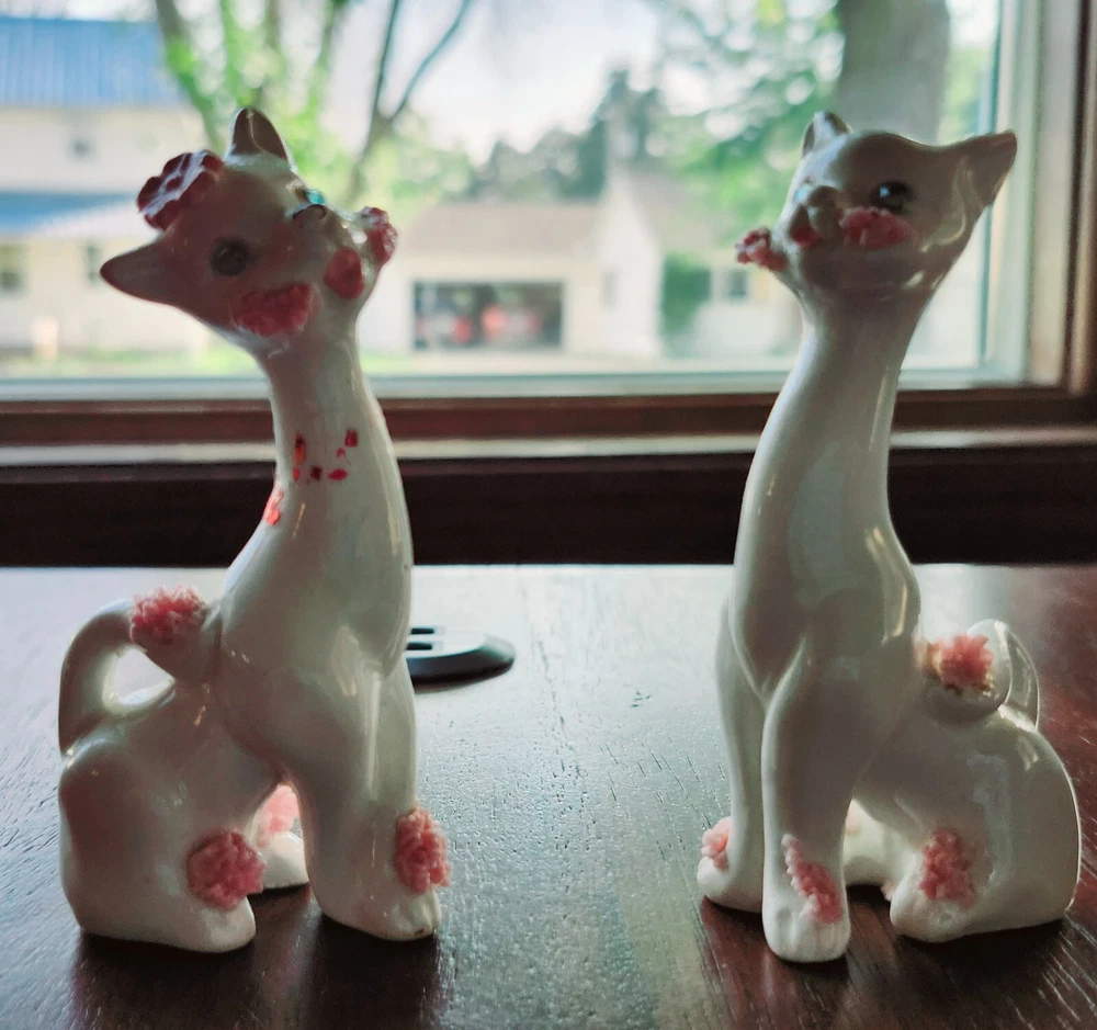 Super cute pair of hand painted porcelain pink and white spaghetti kitty cat figurines. 3.5 in tall