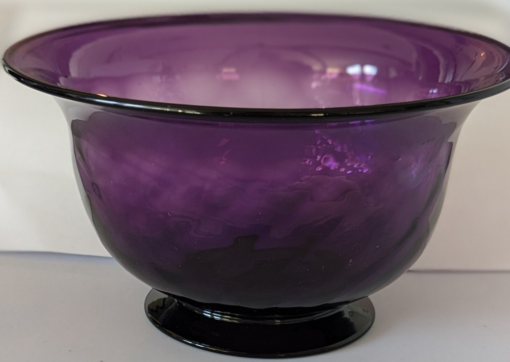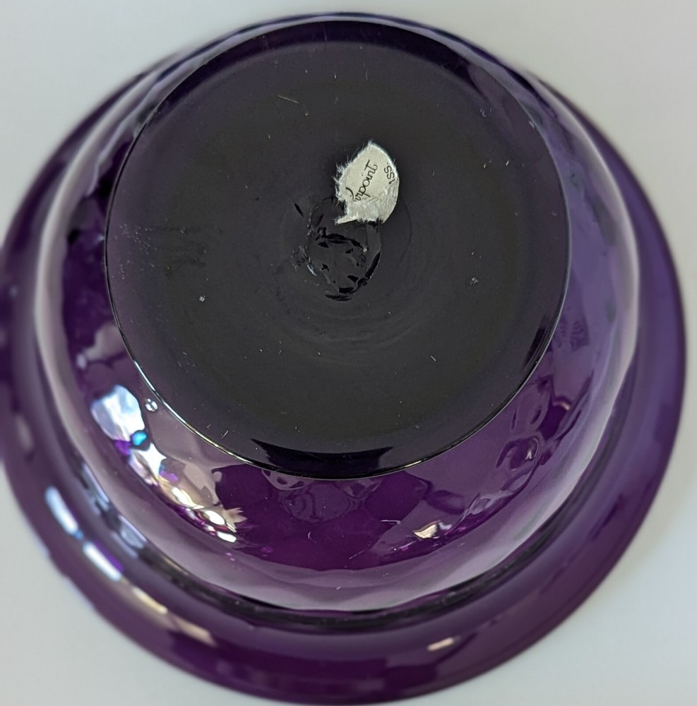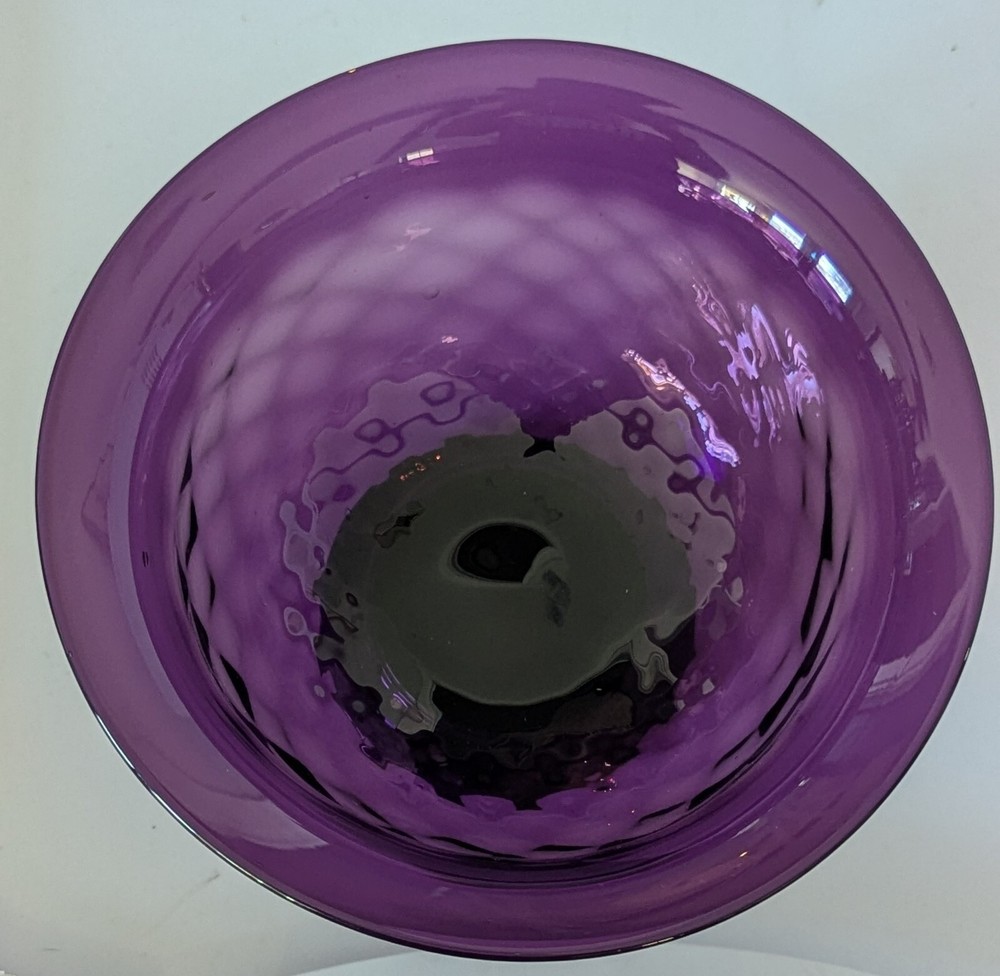 No chips or cracks. Slight shelf ware on the base. Remnants of the original Pairpoint label remain. Pairpoint Diamond Pattern Deep Amethyst Footed Bowl Pedestal 4" Tall 7.5" Dia.