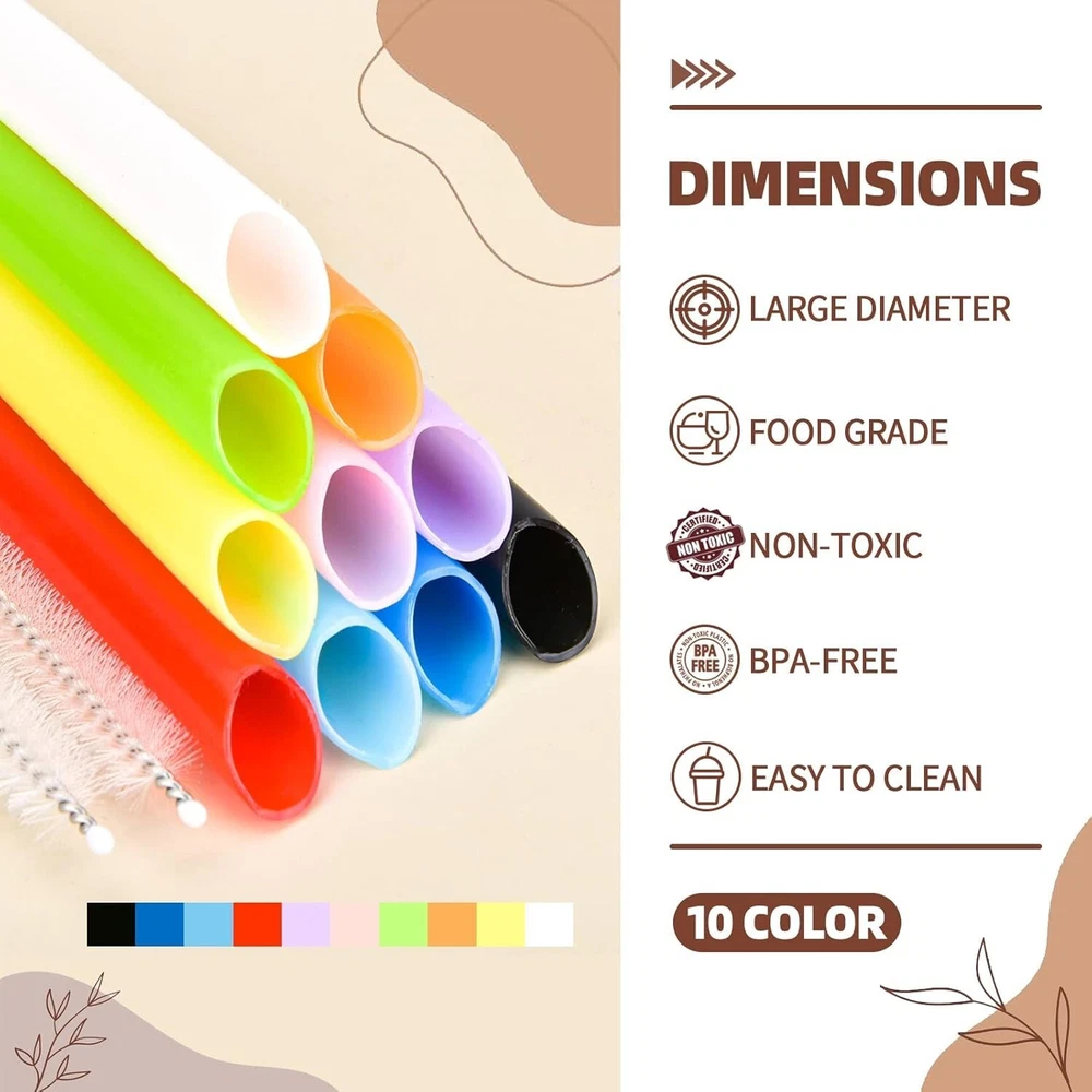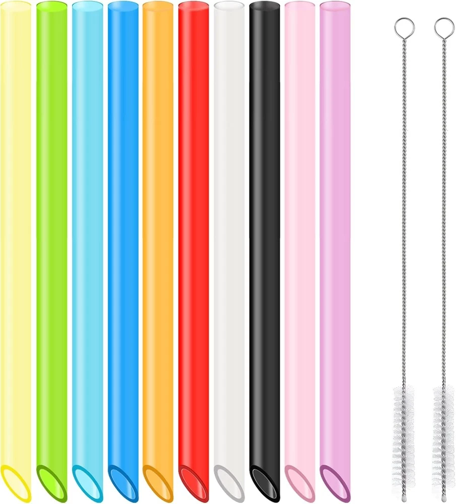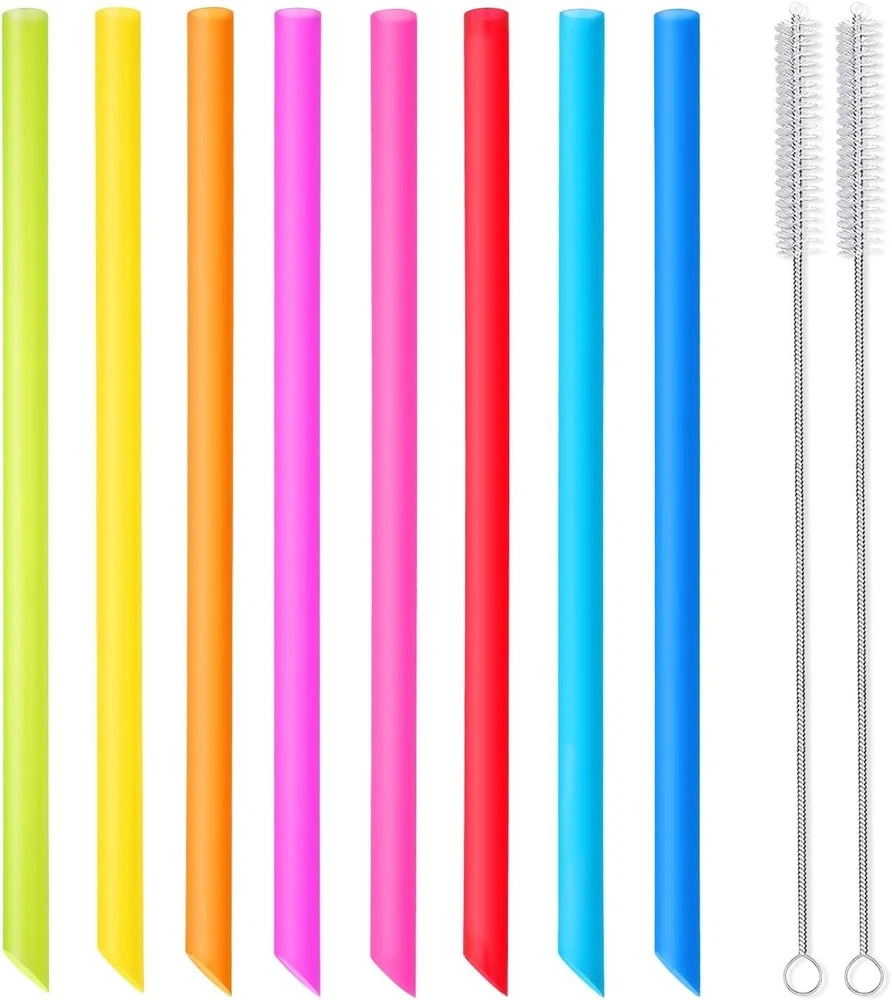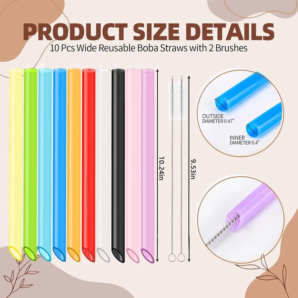 Model 2 BRAND NEW FOOD-GRADE & BPA FREE MATERIAL - Distinguish from disposable straws, we use reusable straws many times every day. In order to guarantee safe drinking, Hiware do our best to use healthy and non-toxic food grade materials, please feel free to use them in hot or cold beverage. BEST SIZE FOR BOBA & SMOOTHIES - 8 pcs multi-colors straws + 2 cleaning brushes. 10.5" long and 0.4 Inner Diameter / 0.47 Outside Diameter. Extra wide straws are the best ideal size for fat boba/bubble tea (tapioca pearls, boba pearls), frozen smoothies, thick milkshakes, jelly, jumbo drinks and more homemade thick drinks [UPGRADED] - ANGLED TIPS - We have summarized many dissatisfaction from customers who have bought boba straws without angled tips. Hiware upgrades reusable plastic straws with angled tips that helps puncture the tops of bubble tea THICK PLASTIC & DISHWASHER SAFE - Besides food-grade material, these smoothie straws are made of thick bpa-free plastic. Dishwasher safe and hand washing efficiently with 2 cleaning brushes 100% SATISFACTION SERVICE - We believe that our high quality reusable straws will exceed your expectations. If you're not completely satisfied simply, don't hesitate to contact us and we will offer you a satisfied solution within 24 hours Model 1 Food-Grade & Bpa Free Material - Distinguish from disposable straws, we use reusable straws many times every day. Angled Tips - Pointed mouth design, make you very convenient when drinking Boba milk tea and smoothies, also the angled tips helps you puncture the tops of bubble tea Best For Boba & Smoothies - Approx 10 Inch Length and 0.4 Inch Inner Diameter / 0.47 Inch Outside Diameter. Extra Wide Reusable Smoothie Straws, Great for Bubble Tea, Boba Tea (tapioca pearls, boba pearls) ,thick Milkshakes and more homemade thick drinks. Easy To Clean : Wash the bubble tea straws easily with the long straw brush cleaners included in your package to keep the straws clean and hygienic after each use. Get the food remnants out by easily sliding the brushes in and then rinsing. The dishwasher safe materials makes it convenient and time saving. 100% Satisfaction Service - We believe that our high quality reusable straws will exceed your expectations. If you're not completely satisfied simply, don't hesitate to contact us and we will offer you a satisfied solution within 24 hours THANK YOU