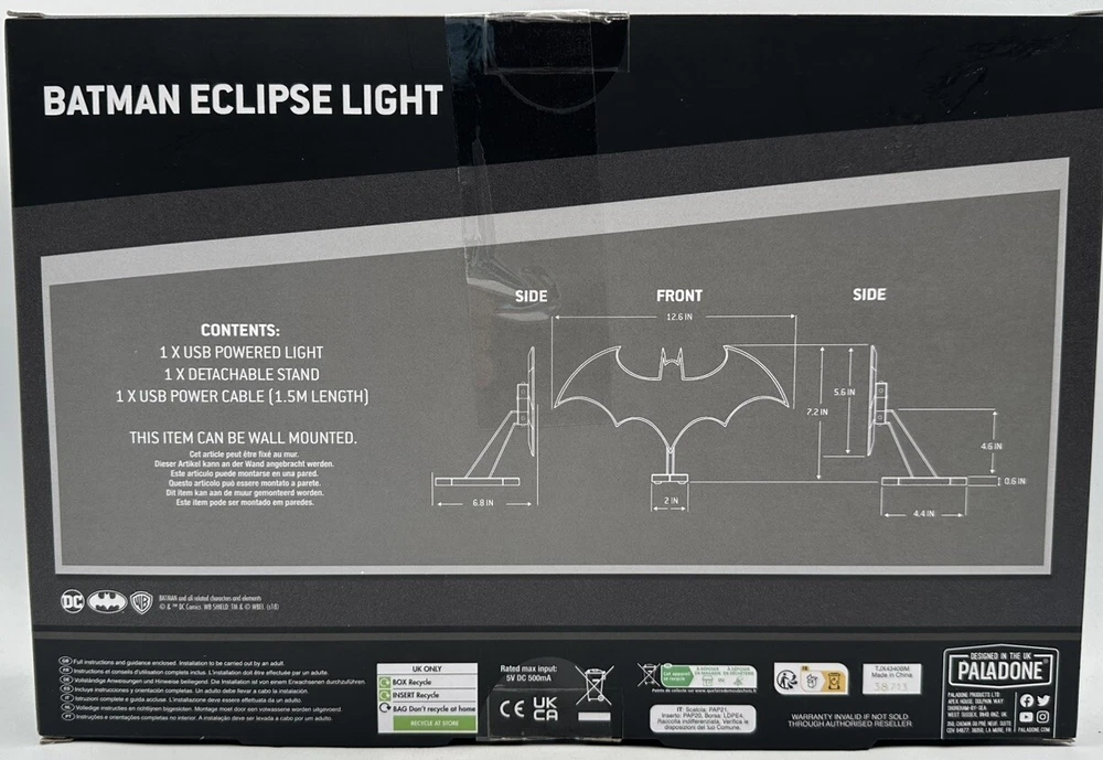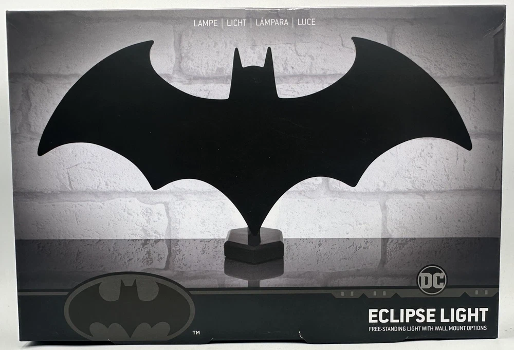 This Paladone DC Batman Eclipse Light is a free-standing or wall-mounted light featuring the character Batman. It is part of the Batman franchise and is designed with a black color theme. The light is a licensed reproduction, specifically modeled after Batman, and is perfect for fans of superheroes and comic books.