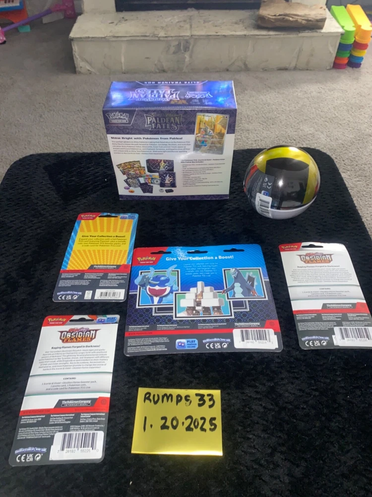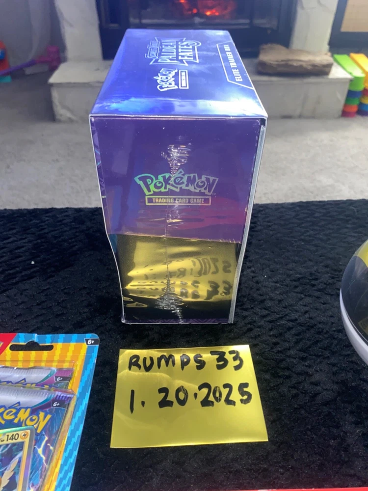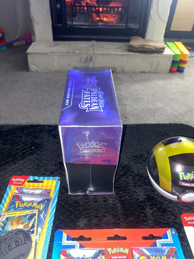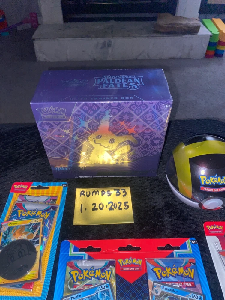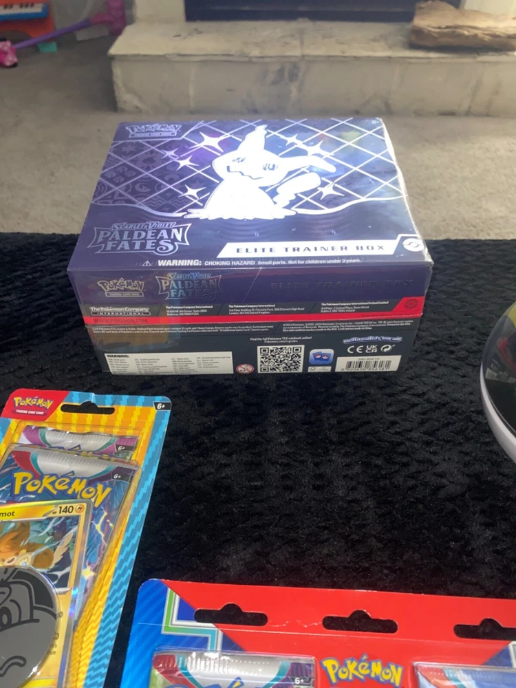 Everything in photo The Paldean Fates ETB Elite Trainer Box contains 9 packs of sealed Pokémon cards from the Scarlet & Violet set, featuring the character Mimikyu. This box includes over 90 cards and is part of a lot that includes 5 additional boxes. Manufactured in 2023 by Nintendo in the United States, these English-language cards are made of card stock and are suitable for ages 6 and up. This Pokémon TCG collection is ideal for fans looking to expand their card collection with a variety of cards in standard size.