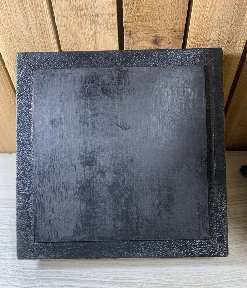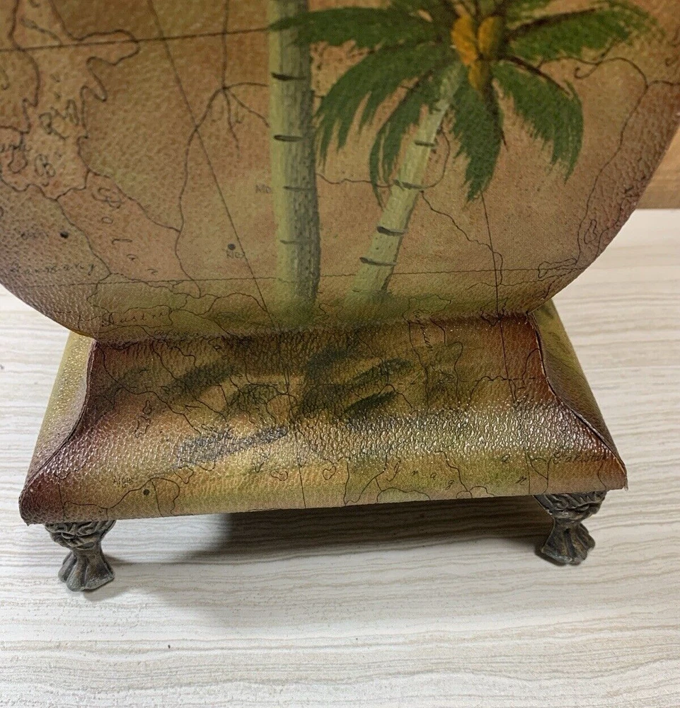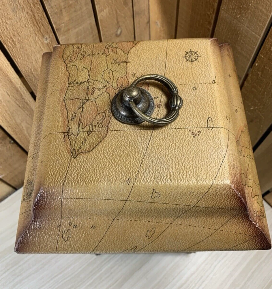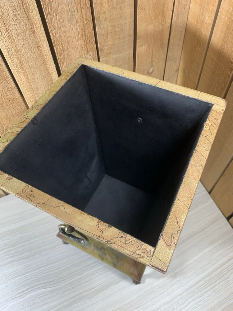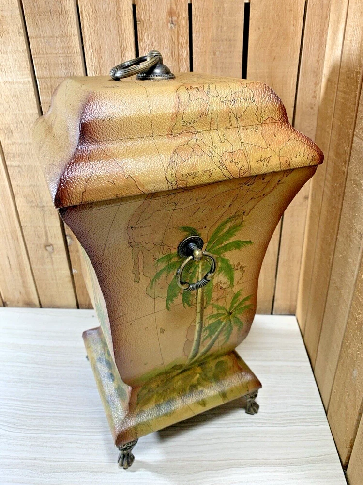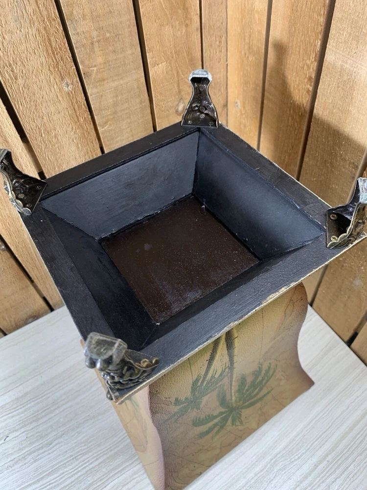 Palm Tree Tropical Wood Footed Trash Can Storage Container with Lid Approximately 15" tall, 8" square at the widest point, 8.75" deep and weighs 4 lbs 9 oz. This is wood with a covering over it that shows a map in the background and palm trees. It has a handle on the lid and on 2 sides. It is in good shape with light normal wear, mainly on the edges, from age and use as seen in the photos. Please see all photos as they are part of the description. We try to list as many details as possible, however some items are vintage and pre-owned so flaws are to be expected. We try to find out as much information as possible on each item we have available. On occasion we may make a mistake and appreciate your feedback.