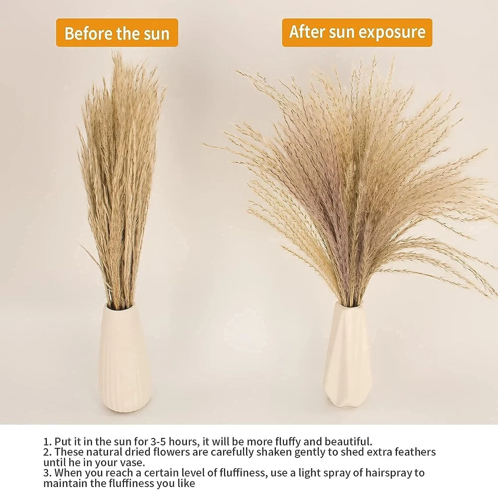CAREFUL SELECTION: All stems in this pompas grass are natural dried plants and carefully selected by us. special faux pampass grass bundle manufacturing technique ensures superior quality, and dried pompous grass lasts up to three years.(without pampas grass vase) VARIOUS COMBINATIONS: beige pampas grass dried flower bouquet contains 15 white pampas grass, 15 brown pampa grass, 10 dried bunny tails, and 25 reed grass, Approximately 17 inches in height. You can trim the overall, stem length of the pompass grass according to the size of the pot WIDE RANGE OF USES: these short pampas grass small are very suitable for home decor, wedding decoration, dried floral arrangements, boho room decor, bedroom, living room, dining room and boho vases for pampas grass, etc. you can dried pampas grass decor for wedding gifts, Halloween, Thanksgiving, Christmas, etc. WARM TIP: You can fluff the pompass grass branches natural in the sun for a few hours before use. Shedding is normal because this pampus grass is a naturally dry plant. Once placed in a vase and hairspray, the shedding will be minimal. pompas floral may have some odor, please leave pompuss grass loose in a well ventilated area for 1-2 days. Greener than artificial pampas grass SATISFACTION GUARANTEE: Your satisfaction is the only way for us to go further, we attach great importance to our customers' experience and satisfaction in buying natural pampas grass bouquet large, if you are not satisfied with mini pampas grass, please contact us as soon as possible, thank you for your support. We attach great importance to customer satisfaction and buying experience, so we pompas grass dried flowers is carefully selected before shipment and placed neatly in the shipping package to ensure that each bundle is flawless if it appears that you are not satisfied with the pompous grass received, please contact us and we will give you a satisfactory answer. Your satisfaction is the only way for us to go further. Various combinations: made of naturally dried white pompuss grass, brown pampas grass, reed grass, and rabbit tail grass. More environmentally friendly than fake pampas grass tall. Perfect size: artificial pampas bouquet is about 14-17 inches, You can trim the length of the poles to your liking and simply add style to any home, event or retail space. Wide range of uses: small pampas grass decor are perfect for wedding bride decorations, bohemian home decorations, baby bathroom centerpiece, bridal gifts, kitchen tables, dressing rooms, dining rooms, living room tables, offices, farmhouse decorations, party gardens, balconies and more to create a warm and natural atmosphere. Note: Take out the mini cream pampas grass, pompass grass branches may be crushed and not fluffy during the long distance transportation. Leave the pampas grass bulk in the sun for a few hours and dried short pampas grass will regain its fluffy state. Apply hairspray and the shedding will be minimal.