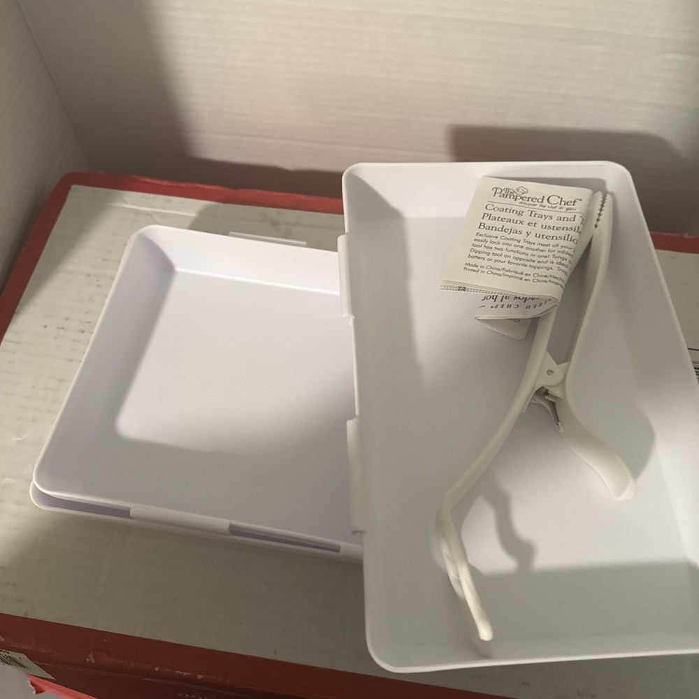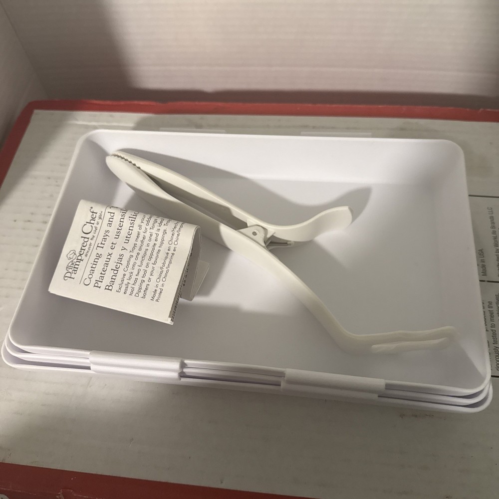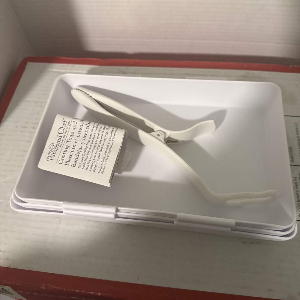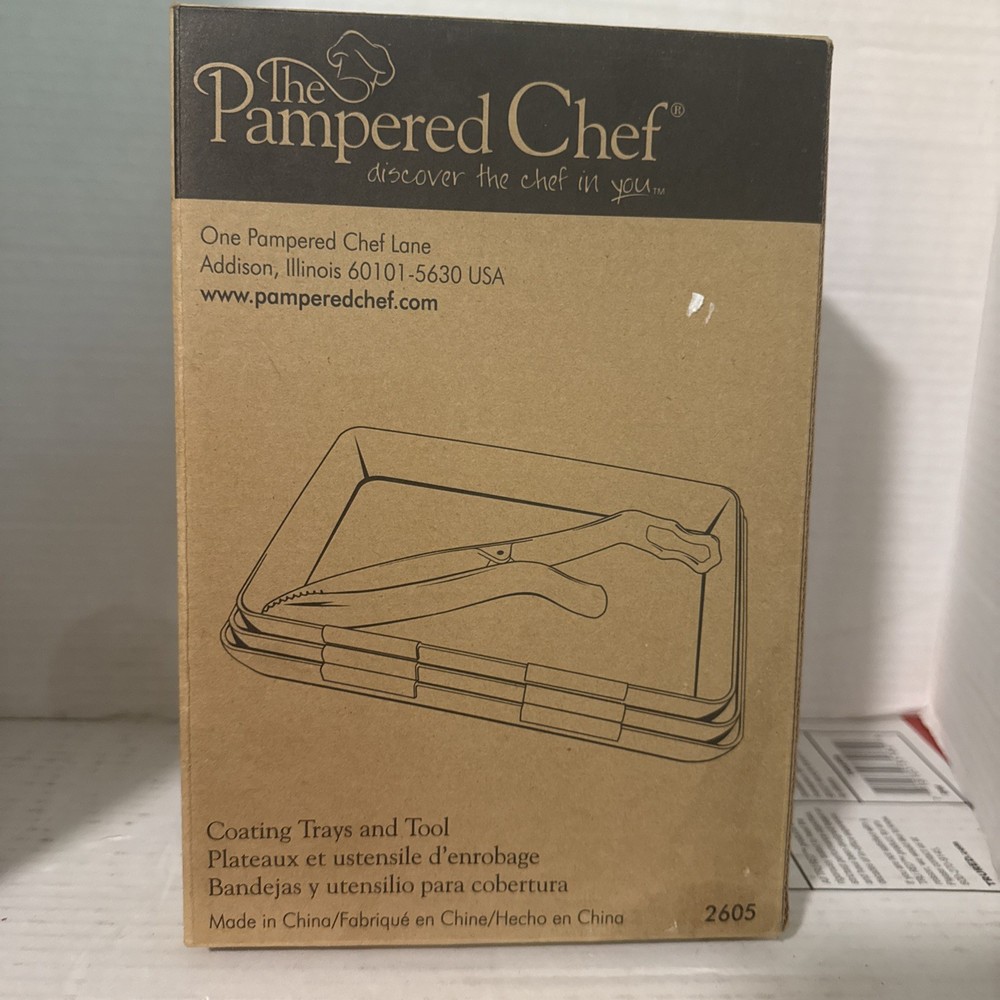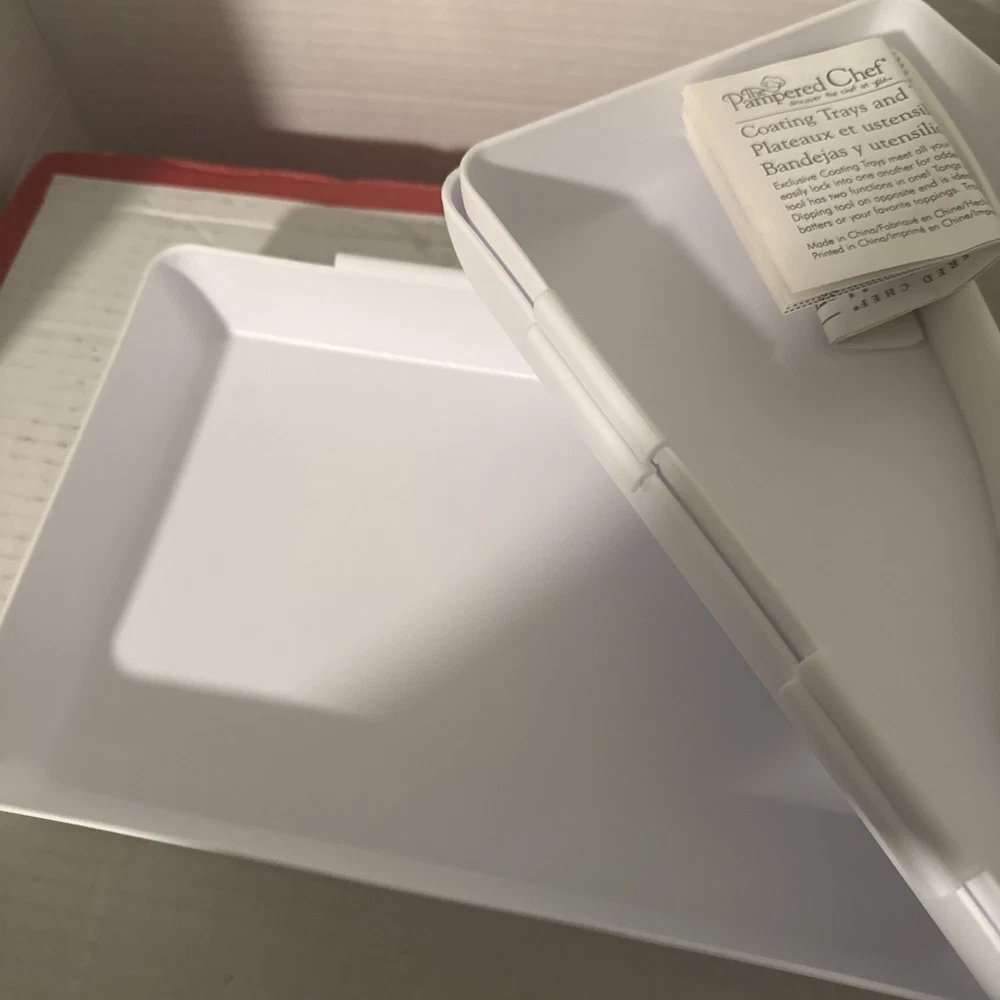 The Pampered Chef Coating Trays and Tool Number 2605 is a 4 piece set of interlocking trays designed for use in the kitchen. The trays, in a sleek white color, are perfect for organizing and storing various kitchen tools and gadgets. The set includes everything you need to keep your kitchen space clean and clutter-free. The Pampered Chef brand ensures high quality and durability, making this set a valuable addition to any home cook's kitchen tools.