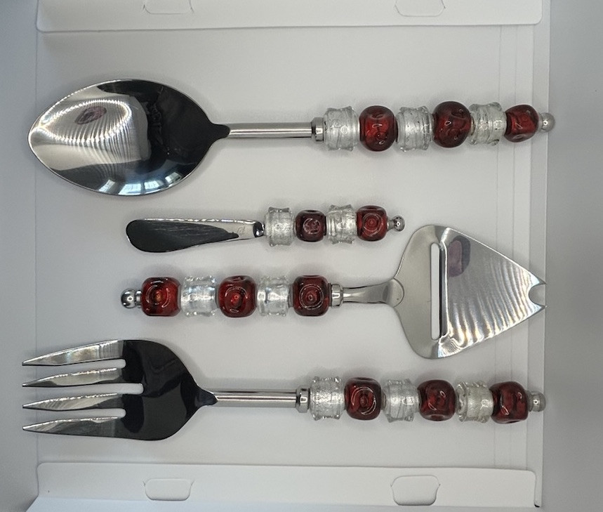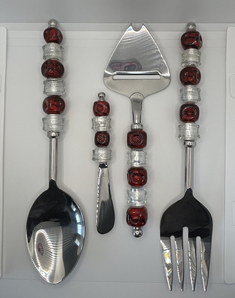 Elevate your holiday table settings with the Pampered Chef Beaded Stainless Steel Serving Utensils Set. This charming set of four includes spoon, and fork, pie server and cheese knife each adorned with red and silver beads that exude a festive and elegant charm. Crafted from durable stainless steel, these serving pieces are perfect for your Christmas celebrations and will complement any holiday-themed decor with their vibrant color scheme. Designed to both delight and function, these utensils are a great addition to your serving collection. The spoon and fork are perfect for serving up your favorite holiday dishes, while the cheese spreader is great for appetizers . Whether you're hosting a formal dinner or enjoying a casual meal with family, this set brings a touch of holiday cheer to every table setting.