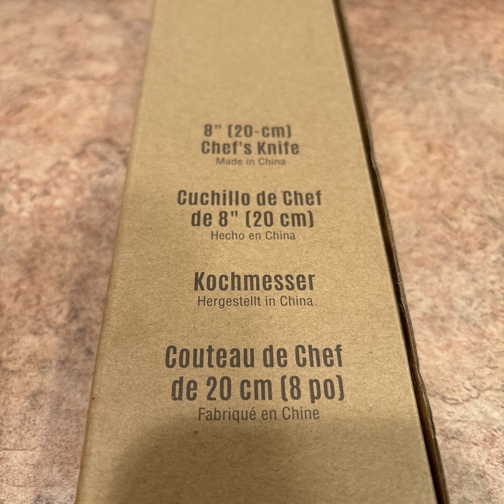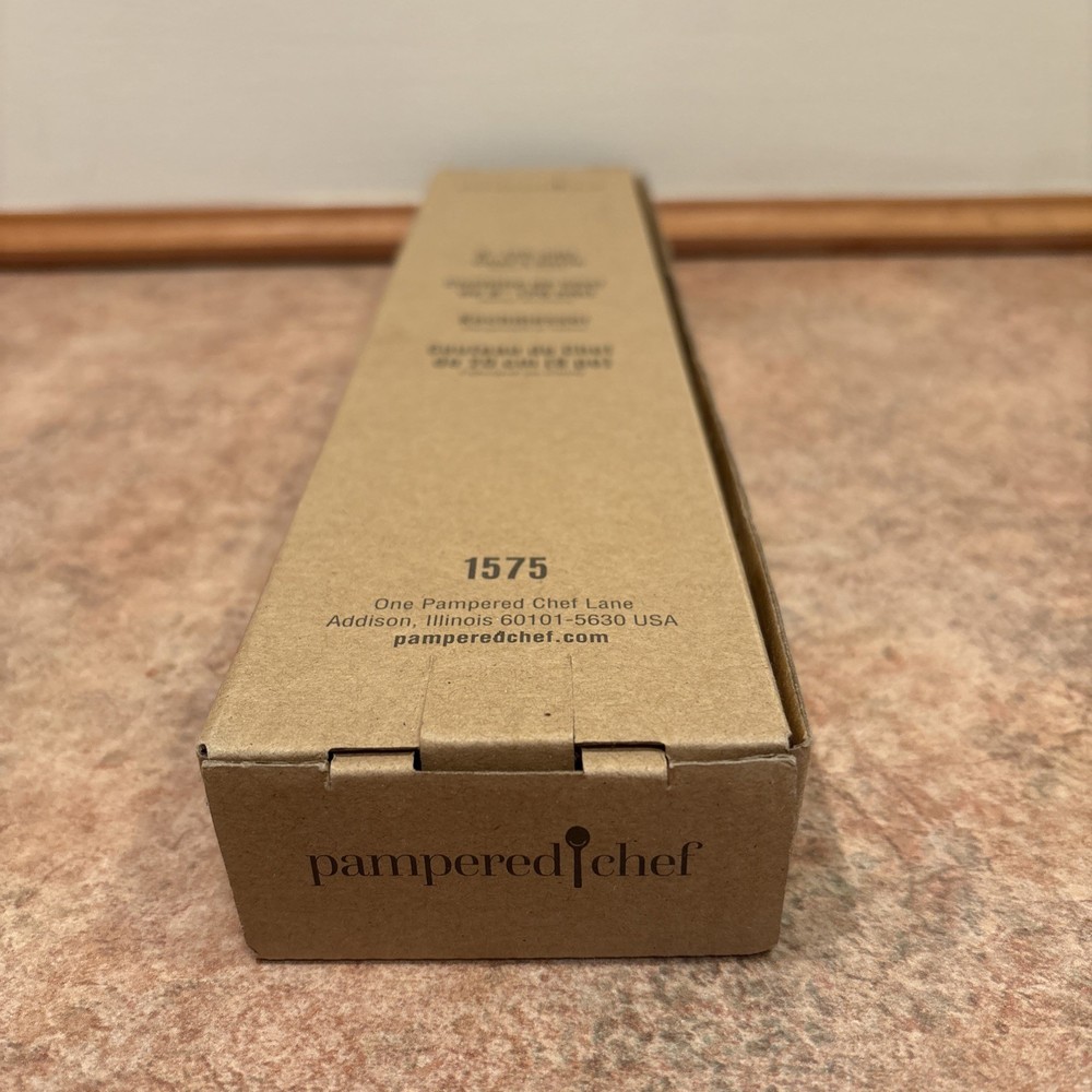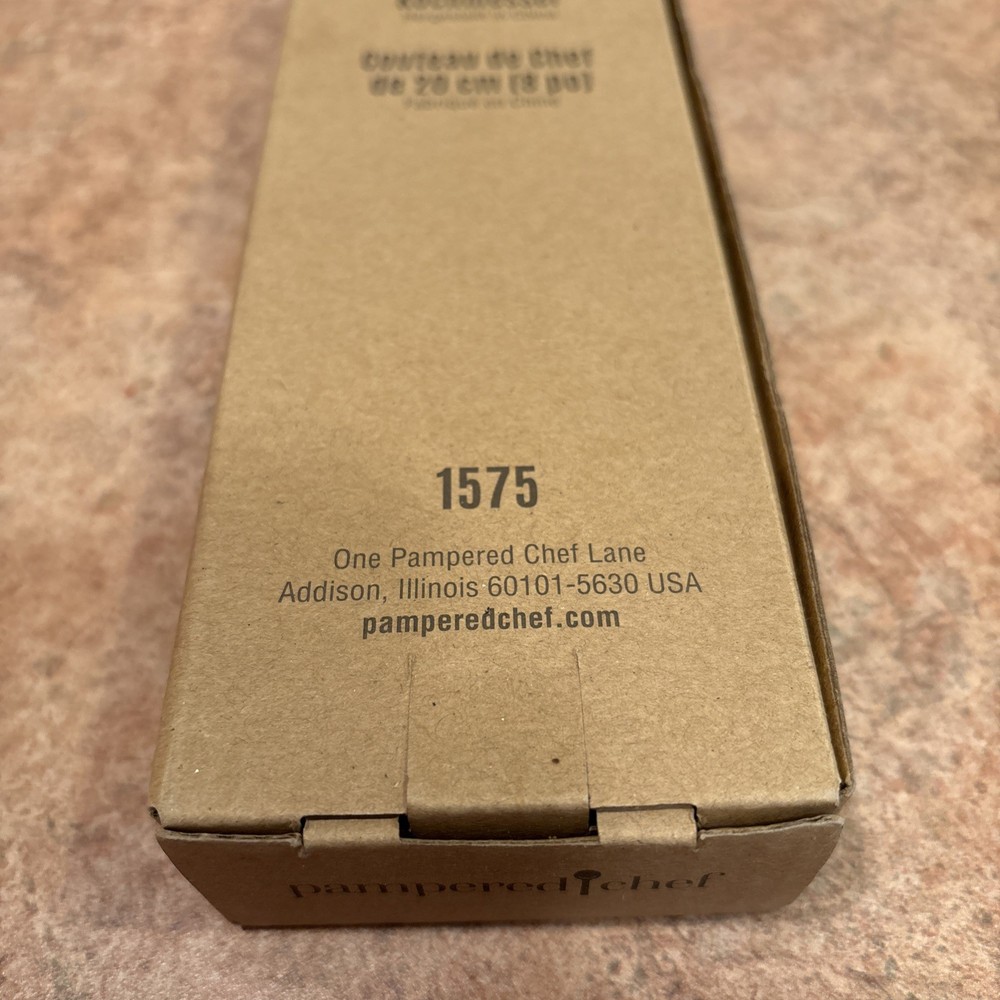 This product is a brand new, sealed Pampered Chef 8" Chef's Knife. It is a high-quality, silver-colored knife made of metal, perfect for any kitchen. The set includes one chef's knife with a blade length of 8 inches, ideal for a variety of cutting and chopping tasks. This chef's knife is a versatile and essential tool for any home cook looking to elevate their culinary skills.
