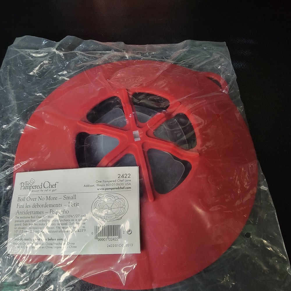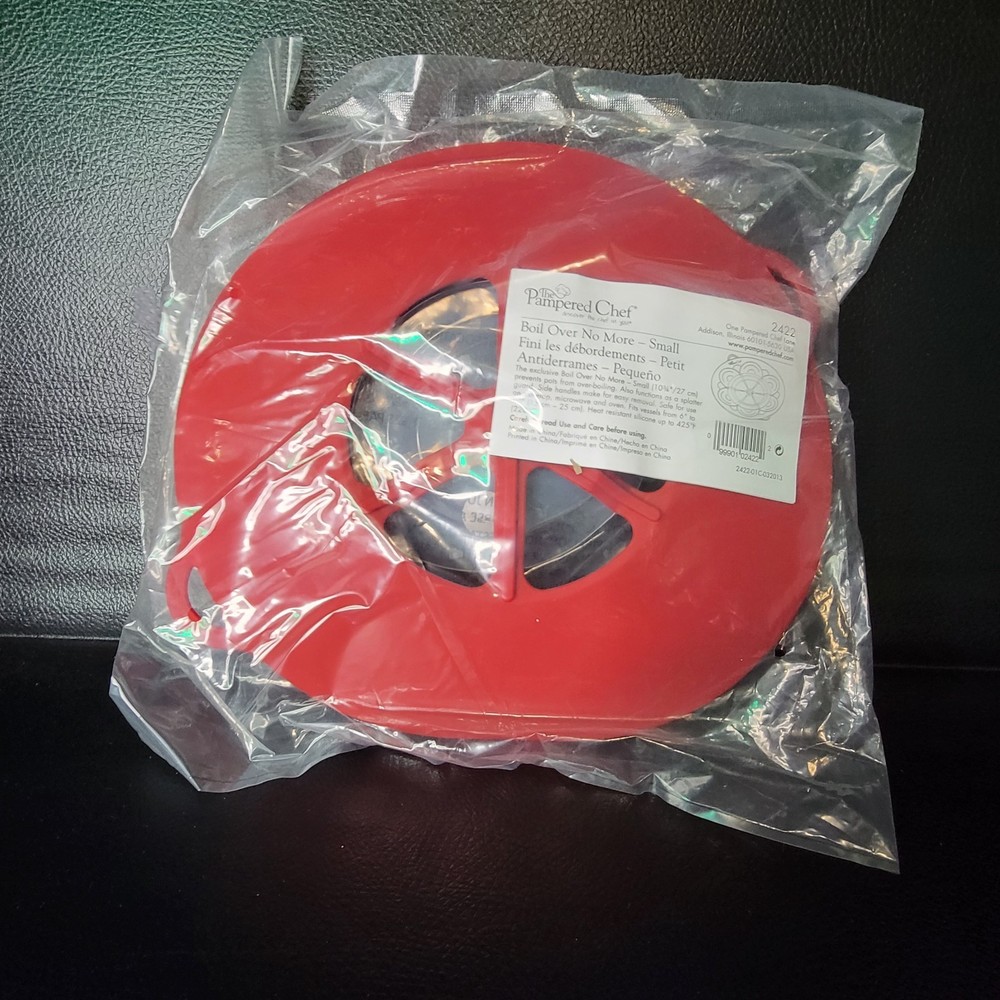 The Pampered Chef Boil Over No More in small size is a silicone splatter guard designed to fit pots, pans, and microwave-safe dishes. It is red in color and features the model number 2422. This kitchen gadget from China helps prevent splatters and messes when cooking or reheating food in the microwave, providing a convenient and practical solution for home chefs. Pampered Chef is a well-known brand known for quality kitchen tools and accessories.
