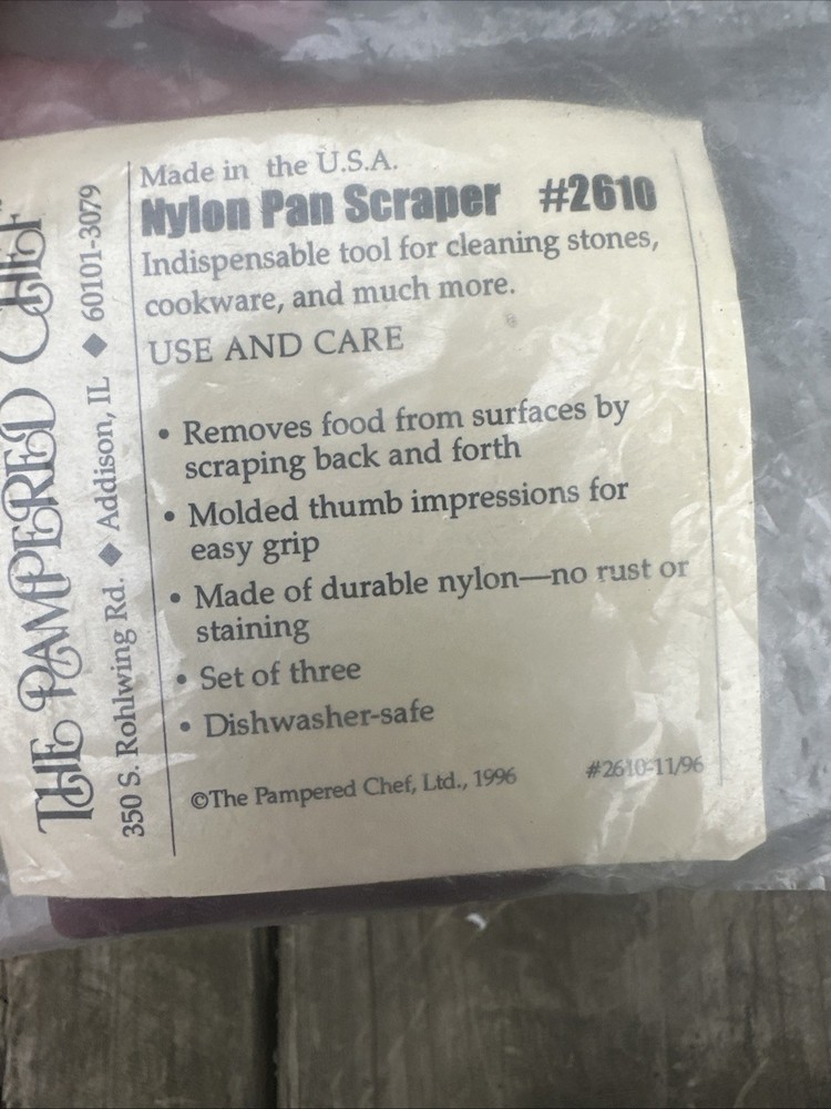 The Lot 3 Pampered Chef Brown Nylon Plastic Pan Scrapers are essential kitchen tools designed for easy clean-up. Made by the trusted brand Pampered Chef in the United States, these pan scrapers are durable and efficient. The brown nylon material ensures easy cleaning of stoneware dishes, making meal prep a breeze. Perfect for keeping your kitchen tidy and spot-free, these pan scrapers are a must-have for any cooking enthusiast.
