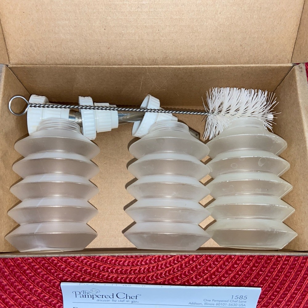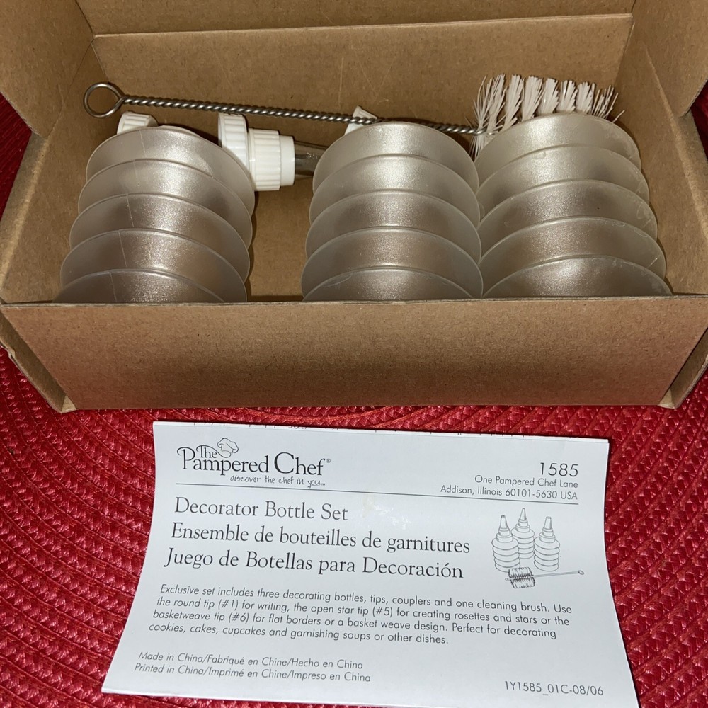 Elevate your baking artistry with the Pampered Chef Easy Accent Decorator Bottle Set #1585, a must-have for both amateur bakers and seasoned pastry chefs. This set, presented in a crisp, clear plastic body, comes with three versatile decorating bottles that are perfect for adding a touch of elegance to cookies, cakes, and other confections. Crafted for convenience and ease of use, this decorating set is designed to help you create intricate designs and patterns with ease. With its model number 1585, it's a testament to the quality and innovation behind the Pampered Chef brand. Whether you're gearing up for a special event or simply indulging in a love for baking, this set will be a cherished addition to your kitchen toolkit.