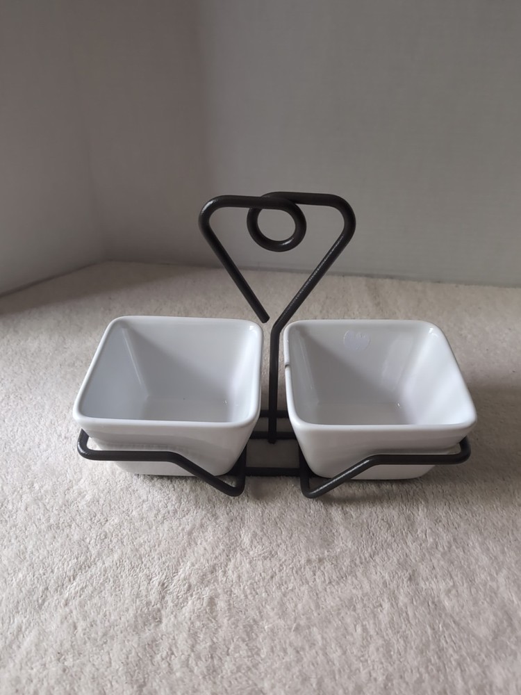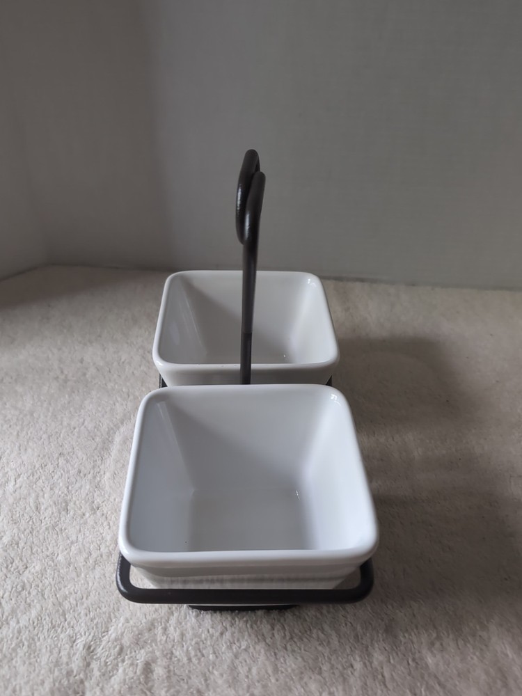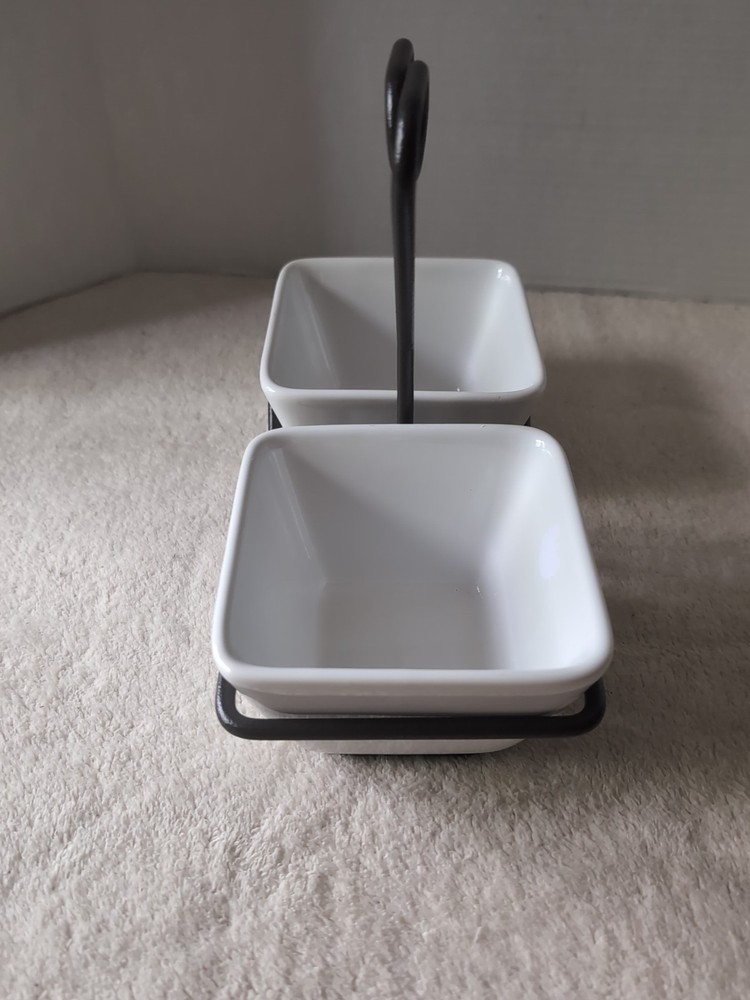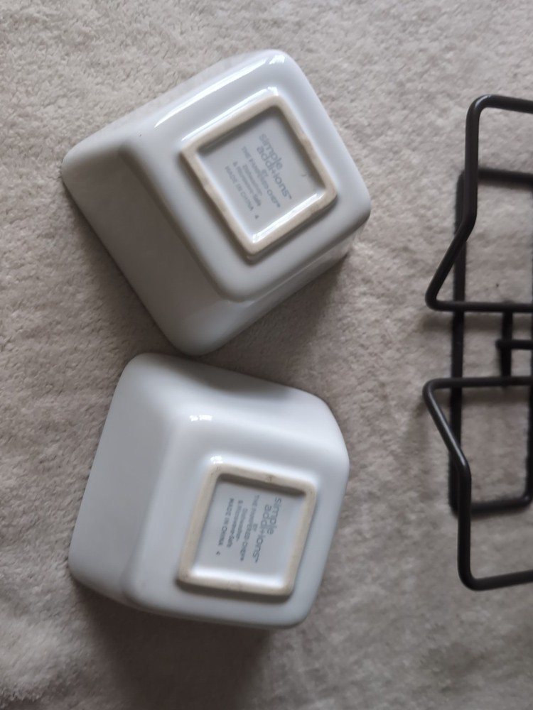Personalize:NoOriginal/Reproduction:OriginalNumber of Items in Set:Three-PieceType:Dipping BowlsColor:WhiteModel:Pampered Chef Simple AdditionsMaterial:Metal and CeramicBrand:Pampered ChefItem Height:10 inStyle:ContemporaryDepartment:AdultsItem Weight:2 lb 13 ozItem Depth:3 inOccasion:All OccasionsPattern:SolidItem Width:4.5 inCountry of Origin:ChinaShape:Square