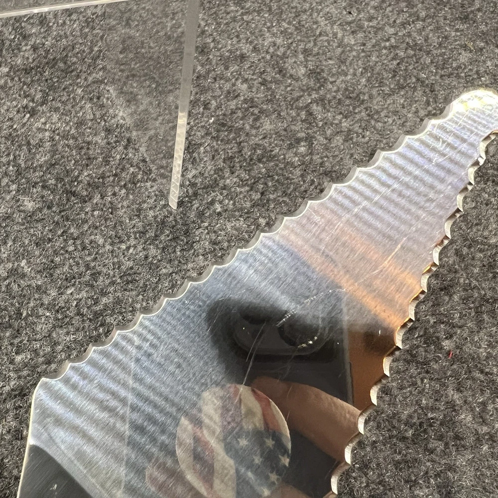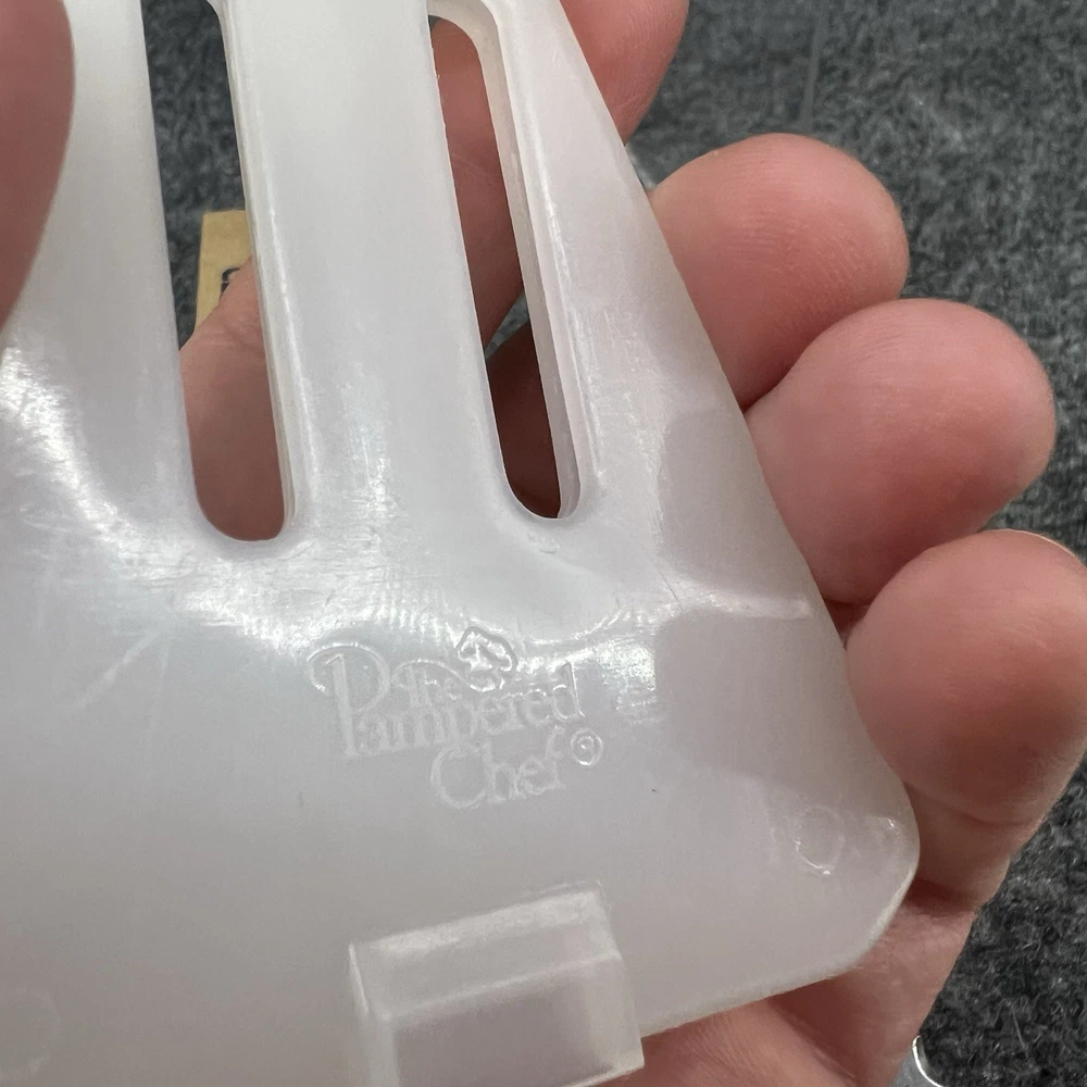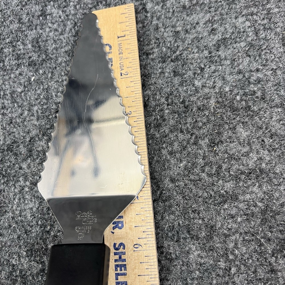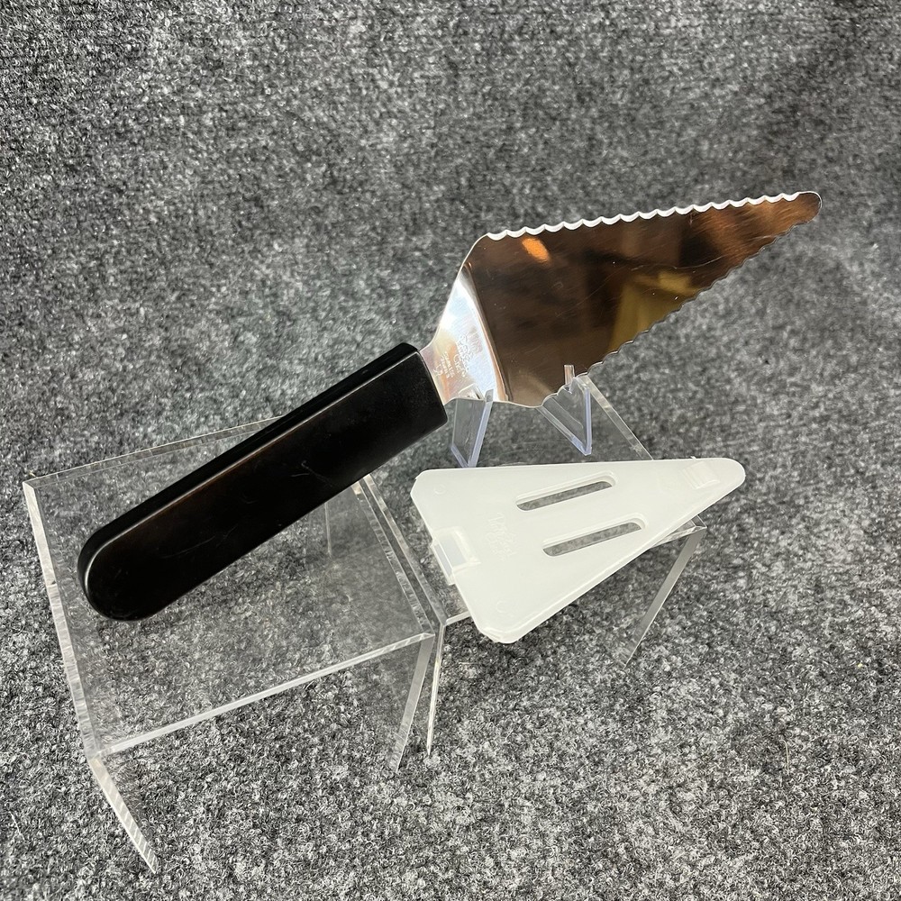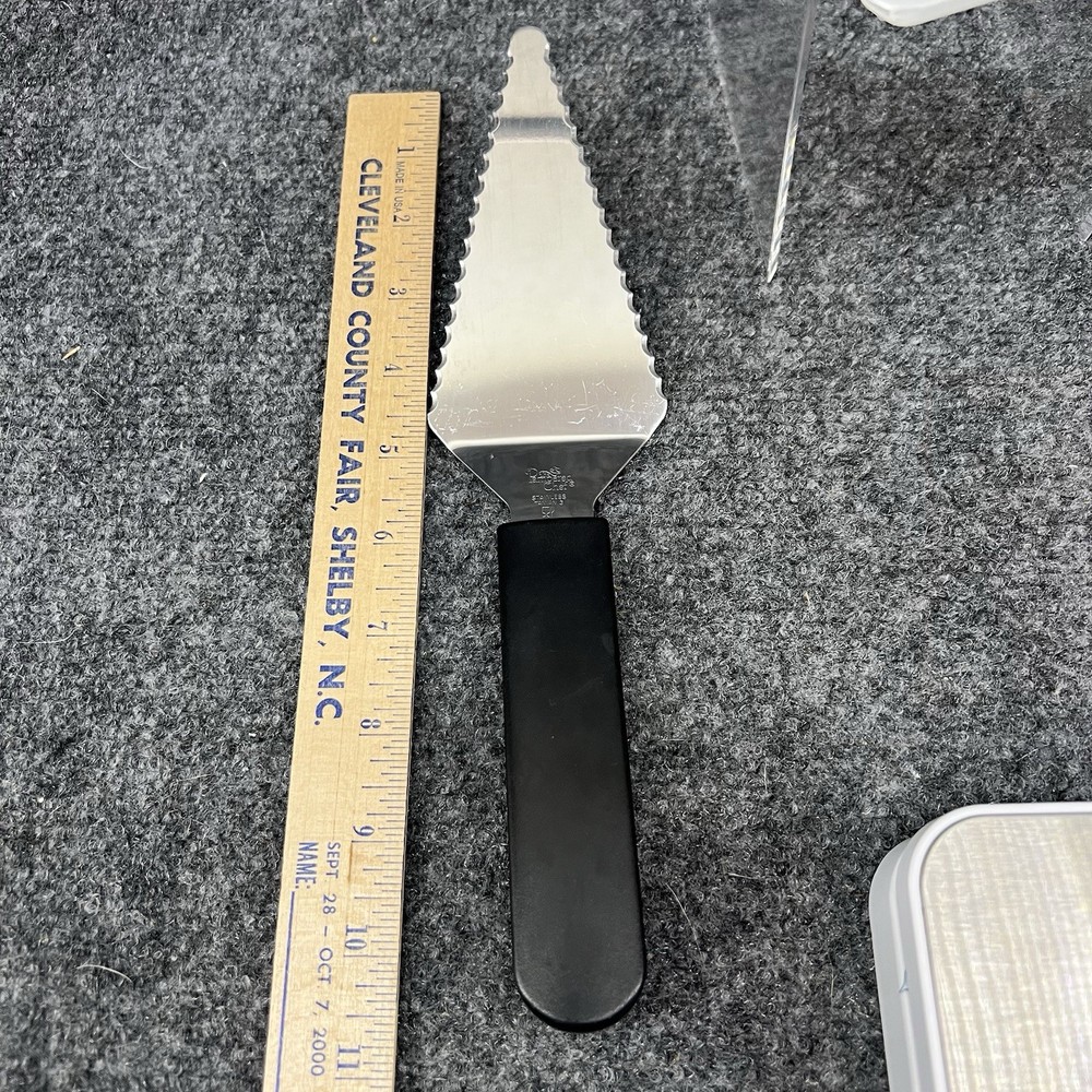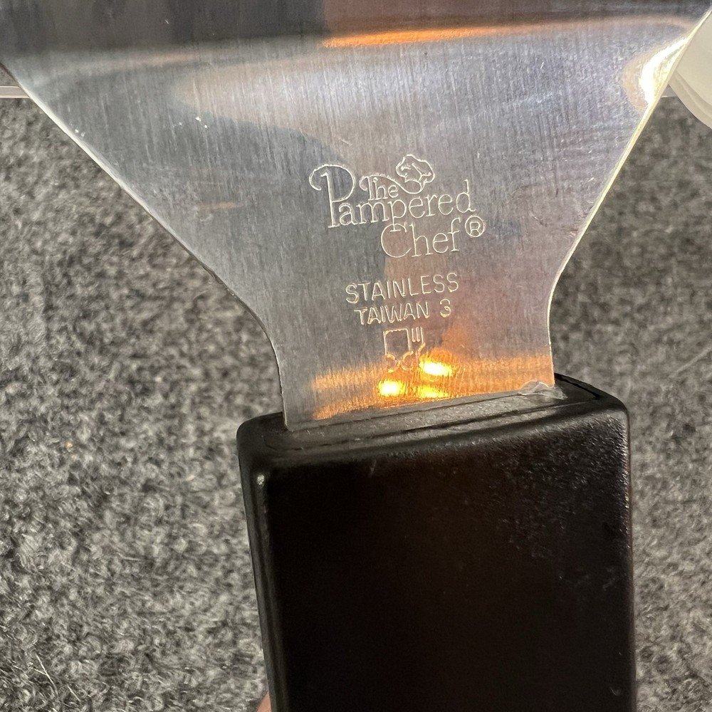 Preowned Pampered Chef Slice-N-Serve Serrated Pie Server w/storage sleeve. The server measures approximately 11” total with the actual silver pie server portion measuring approx. 5” long x 2.5” wide at its widest point. The handle measures approximately 5” long also. There are some wear/use marks on it but it still has plenty of use / life left. Please refer to the pictures for further. Will be shipped to you in a plastic bag (for protection from the potential elements) inside of a poly bag as that’s the cheapest way to get it to you.