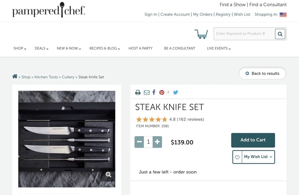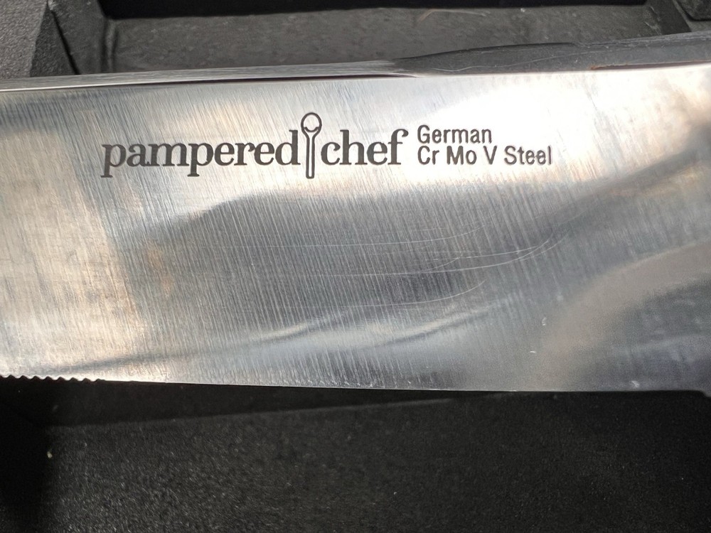 The Pampered Chef Steak Knife Set includes four black knives made of stainless steel and plastic materials. These knives are designed for easy cleaning this set is perfect for those looking to upgrade their kitchen tools with high-quality, durable knives ideal for cutting through steaks with precision and ease. Only two of these knives have ever been used just a handful of times Excellent sharp like new condition Box is also in excellent condition