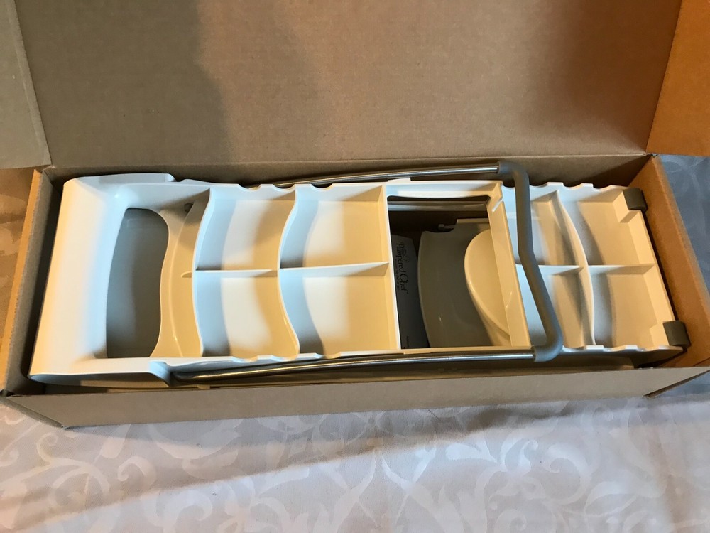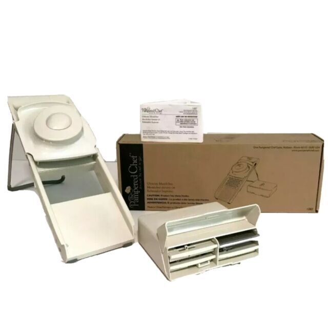 Experience the versatility of the Pampered Chef Ultimate Mandoline 1087, an essential addition to your kitchen arsenal. This multi-functional food slicer comes complete with four interchangeable blades, allowing you to grate cheese, slice fruit, vegetables, meat, and salad with ease. Its robust plastic construction ensures durability, while the non-stick surface makes for effortless food release and cleanup. The unit's lightweight design, coupled with comfortable handles, enables quick and safe operation. The adjustable thickness settings provide control for your desired slicing results. Additionally, the included stand offers stability for the slicer, and the dishwasher-safe components make maintenance a breeze. Model 1087 is a retired collectible, ensuring you've acquired a piece of culinary history for your kitchen.