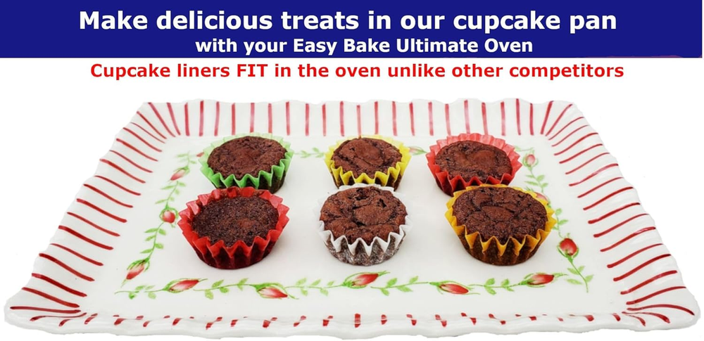 BEWARE OF CUPCAKE LINERS THAT DON'T FIT IN EASY BAKE OVEN: Our Cupcake/Muffin Paper Liners actually WORK in the oven, unlike all other competitiors. INCLUDES: Cupcake, round, rectangular pans and 60 Cupcake/Muffin Paper Liners (12 Red, 12 Green, 12 Yellow, 12 Orange and 12 White) COMPATIBLE WITH EASY BAKE ULTIMATE OVEN EDITON: Our cupcake, rectangular and round pans are fully compatible with your Easy Bake Ultimate Oven CLEANING IS SIMPLE: These small pans are simple to clean, just hand wash and towel dry after using. (NOT dishwasher safe) HIGH QUALITY STEEL: Our small pans are made with food-grade, sturdy steel. Unlike other aluminum pans which are unsafe to use. SMALL SIZE: This oven pan set is for the Kids Easy Bake Ultimate Edition and is small. They make it easy for young children to use in the toy oven. Please be aware that these are not full size, regular oven pans Product Description Deluxe Oven Pan Set Compatible with Easy Bake Oven These oven pans are designed for compatibility with the Easy Bake Ultimate Oven. This set includes everything needed for cooking your easy bake oven mixes Family Friendly!!! A needed accessory for your Easy Bake Oven. Mom, dad, grandma, grandpa, boys, and girls will enjoy. It is great for the whole family to have a fun, memorable cooking time together. Compatible with Easy Bake Ultimate Oven Cupcake liners WORK in oven Made of high quality steel Cleaning is simple Pans made for kids, not full size, regular oven pans Make tasty treats with your toddler Your kids will have fun making creations with this pan set and supplies. There are many different choices of mixes to bake. You're going to have so much fun to bake these treats. Kids love the treats Spend hours with your kids making these tiny cupcakes, cookies and small cakes. Be a wonderful baker with your kids using these real baking pans. Fun for the whole family Spend hours with your whole family making memories and building lifetime bonds while baking delicious treats. Cupcake papers make for simple cleanup Make delectable cupcakes using the included different colored paper liners. It is easy to cleanup afterwords with no mess in the cupcake tray. Use our circle shaped pan to make cakes You can use a sandwich bag for piping creative designs on your cakes. Make dots or put circles or lines around the cakes. This is a triple layer cake!!! Make delicious cookies with the baking tray Put sprinkles on the cookies to make it shimmer. Frosting also makes a great cookie topper. Add frosting and sprinkles to your cookies Fun to make tasty treats with your toddler using the Easy Bake Oven complete cooking set. They smell so good while cooking and delicious out of the oven.