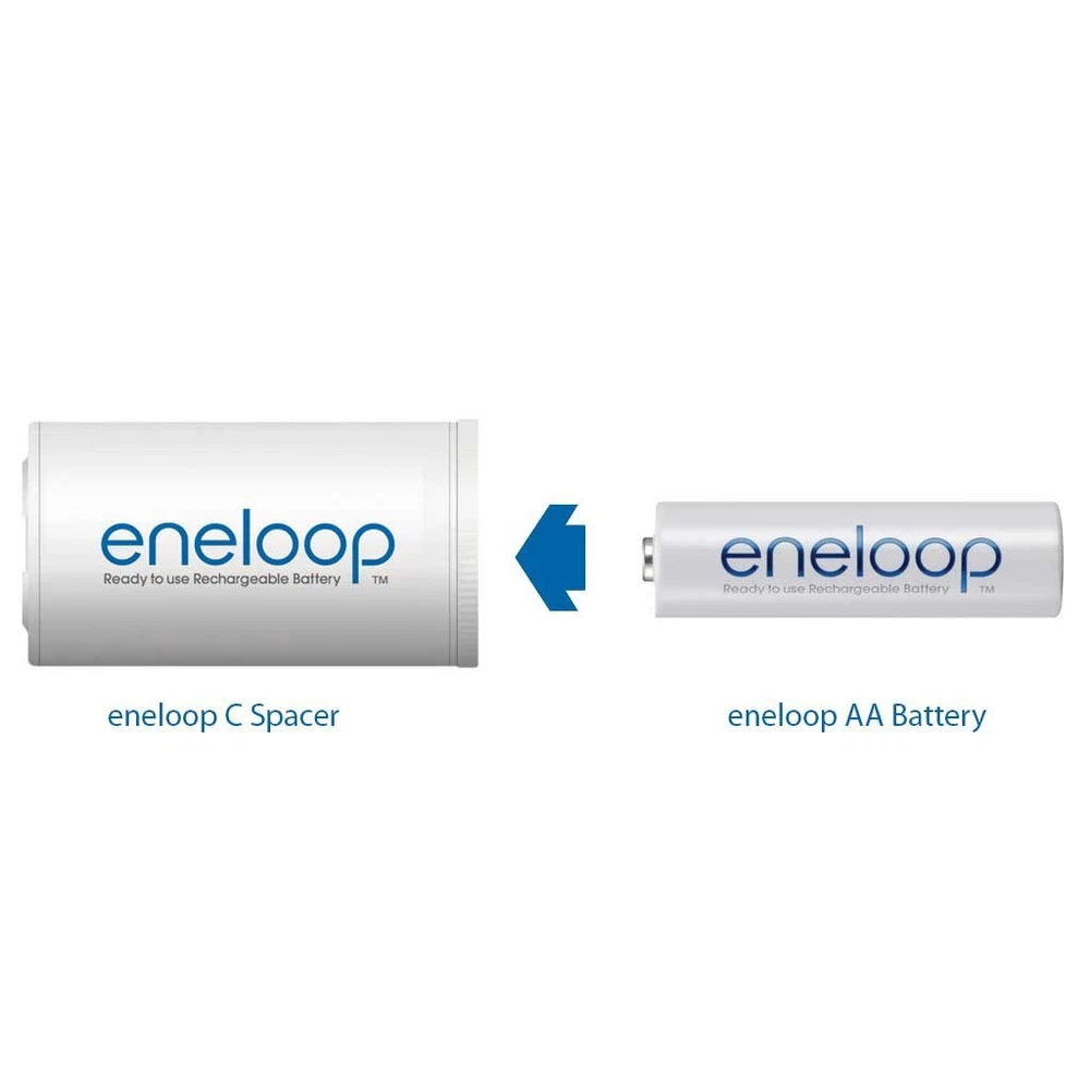 C size battery adapters are designed for use with AA rechargeable batteries. C and D size spacers allow for AA batteries to be inserted and utilized in C and D size battery applications. The battery cells maintain their original AA rechargeable battery performance characteristics including 2000mAh typical (1900 minimum), up to 2100 recharges, and will hold 70% of their charge for up to 10 years, (when not in use). These adapters are a great alternative when C and D size batteries are not available. Battery life will vary based on the application. INGENIOUS DESIGN: C size battery spacers allow AA rechargeable batteries to be inserted and utilized in C size battery applications AA BATTERY PERFORMANCE: The battery cells maintain their original AA rechargeable battery performance characteristics including 2000mAh typical (1900mAh minimum) and up to 2100 recharges COMPACT SIZE: These C size battery adapters work with AA rechargeable batteries LIGHTWEIGHT: C size battery adapters weigh only 0.35 ounces (without AA batteries installed) CONVENIENT 4-PACK: Comes complete with four Panasonic C size battery adapters shrink-wrapped together (batteries not included) JAPANESE ENGINEERING: Designed in Japan by the Panasonic engineering team