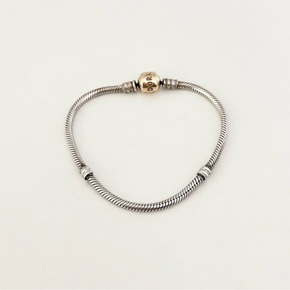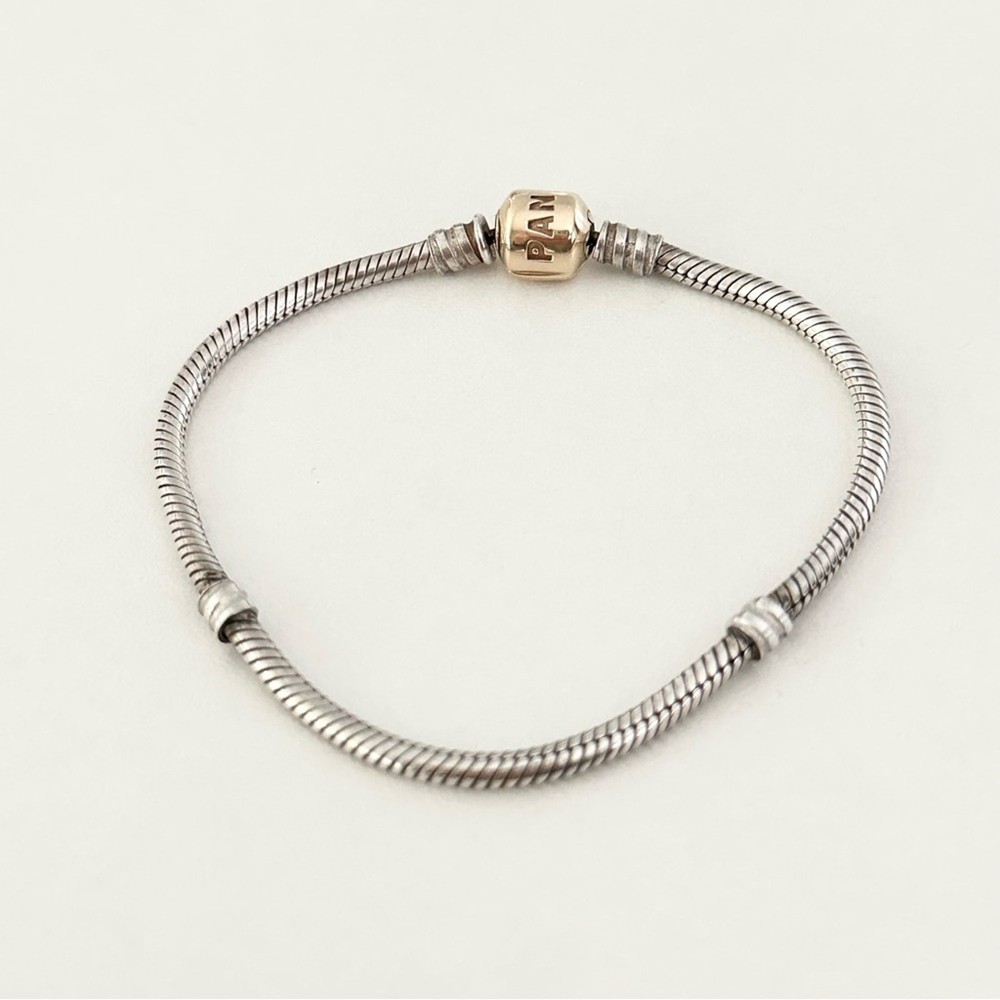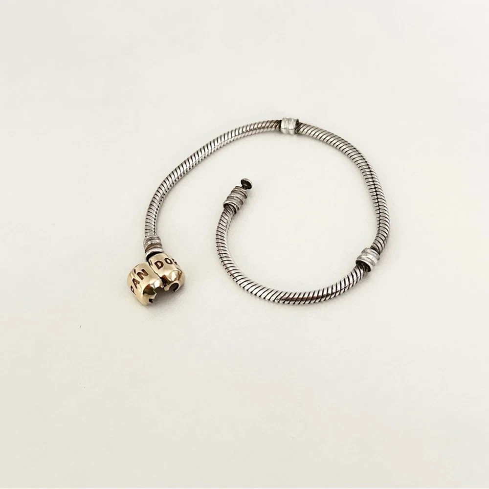 Authentic Genuine Pandora Two Tone Moments Snake Chain Bracelet •Set in sterling silver with a solid 14k yellow gold clasp •Size: 7.5" •Stamped 585 ALE •Excellent condition •Perfect to add to your Pandora bracelet collection or to gift to a friend, mom, girlfriend, daughter, wife, etc. •Please check out my other Pandora charms for sale, bundle and save on shipping! •Fast shipping! I ship same or next business day!