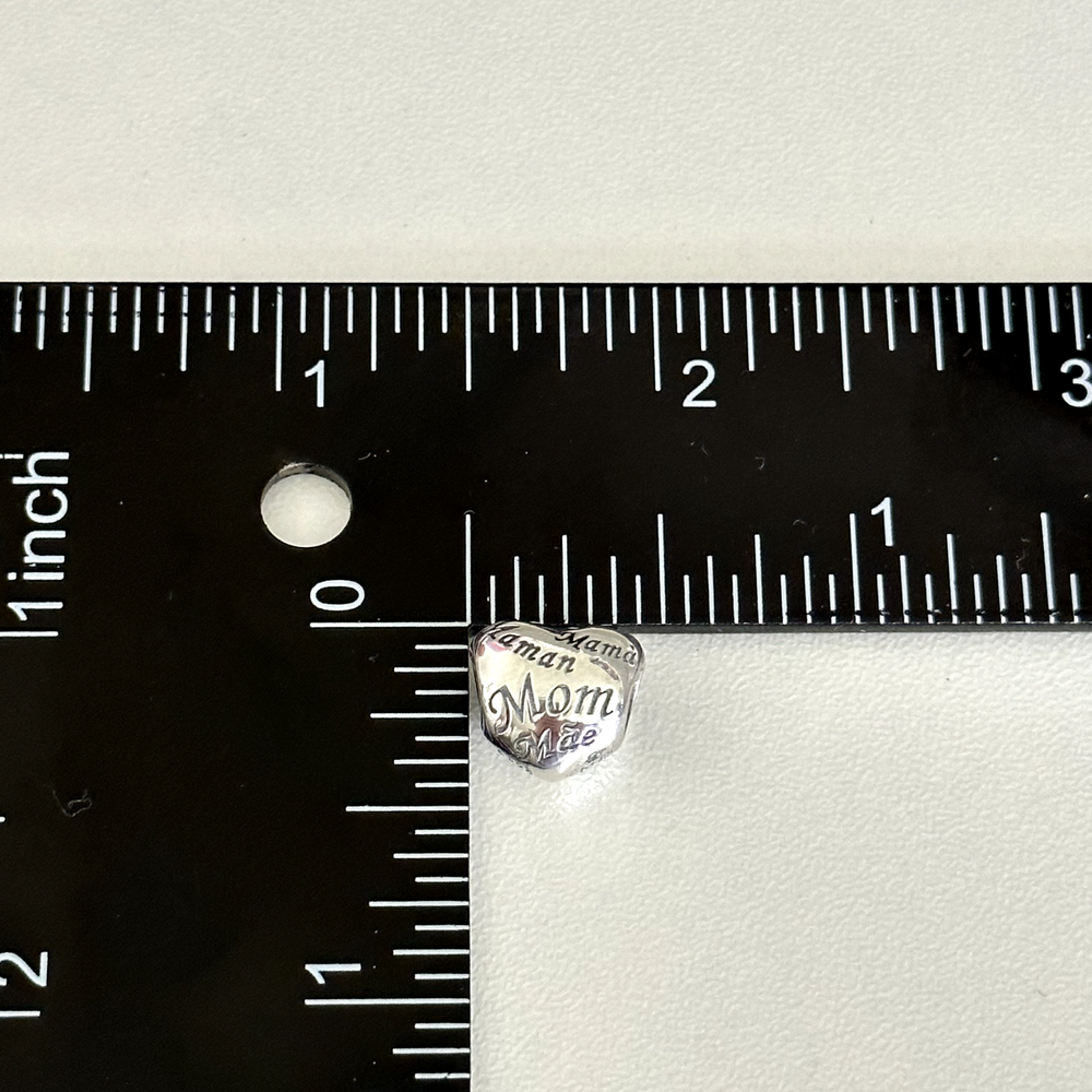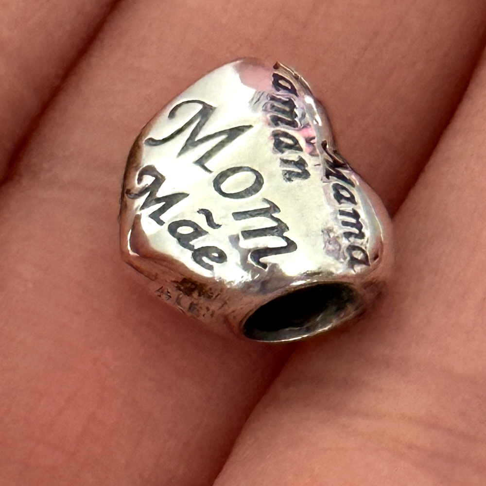 Pandora 925 Sterling Silver Retired Mom Multi Language Puffy Heart Bead Charm In 925 sterling silver Signed S925 ALE Excellent condition A perfect addition to your Pandora bracelet or great as a gift.