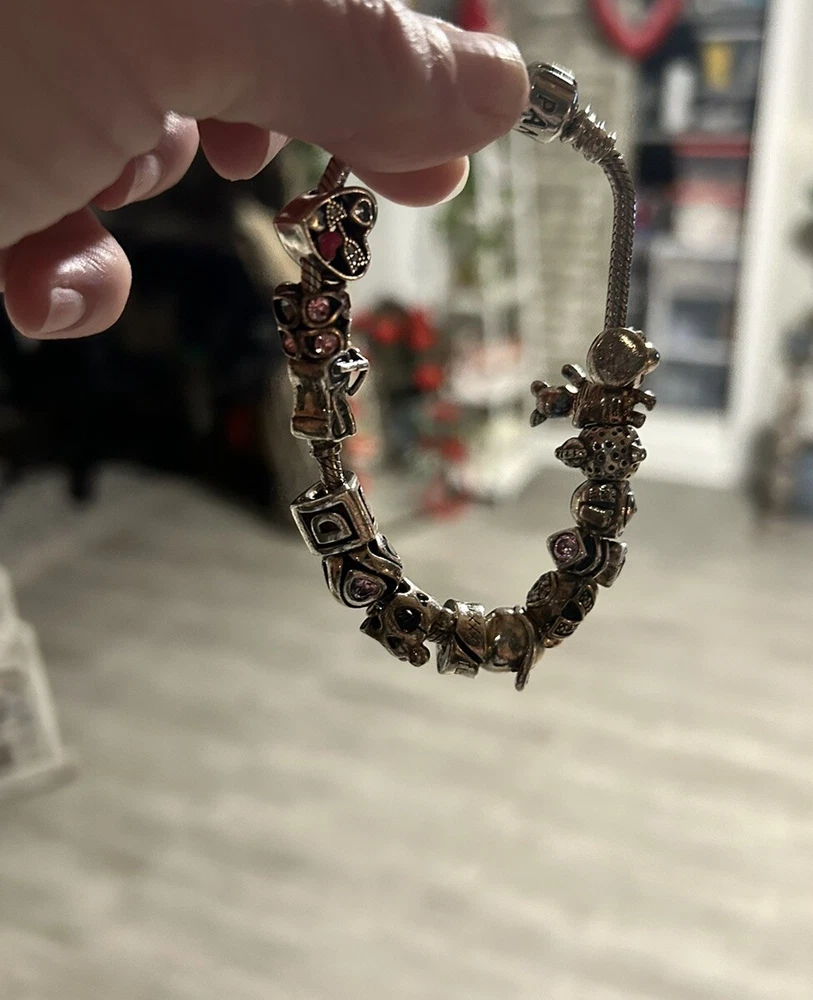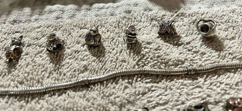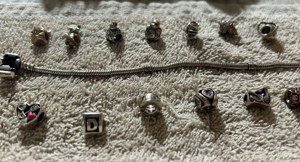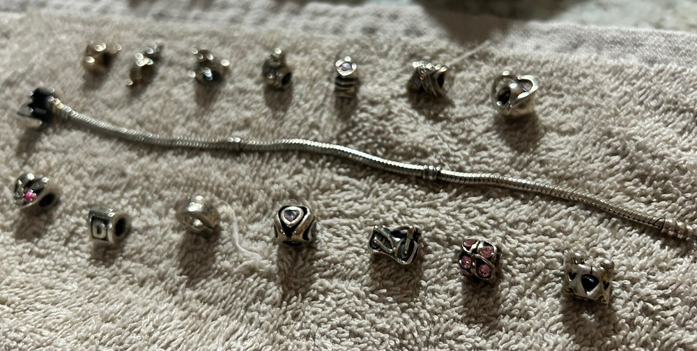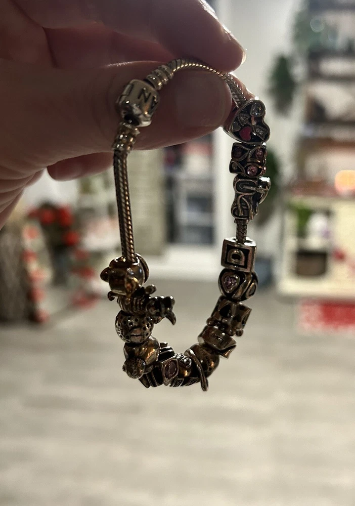 Pandora Bracelet 925 With 14 Assorted Charms 7.5" Sterling Silver. Condition is Pre-owned. Shipped with USPS Ground Advantage.