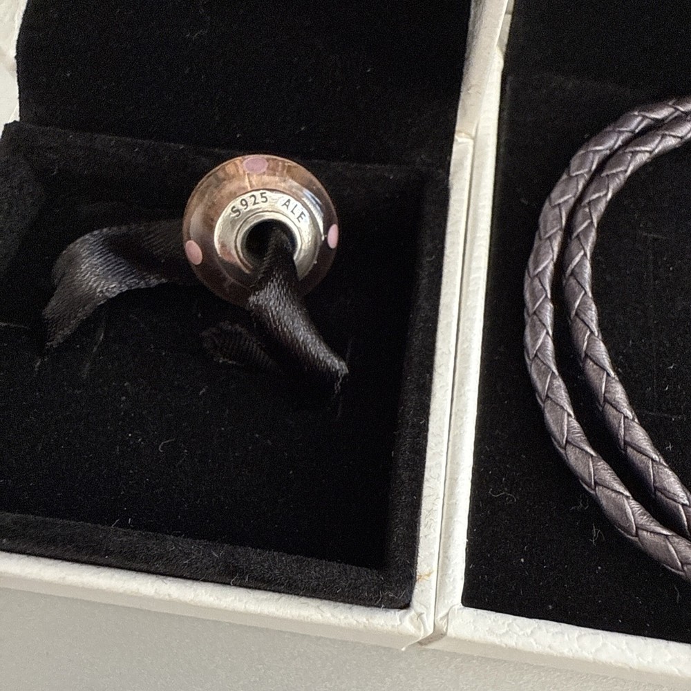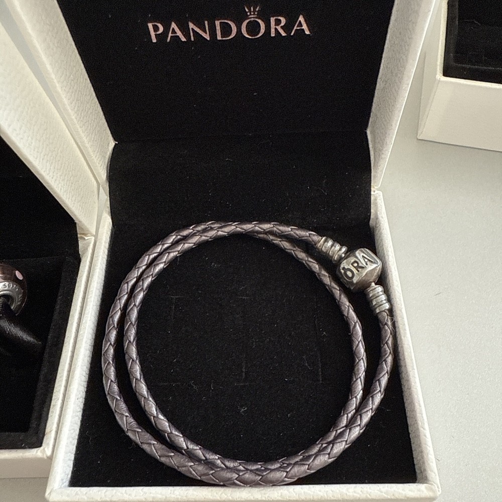 Pandora double leather bracelet. Pretty Heather/silvered sort of colour. Cost £60 new. Two bead bracelets around £70 new. See my other listings as selling all of my collection. Ask any questions.