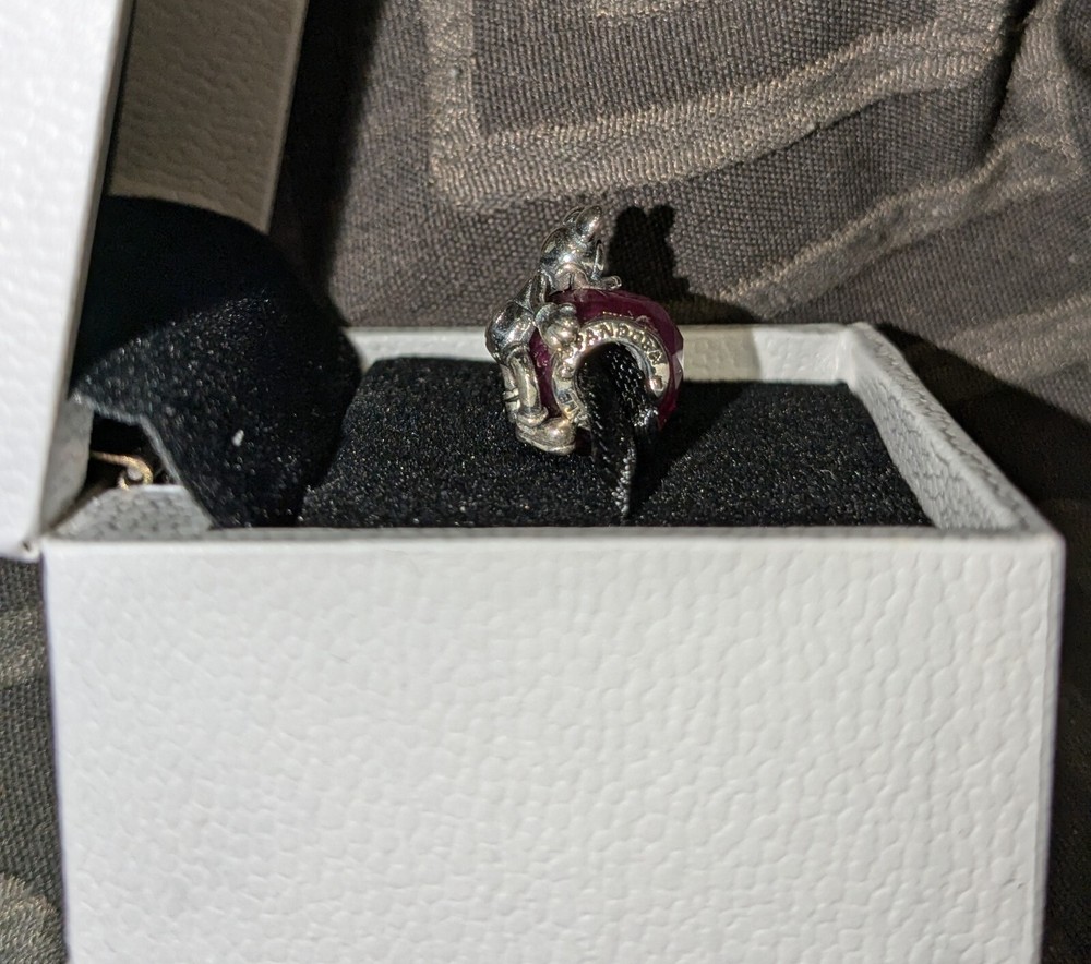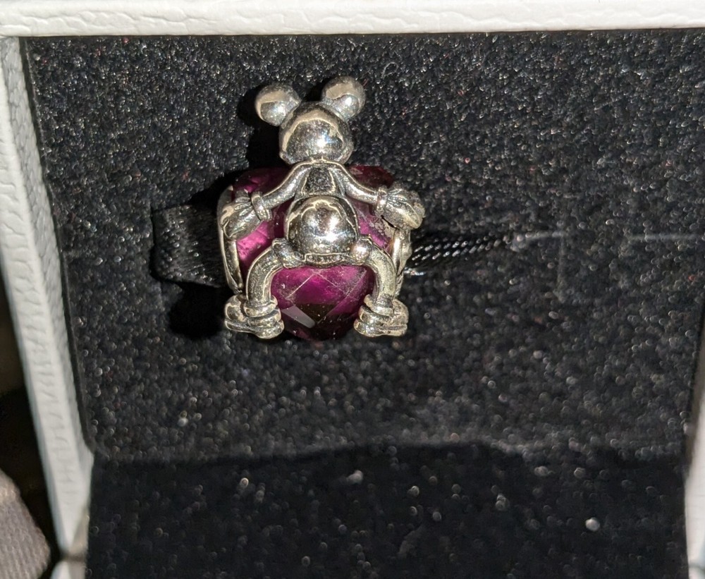 Pandora Mickey Mouse Slide Charm The charm boasts a sterling silver construction with a dazzling fushia heart bead The piece is S925 Ale. Pre owned in great condition Free shipping comes in a charm box