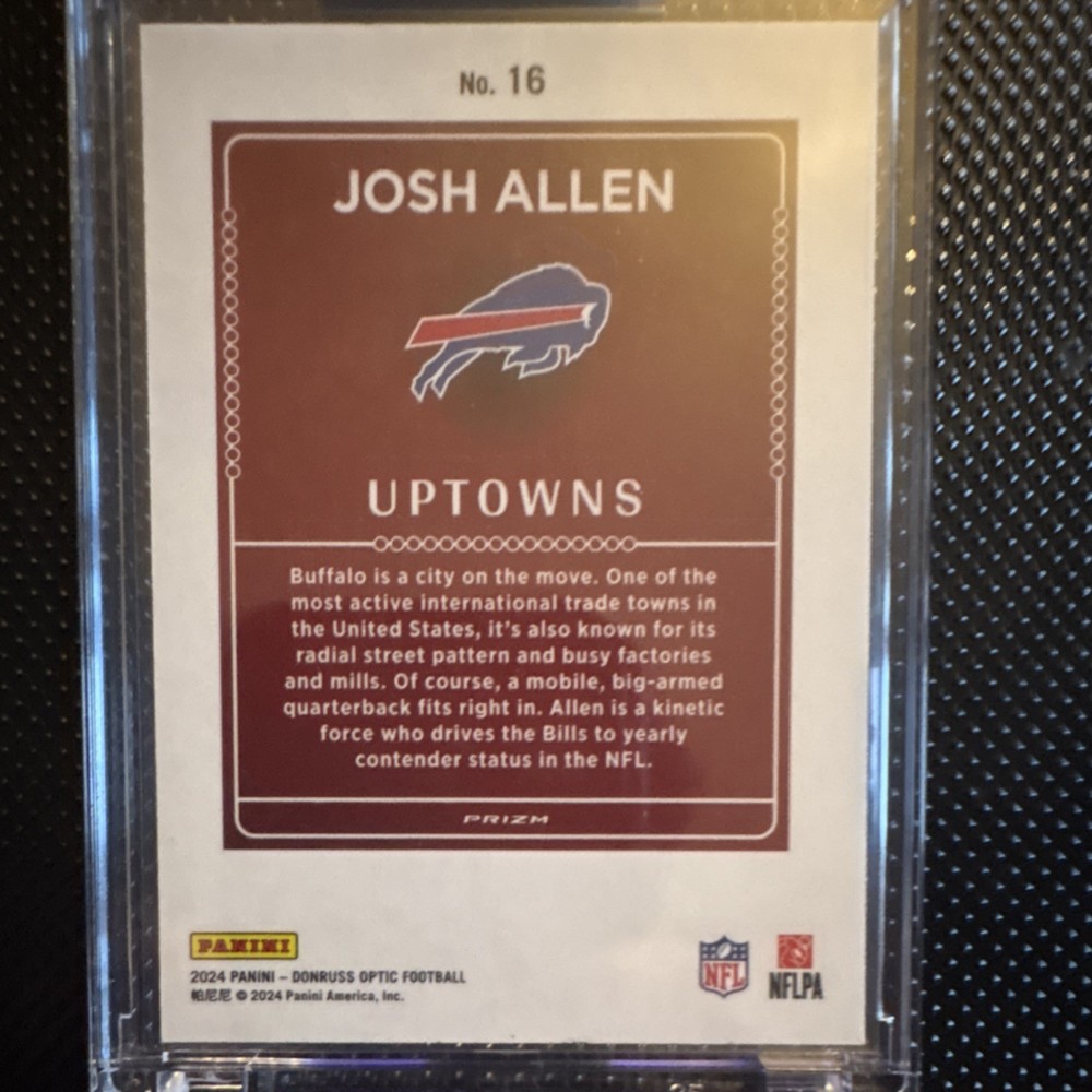 Material:Card StockCard Name:Josh Allen UptownsCard Condition:Near mint or betterTeam:Buffalo BillsSeason:2024Language:EnglishInsert Set:UptownsManufacturer:PaniniSet:2024 Panini Donruss OpticPlayer/Athlete:Josh AllenCard Size:StandardOriginal/Licensed Reprint:OriginalCard Number:16Features:InsertType:Sports Trading CardLeague:National Football League (NFL)Year Manufactured:2024Sport:FootballParallel/Variety:[Base]Country of Origin:United States
