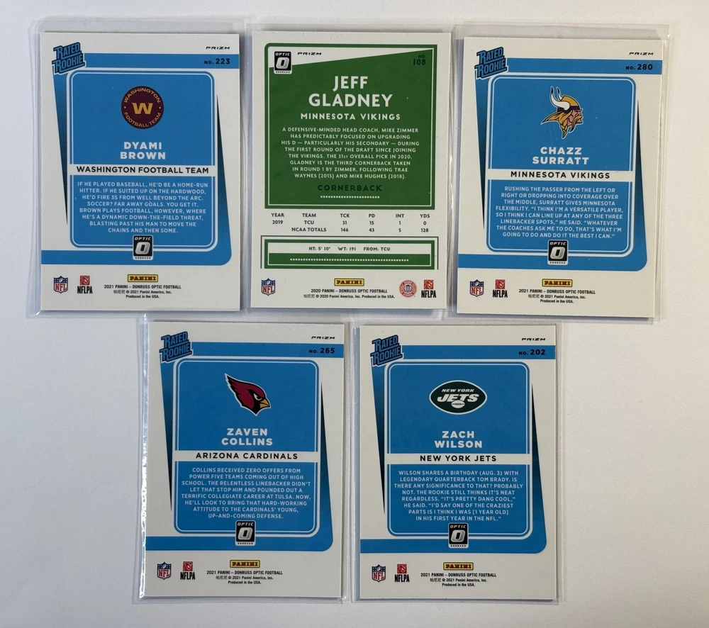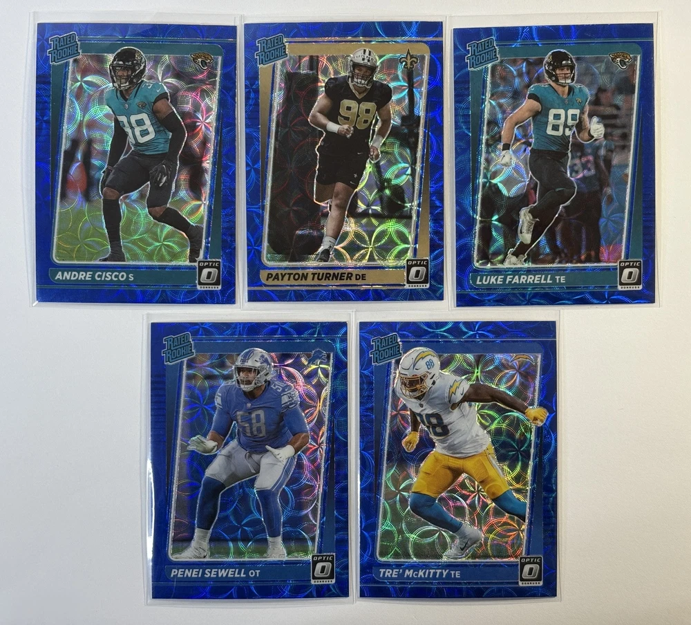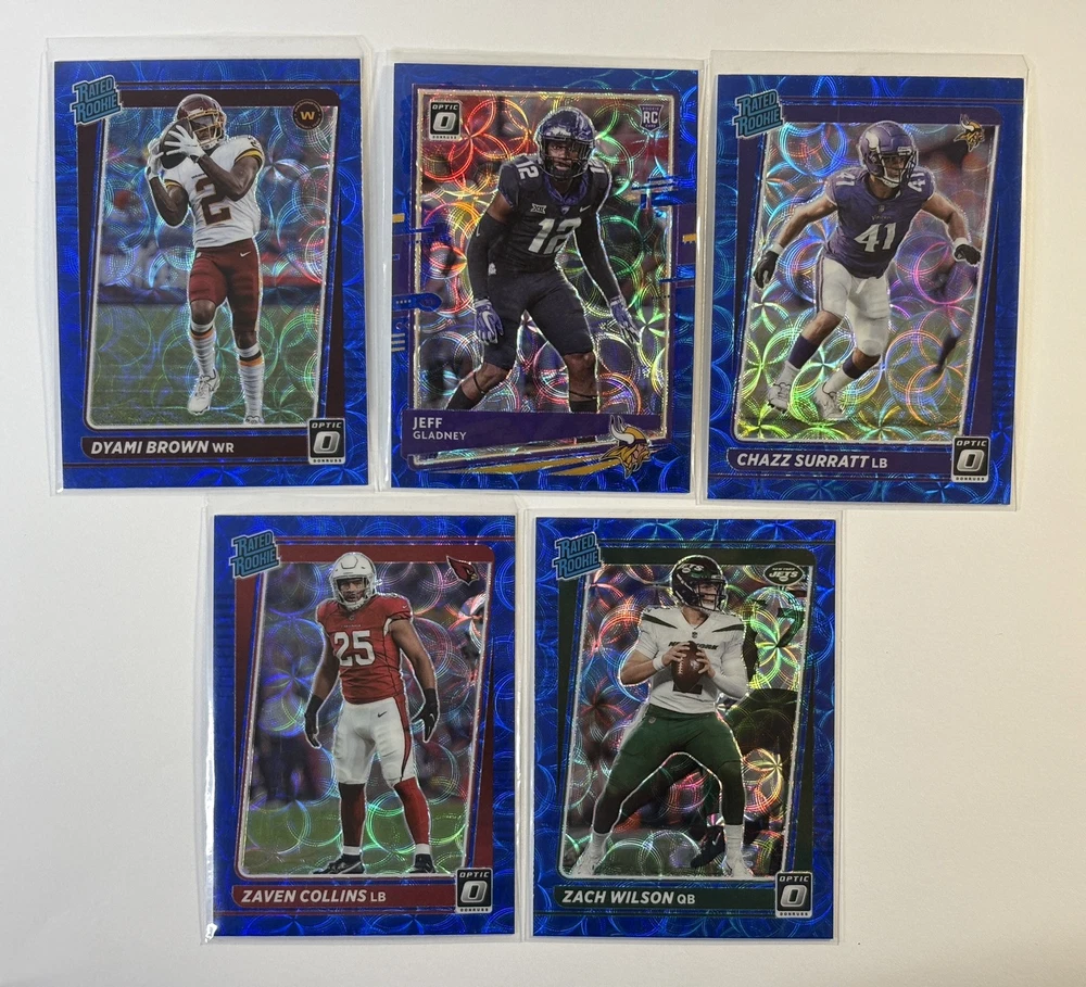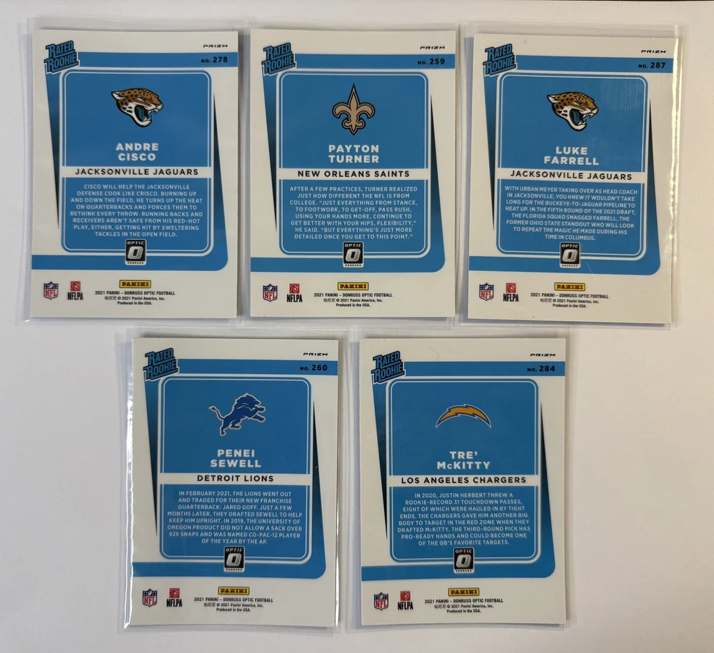 This Panini Donruss Optic Blue Scope Rookie Lot contains 10 cards featuring NFL players such as Andre Cisco, Chazz Surratt, and Penei Sewell. The cards are made of standard card stock material and are in their original form, not a reprint. They are in English language and were manufactured in the United States in 2021. The lot includes cards from various teams such as the Arizona Cardinals, Los Angeles Rams, and New York Jets. The cards feature exclusive and parallel features, making them a great addition to any sports trading card collection. This lot is perfect for fans of football and the National Football League (NFL).