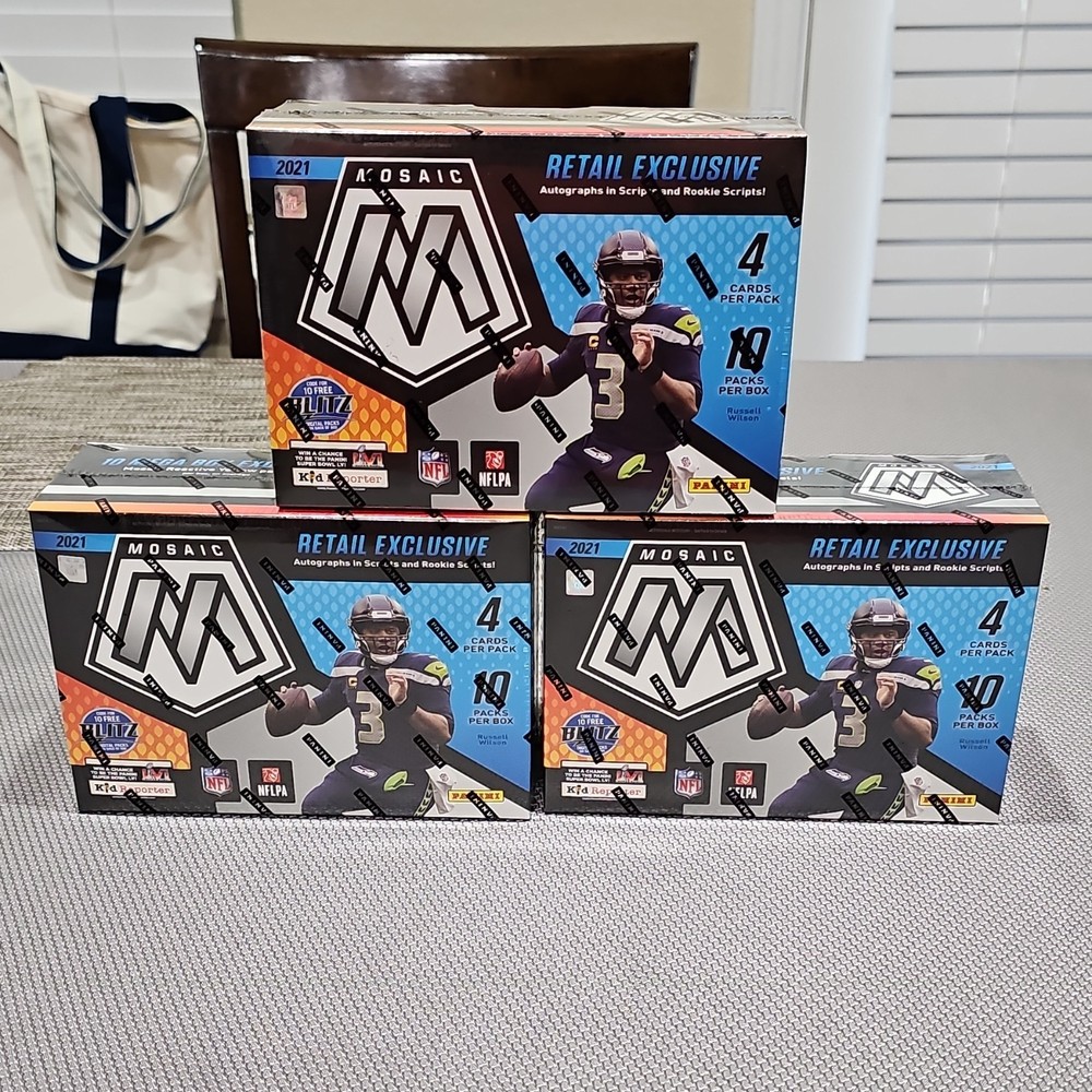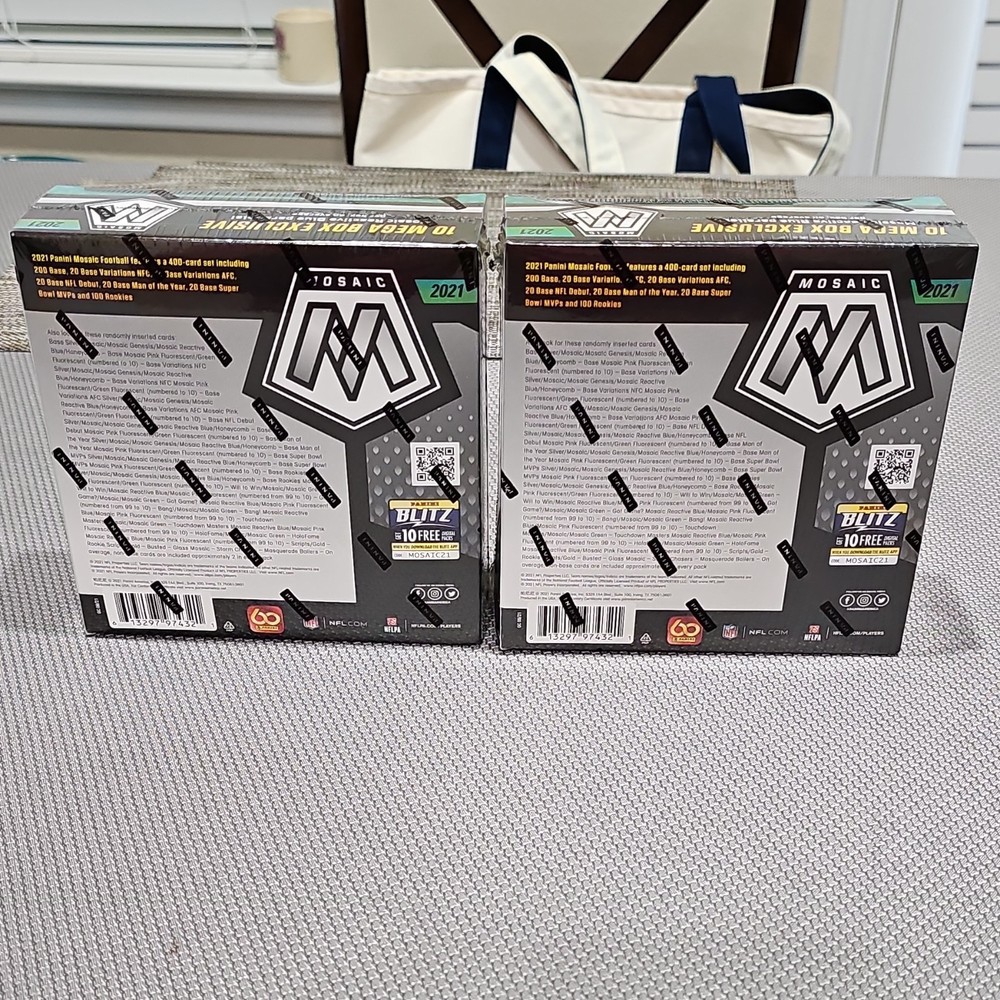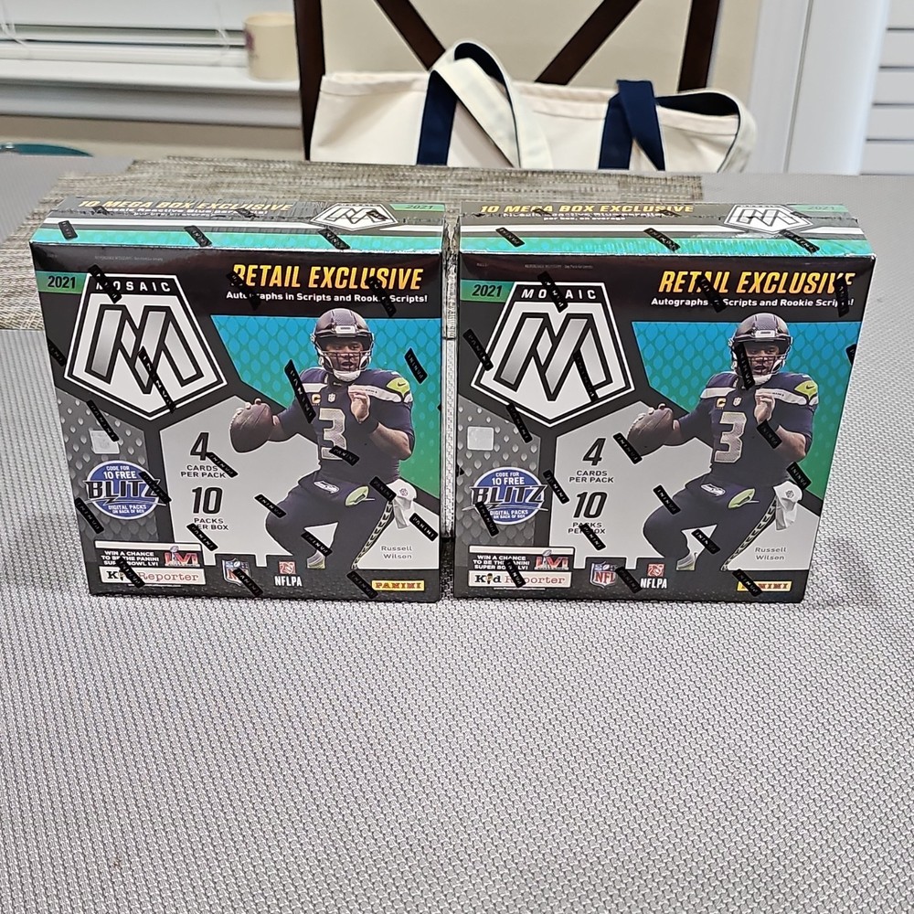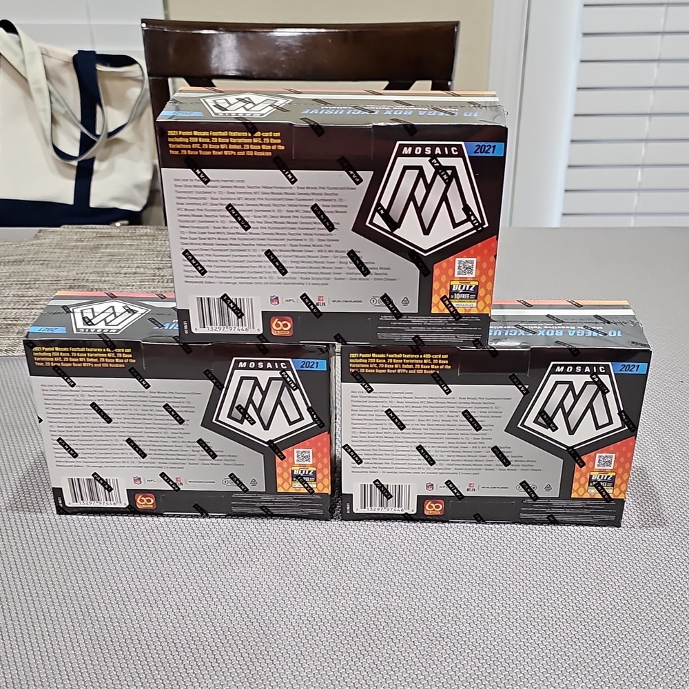 Panini Mosaic 2021 NFL Football Mega Box Lot of 5. Lot includes three of the reactive yellow mega box variants and two of the reactive blue mega box variants. All boxes are new/factory sealed.