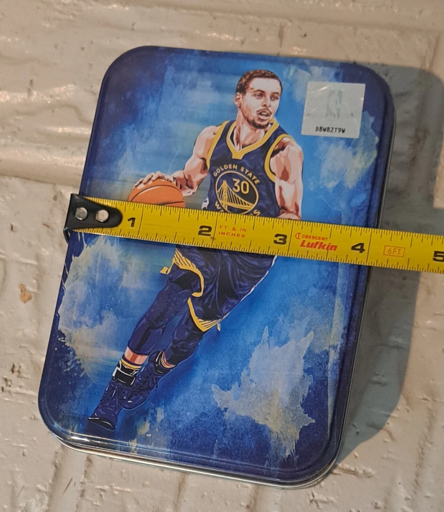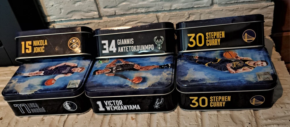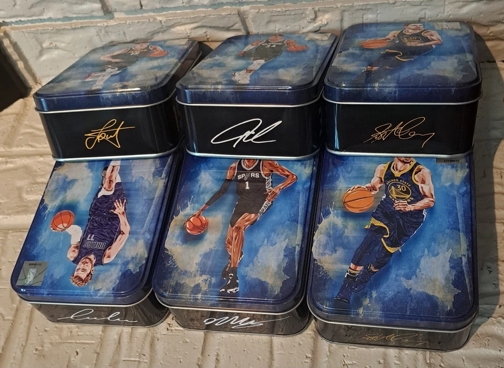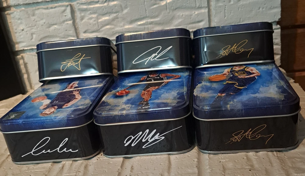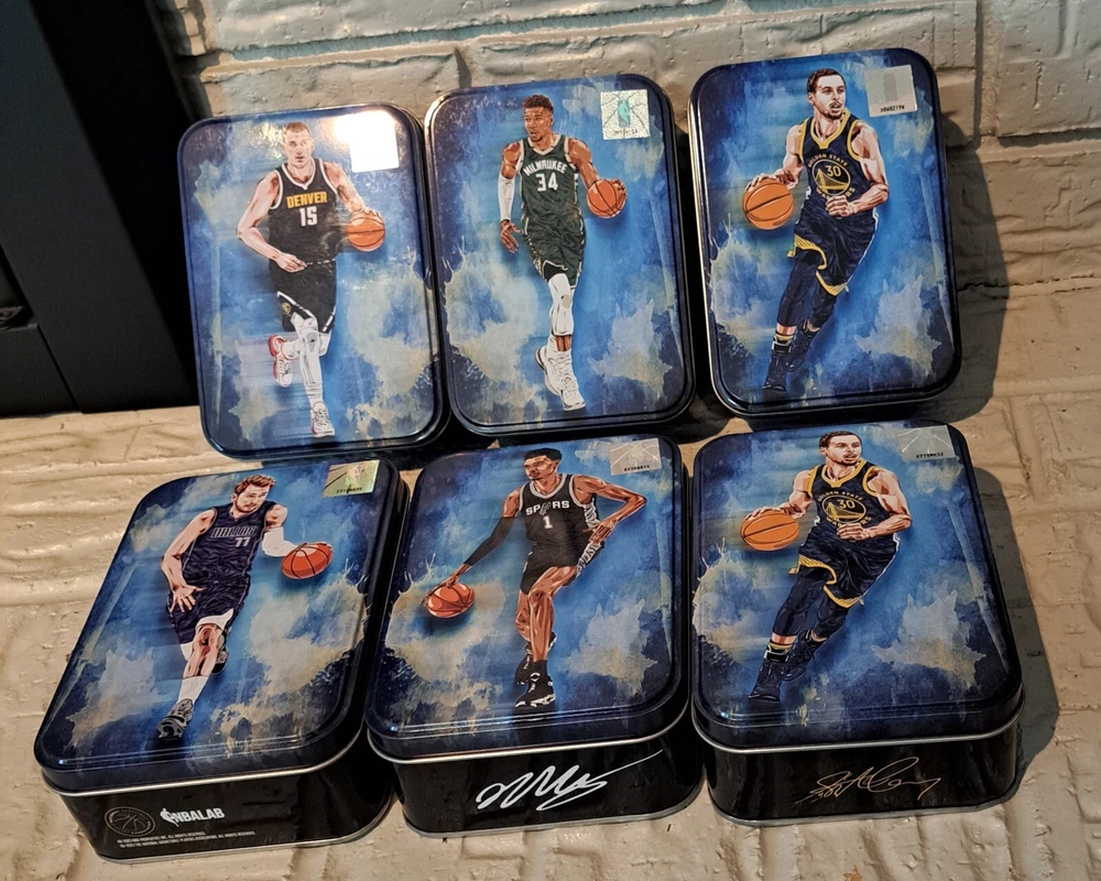 This Panini Prizm Collectible Empty Tins NBA LABS X 6 is a must-have for any basketball trading card collector. The set features some of the most popular NBA players, including Nikola Jokić, Victor Wembanyama, Stephen Curry, Giannis Antetokounmpo, and Luka Dončić. The tins are made of high-quality aluminum material Each box is perfect for storing and displaying your collection, while the durable material ensures that your cards stay safe and protected. Whether you're a fan of the Golden State Warriors, San Antonio Spurs, Dallas Mavericks, Milwaukee Bucks, or Denver Nuggets, this set is a great addition to your collection. Don't miss out on the chance to own this unique and rare set of sports trading card tins. The set includes two Stephen Curry Tins. Both tins have slight dents on the bottom, and one tin has a slight dent on the side. These imperfections are shown on the last two pictures.