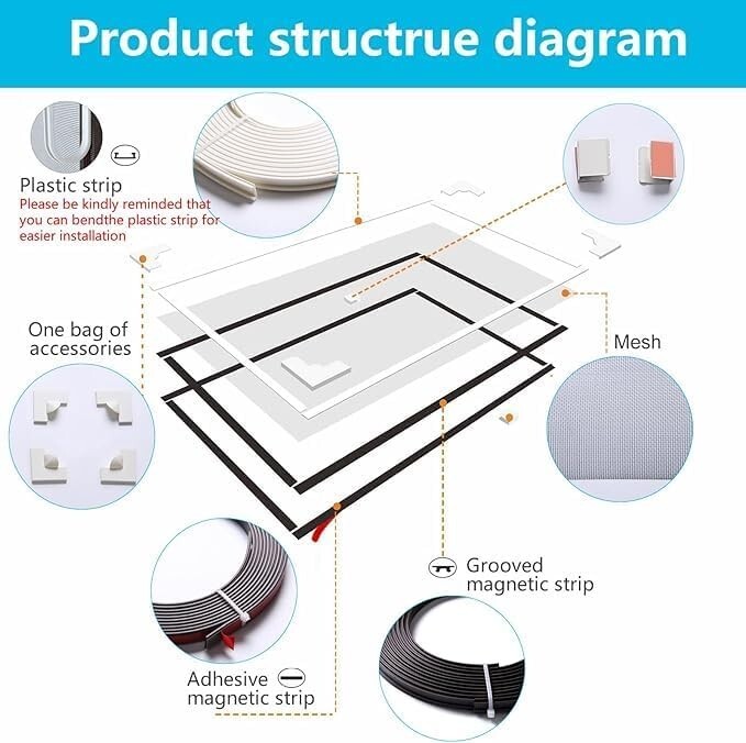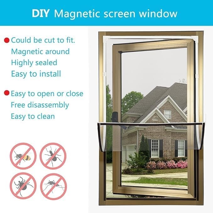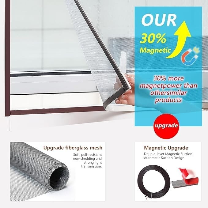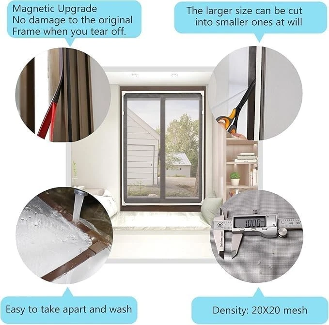Strong magnetic seal: Upgraded thick magnetic strip, with a 30% increase in retention force, ensuring firmness. High durability fiberglass mesh: 20x20 mesh gray mesh, tear resistant and corrosion-resistant, transparent and breathable DIY Quick Installation: No need for drilling tools, easy to complete installation Adjustable size Easy to disassemble and maintain: The mesh and magnetic strip can be separated,. Clean and worry free. Can replace the mesh Strong adhesive strip: Tear off without residue, protecting the surface of the window.