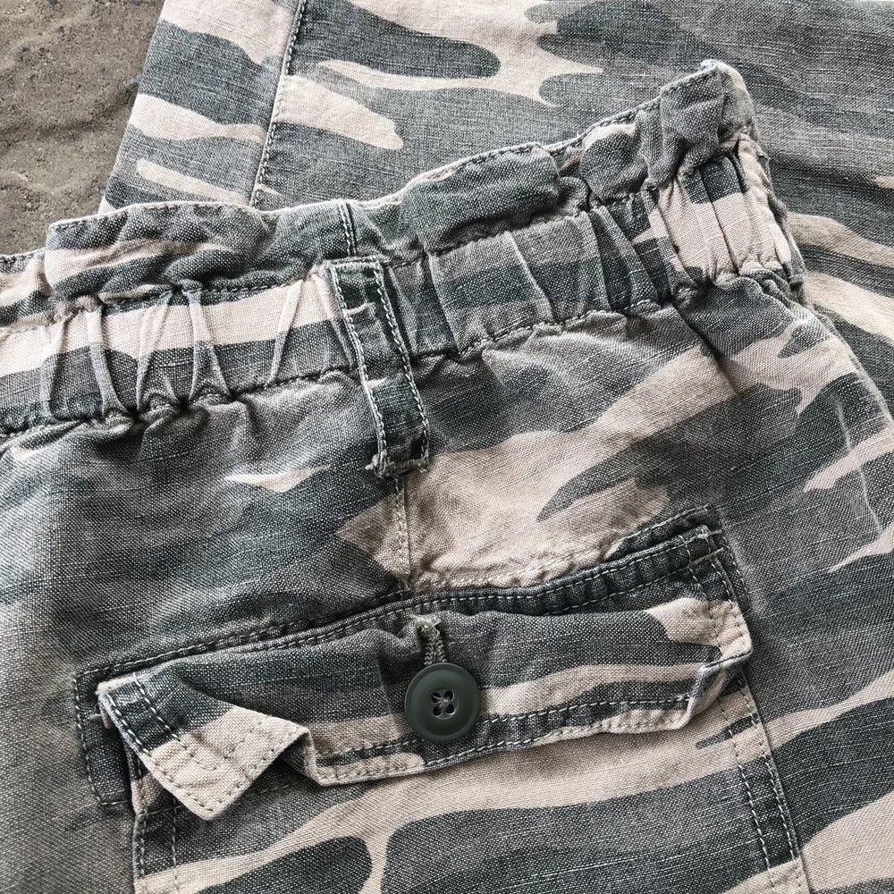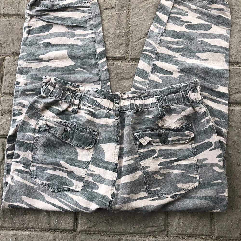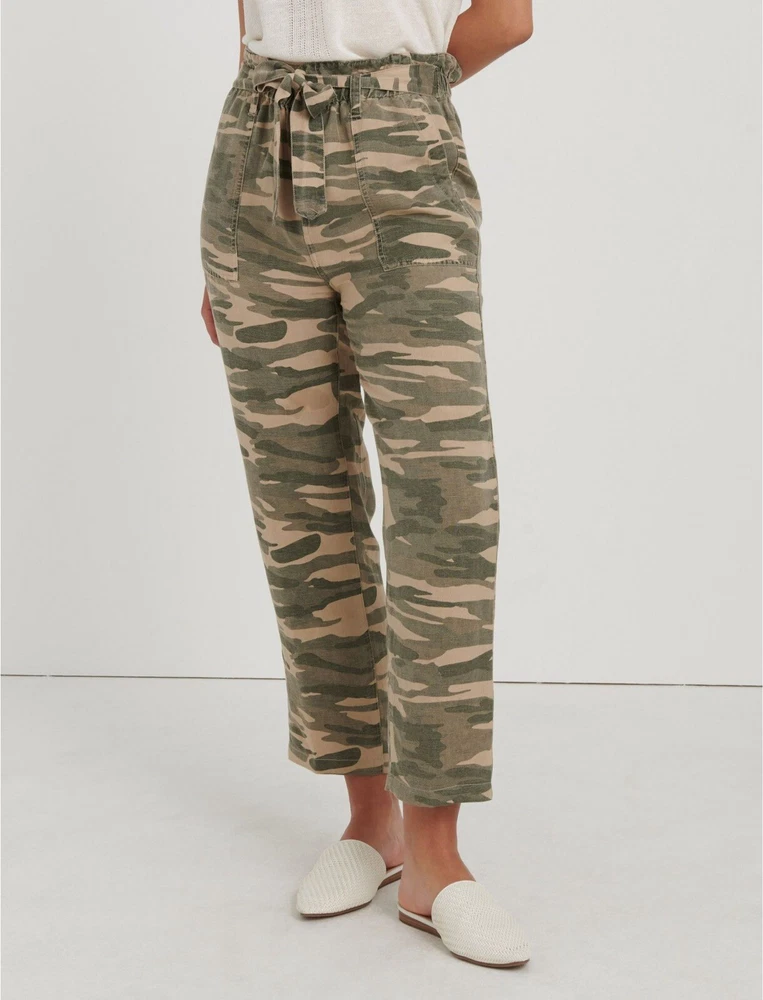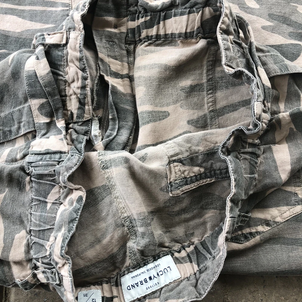 Lucky Brand Khaki Camo Soft Utility Boyfriend Ruffle Waist Linen BlenPants 12/31. Great condition 7W21002 2019 Tie waist Zip Linen rayon 17” waist flat 12” front rise 26” inseam Relaxed loose comfy fit
