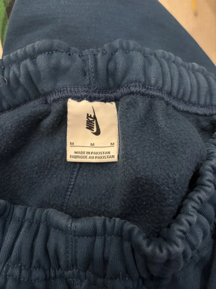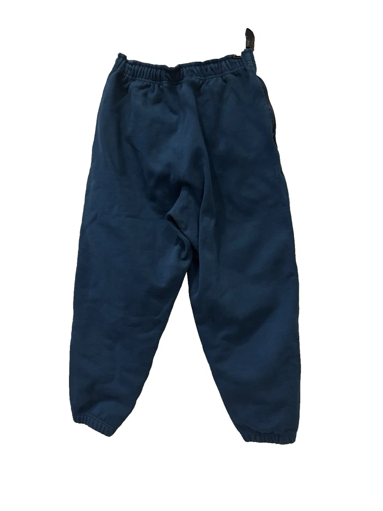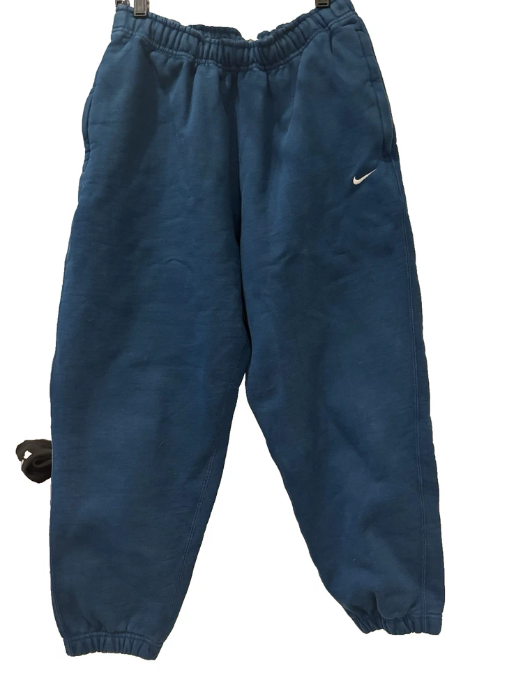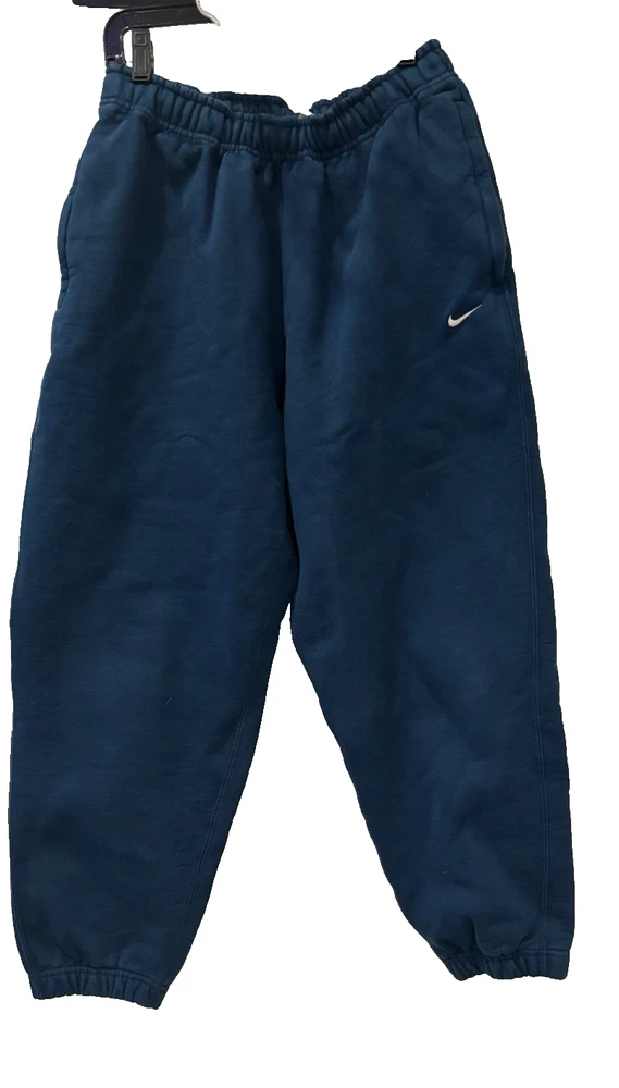 These Nike Essentials Solo Swoosh Men's Fleece Pants are comfortable and heavyweight joggers in Valerian Blue/White. They feature an adjustable drawstring waist, elasticized cuff leg style, and a loose fit. Made of 84% cotton and 16% polyester fleece, these pants are perfect for various activities like gym training and athleisure. The pants are decorated with the iconic Nike Swoosh logo, making them a classic addition to your activewear collection.