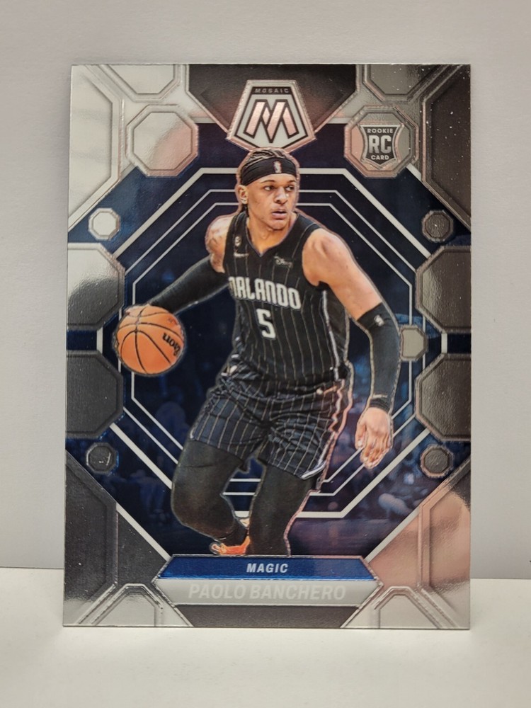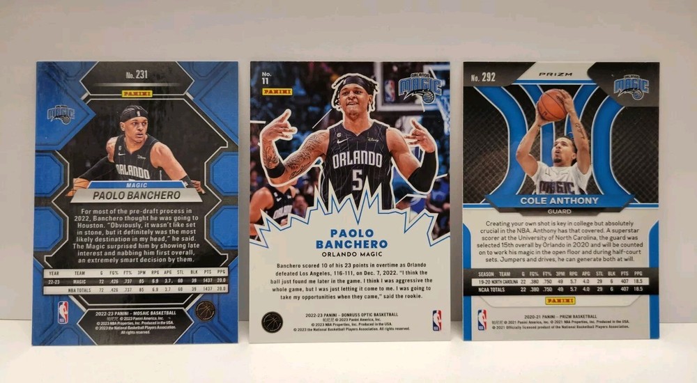 This is a lot of 3 rookie basketball trading cards featuring Paolo Banchero and Cole Anthony from the Orlando Magic. The cards are from the sets 2022-23 Donruss Optic, 2020-21 Panini Prizm, and 2022-23 Panini Mosaic. Cards included are: 2022-23 Panini Donruss Optic My House #11 Paolo Banchero Rookie Card 2022-23 Panini Mosaic #231 Paolo Banchero Rookie Card 2020-21 Panini Prizm #292 Cole Anthony Orange Ice Cards will ship within a penny sleeve and top loader for protection. As our team (father and son), the intent is to pass on an appreciation for the hobby. We hope you enjoy bidding on these great players and look forward to possibly adding them to your collection. Best regards, Gengler Boys Sports Cards "a father and son hobby"