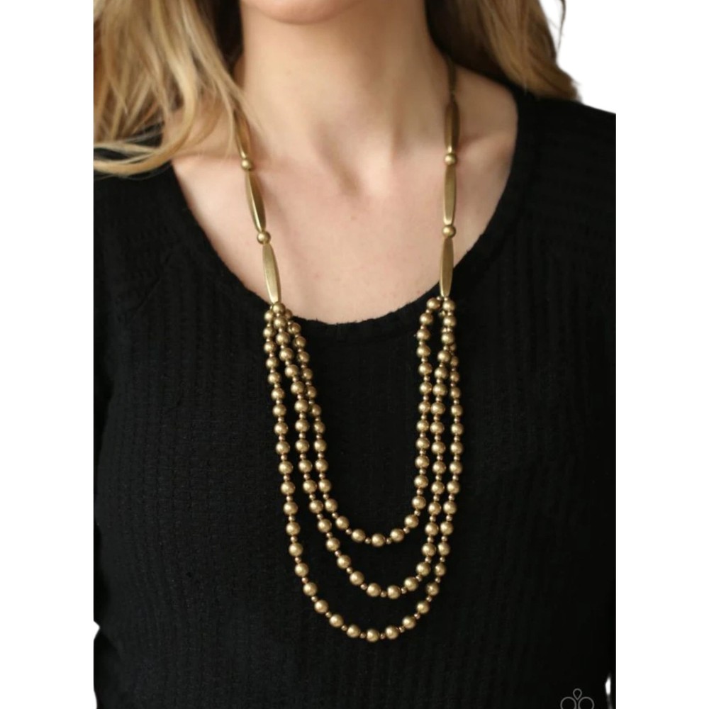 ✨️ Beaded Beacon Brass Necklace and Earring Set by Paparazzi ✨️ Brushed in an antiqued shimmer, dainty and classic brass beads alternate across the chest in three rustic layers. The tiered display attaches to oblong and classic brass beads that connect to a rustic brass chain for a bold industrial statement. Features an adjustable clasp closure. ✨️ Sold as one individual necklace. Includes one pair of matching earrings. ✨️ New in pack! ❤️From a smoke-free home. Please see all photos as this is the exact item you will receive in the exact condition shown❤️