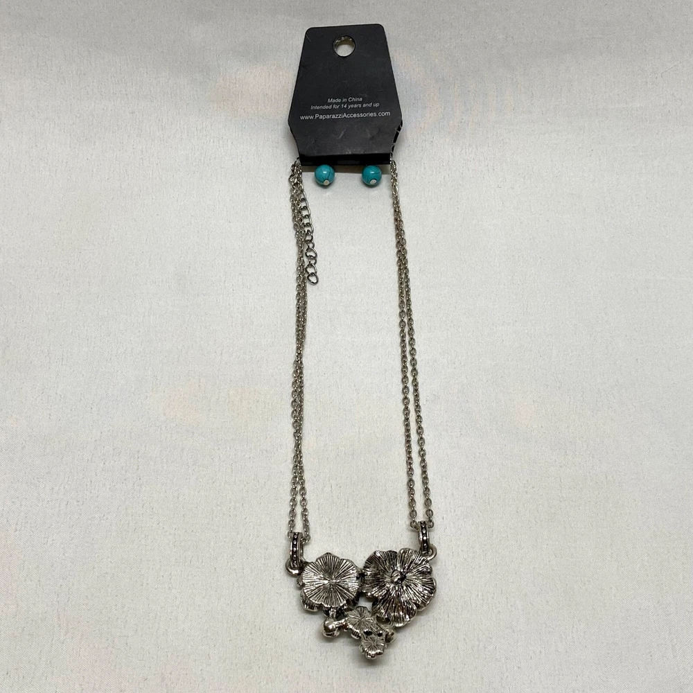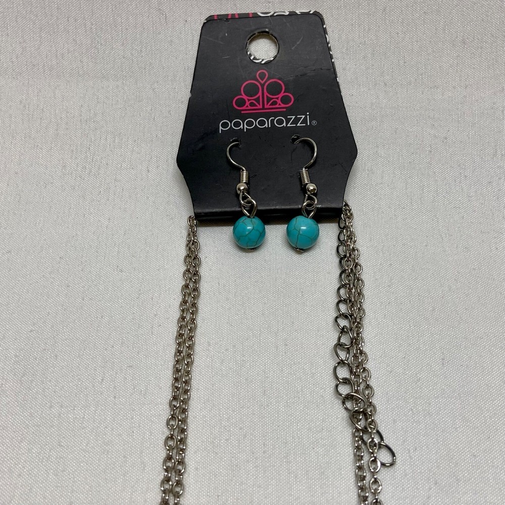 Desert Harvest Blue Fashion Necklace & Earring Set Paparazzi Accessories NWT This ladies fashion Jewelry set is brand new with tags, no noted flaws. Please see all photos as this is the exact item you will receive. Earrings are hook dangles and the necklace is silvertone. Same day shipping Thanks for looking!