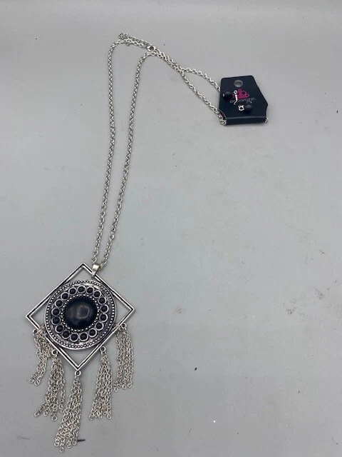 Elevate your bohemian style with this stunning Paparazzi necklace and earring set. The black square pendant hangs from a silver chain, and the lobster closure ensures a secure fit. The necklace and earrings are adorned with beautiful black stones that add a touch of elegance to any outfit. This set is perfect for any occasion and is sure to turn heads. The Paparazzi brand is known for its high-quality jewelry, and this set is no exception. Whether you're dressing up or dressing down, this necklace and earring set will add a touch of beauty to your look.