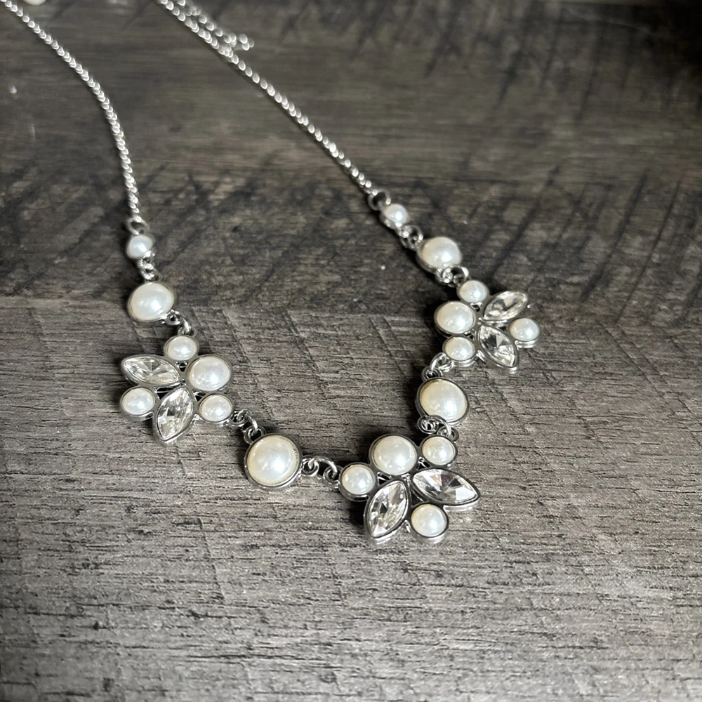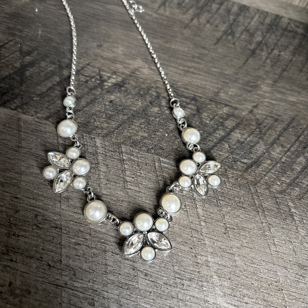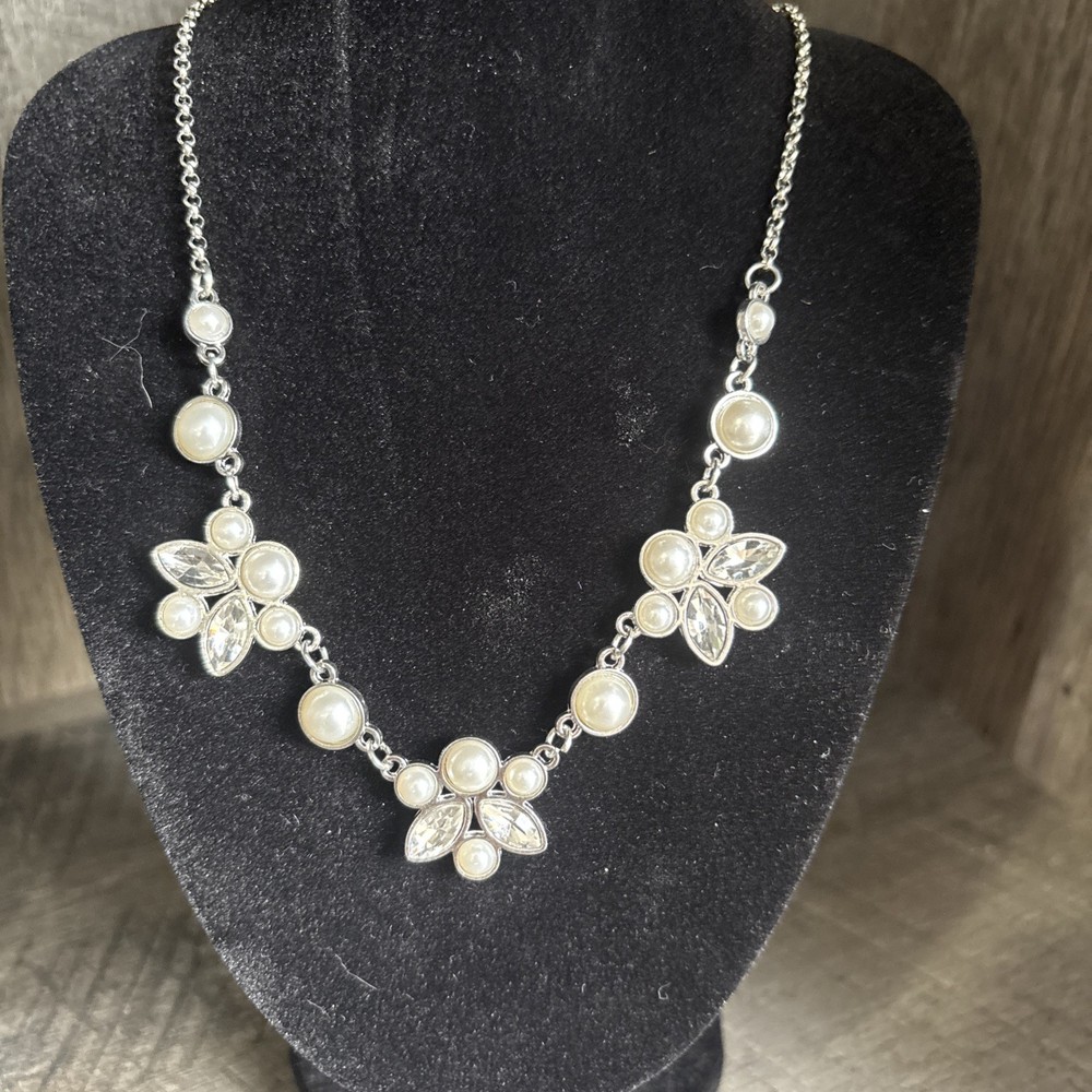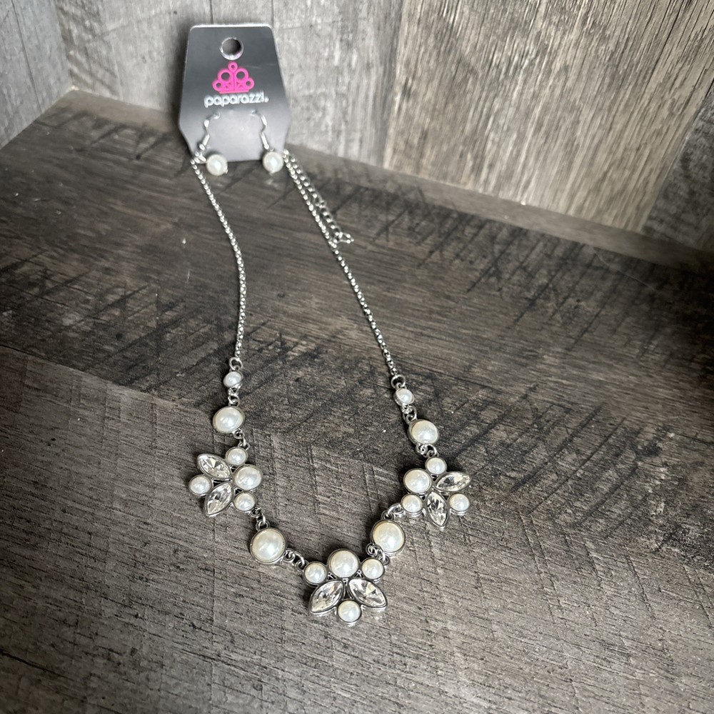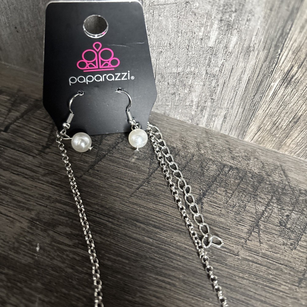 This is a new set from Paparazzi silver tone with faux pearls it is about 10” but can extend