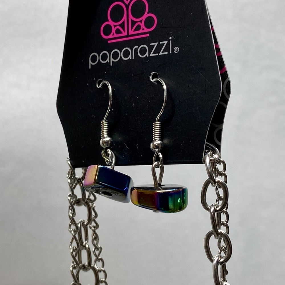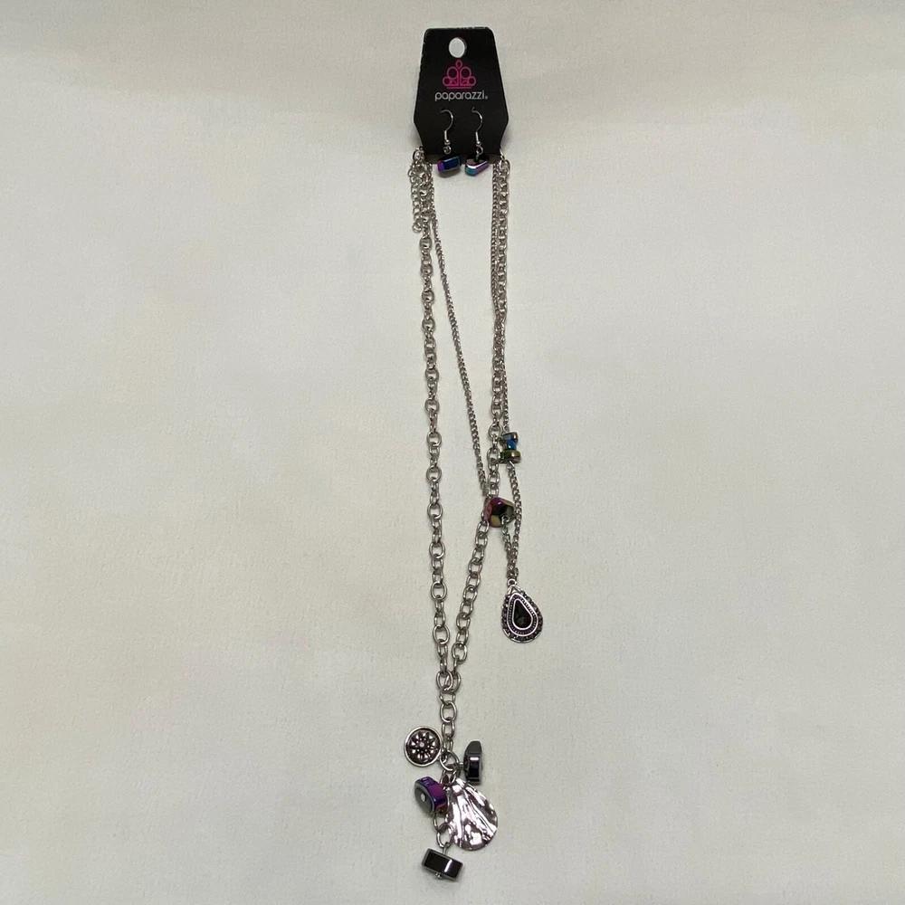 Sunset Sightings Fashion Charm Necklace & Earring Set Paparazzi Accessories NWT This ladies necklace and earrings set is brand new, no noted flaws. Please see all photos as this is the exact item you will receive. Earrings are hook dangles for Pierced Ears and there are 2 separate silver tone necklaces to give a layered affect. Same day shipping Thanks for looking!