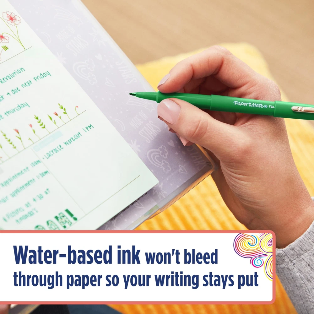 Fact: dull, smudgy ink is a downer. So boost your writing fun-factor with Paper Mate Flair Felt Tip Pens! With bright colours and smear-resistant, no-bleed ink, these colouring pens make writing a blast. The medium point writes in bold, expressive lines to match your personality. With Flair felt tips, there’s no limit to your fun. A SCHOOL ESSENTIAL: Perfect for marking, note-taking, sketching, outlining and colouring MEDIUM POINT PEN: Produces bold, expressive lines to match your personality NO-BLEED INK: Water-based formula won't bleed through paper so your writing stays put VIBRANT COLOUR: Makes sure every creation pops SMUDGE- AND FADE-RESISTANT: Keeps your page nice and neat for work that lasts