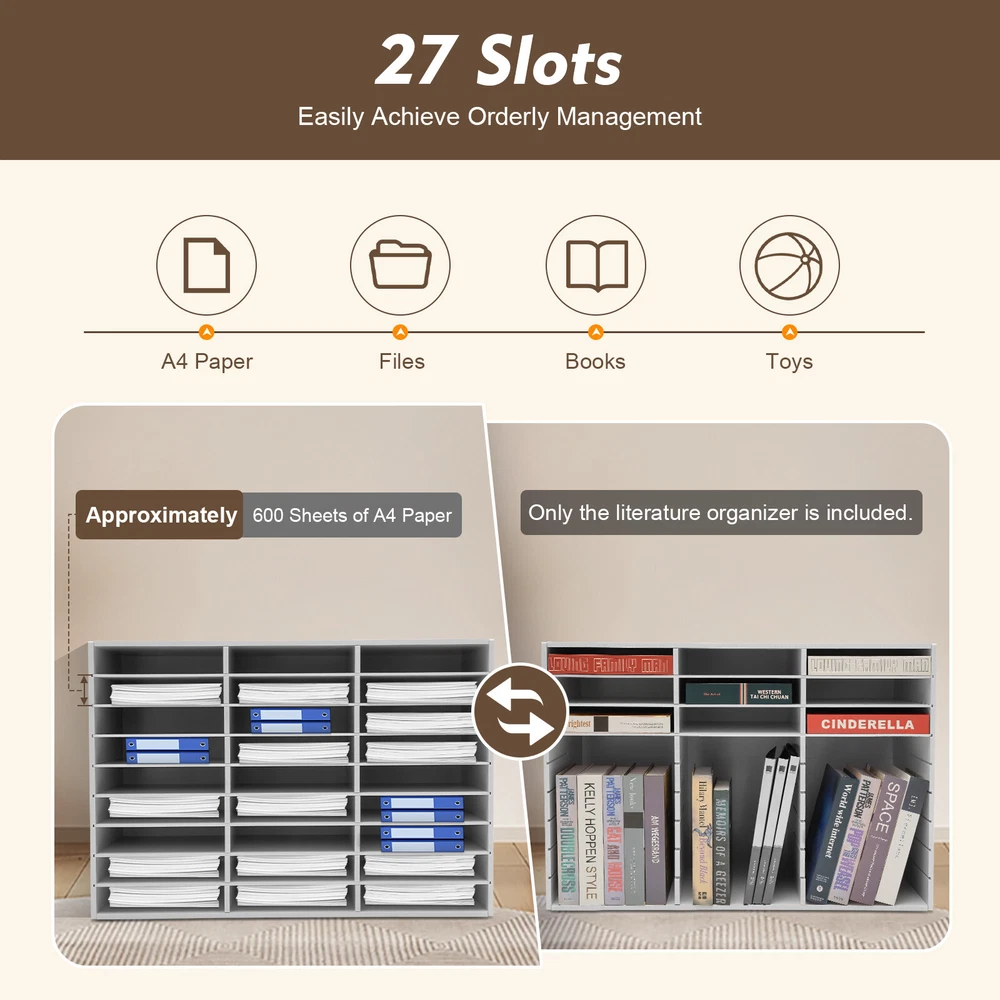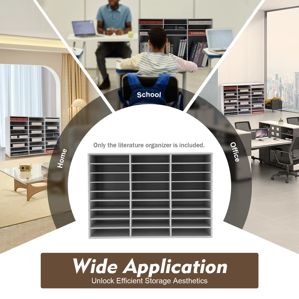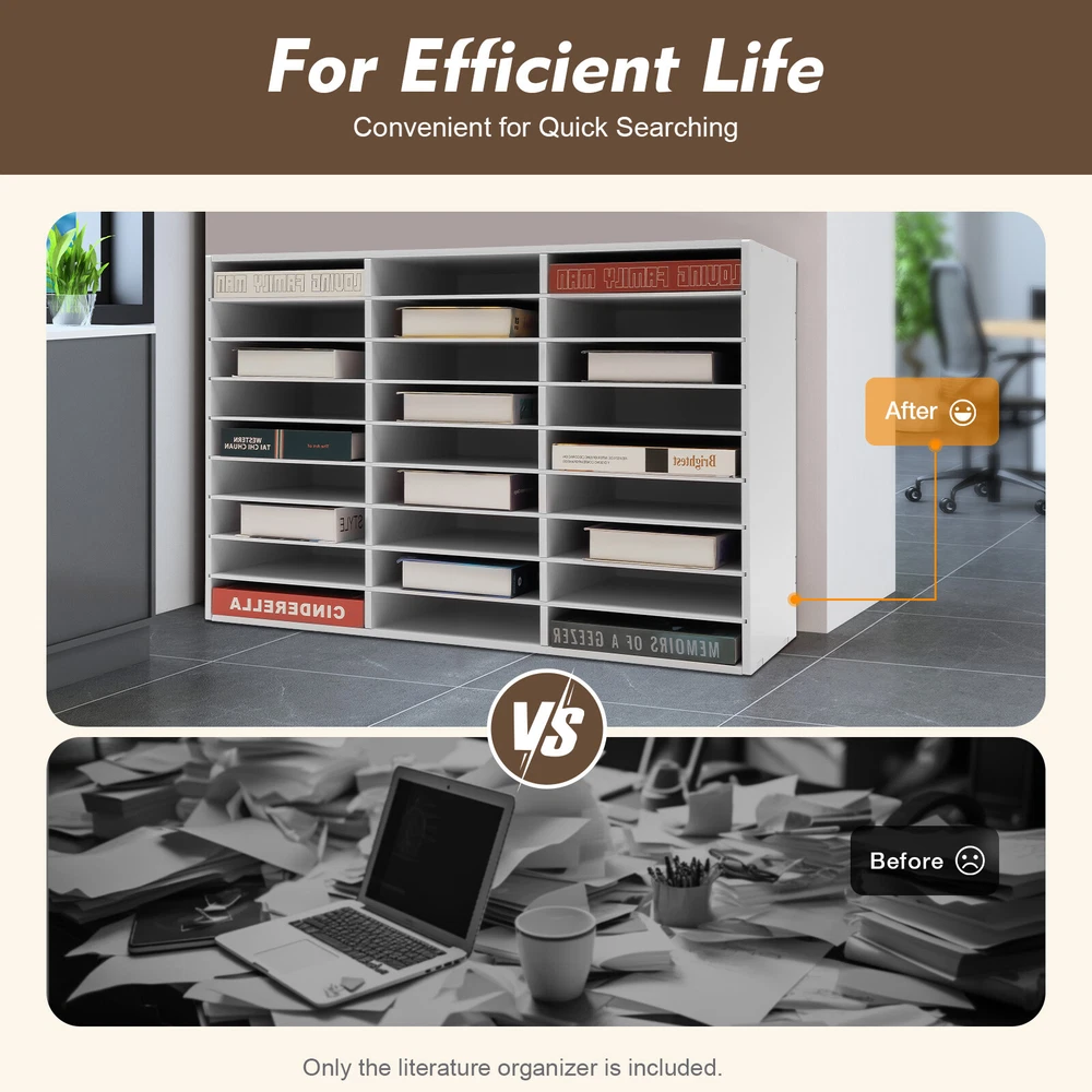 Specification Material: PVC Color: White Shape: Rectangular Style: Modern Each Slot Capacity: About 600 Sheets of A4 Paper Number of Slots: 27 Bearing Capacity: 50kg/110.2lbs Each Slot Size: 25*5.5cm/9.8*2.2in Top Board Thickness: 1cm/0.4in Shelves Thickness: 0.5cm/0.2in Product Size: 80*30.5*55.5cm/31.5*12*21.9in Package Size: 91*33.4*13.5cm/35.8*13.2*5.3in Net Weight: 10.95kg/24.1lbs Gross Weight: 11.75kg/25.9lbs Package Included 1* Literature Organizer 1 Pair* Gloves 1* Sandpaper 6* Anti-slip Pads 1 Set* Screws 1* Screwdriver 1* English Manual Paper Storage Cabinet Classroom Keepers Mailbox for Office Home School white Description Description Are you still worried about the messy desktop? This literature organizer unlocks efficient storage aesthetics. With a pure white tone, it is not only a neat landscape in the office, but also an elegant decoration in the home space. Featuring 27 slots and a doorless design, it can easily handle A4 paper, magazines, receipts, and books, which can all be organized and clear at a glance. Make this literature organizer a powerful assistant for your efficient life, starting a clean and efficient day. Key Features Stable Support: It has a strong bearing capacity (110.2lbs) with a rectangular frame structure, and the thickened top board (0.4in) allows for secure placement of items above, meeting daily storage needs for documents, books, and heavy paper documents, ensuring stability and reliability. Easy to Install: It has a simple structure and complete packaging. Installing it only requires a few simple steps, saving time and effort. Premium Material: Made of high-quality PVC, it has wear resistance and shock resistance, and is not easily deformed, guaranteeing a long service life. Capable Organizer: It has 27 slots, and each slot can store approximately 600 sheets of A4 paper. The shelves adopt a movable design, so each shelf can be removed to accommodate tall items. It can help you easily achieve orderly management, making file storage less cluttered. Doorless Design: The doorless design saves space for opening and closing. It makes the file content clear at a glance without blocking the view and is convenient for quick searching and improving efficiency. Simple Style: It adopts a classic white color with smooth lines, which is not abrupt when placed by the desk, in the corner, or against the wall, easily enhancing the texture of the space. Easy to Clean: Its surface is smooth and flat, so you can easily wipe off stains with a wet cloth, which is convenient and effortless. Satisfaction Guarantee: No matter what problem you encounter or have any questions, please contact us. We will reply and solve the problem for you as soon as possible. Details Stable Base : Its base has six anti-slip pads, which can prevent the organizer from slipping and avoid scratching the ground. Gloves for Installation: The packaging includes a pair of gloves to protect your hands from injury during installation. Sandpaper Polishing: Sandpaper can be used to polish the edges of boards to prevent scratching your hands. Application It can store files, contracts, A4 paper, receipts, and other office documents. It can also be used to store children's toys, books, comics, etc. in homes, offices, or schools. Specification Material: PVC Color: White Shape: Rectangular Style: Modern Each Slot Capacity: About 600 Sheets of A4 Paper Number of Slots: 27 Bearing Capacity: 50kg/110.2lbs Each Slot Size: 25*5.5cm/9.8*2.2in Top Board Thickness: 1cm/0.4in Shelves Thickness: 0.5cm/0.2in Product Size: 80*30.5*55.5cm/31.5*12*21.9in Package Size: 91*33.4*13.5cm/35.8*13.2*5.3in Net Weight: 10.95kg/24.1lbs Gross Weight: 11.75kg/25.9lbs Package Included 1* Literature Organizer 1 Pair* Gloves 1* Sandpaper 6* Anti-slip Pads 1 Set* Screws 1* Screwdriver 1* English Manual Notes Please allow the slight color difference caused by the shooting light and 1-3cm error due to manual measurement, and make sure you do not mind before ordering Payment Delivery details Terms of sales About us Contact us Payment We accept ebay payment 。 Fees such as import duties, taxes are not included in the item price or shipping costs. These charges are the buyer's responsibility. Delivery details Shipping: 2-9 working days to: USA Terms of sales We maintain high standards of excellence and strive for hundred percent customer satisfaction. Feedback is very important to us. We hope that you contact us immediately before you give neutral or negative feedback, so that we can address your concerns. It is impossible to address issues if we do not know about them! About us Your satis faction is our ultimate goal. We work hard to earn your trust and future business. Our certified technicians have tested each item before shipping. The unit comes with 1 year limited warranty on all manufacturing defects. a) If you receive a defective item, you may return it or ask for a discount. Please contact us within 14 days after you receive the package. b) What you returned must be intact and in its original packaging as re? u. Customer is responsible for shipping costs of the returned item. c) We will cover the cost of shipping back t with the shipping rate indicated in the registration page. We will send you a new unit or refund the full payment you paid. Thank you. Contact us Business Hour Business Hour: Monday To Friday: 8:30 AM to 5:00 PM (Beijing China time) Due to time zones, our reply to your questions may not be immediately. But within above working time, we will reply your email within 24 hours. If it's non-workdays, please kindly be patient and wait till Monday. Please contact us with ebay message. Please feel free to contact us if you have any questions. Monday To Friday: 8:30 AM to 5:00 PM (Beijing China time) Due to time zones, our reply to your questions may not be immediately. But within above working time, we will reply your email within 24 hours. If it's non-workdays, please kindly be patient and wait till Monday. Please contact 