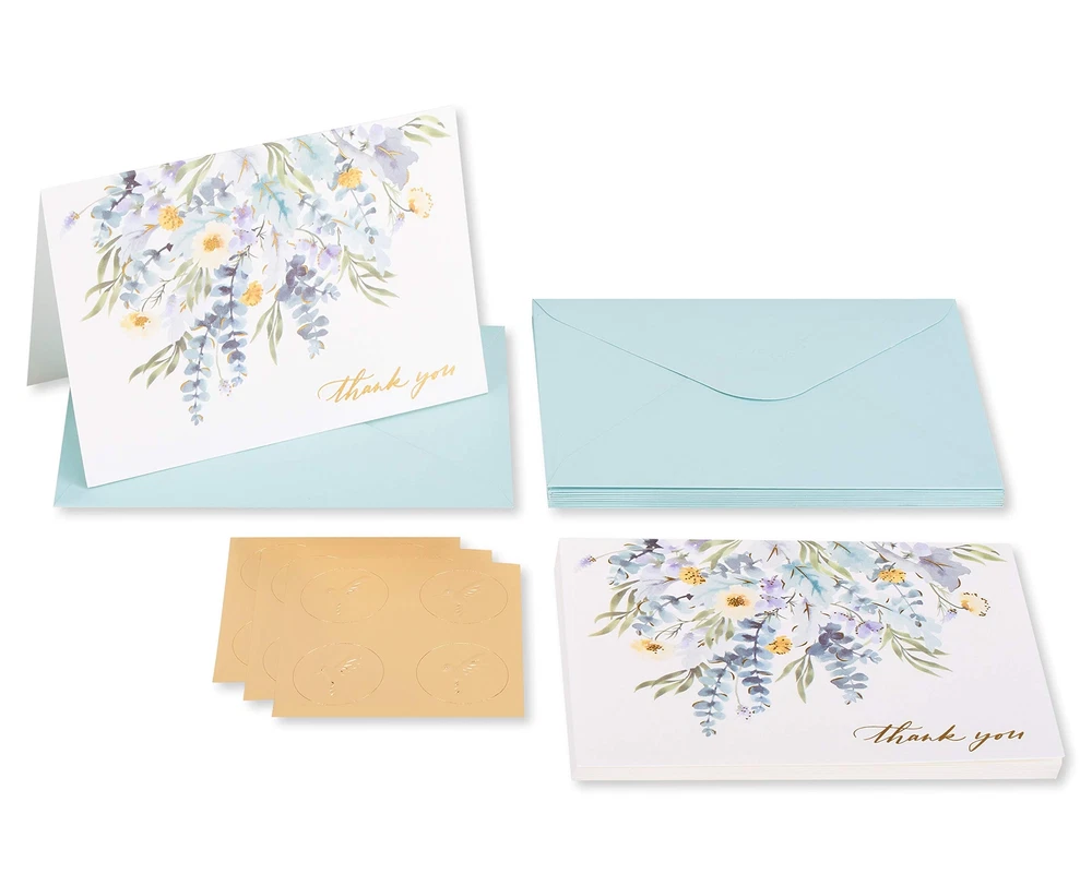 Tell someone you appreciate them with the prettiest thank you card you'll ever see! This premium design from Papyrus features beautiful leaves and flowers in soft shades of green, blue and purple and is embellished with gold foil. “Thank you” is simply stated in gold script beneath the art and the inside of the card is blank so you can add your own personal message of gratitude. They're also perfect for celebrating a happy couple on their wedding day. The lining of the sky-blue envelopes includes a lovely floral leaf pattern that complements the cards. This Papyrus boxed set includes 12 cards, 12 lined envelopes and 12 gold seals. Cards are blank inside for your personal message Papyrus boxed wedding card set includes 12 cards, 12 lined envelopes and 12 gold seals Cards measure 4.125 in. x 5.875 in. Papyrus blank cards with envelopes are perfect for a maid of honor, wedding party, wedding guests or for the newlywed couple on their special day Papyrus offers premium stationery, greeting cards, gift wrap, gift bags and entertaining products for everyday occasions and all holiday seasons--all with unique designs and quality embellishments