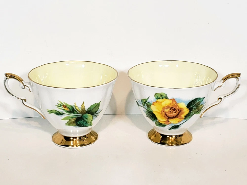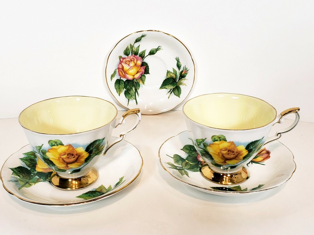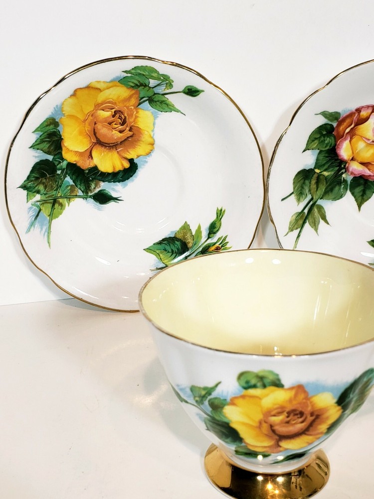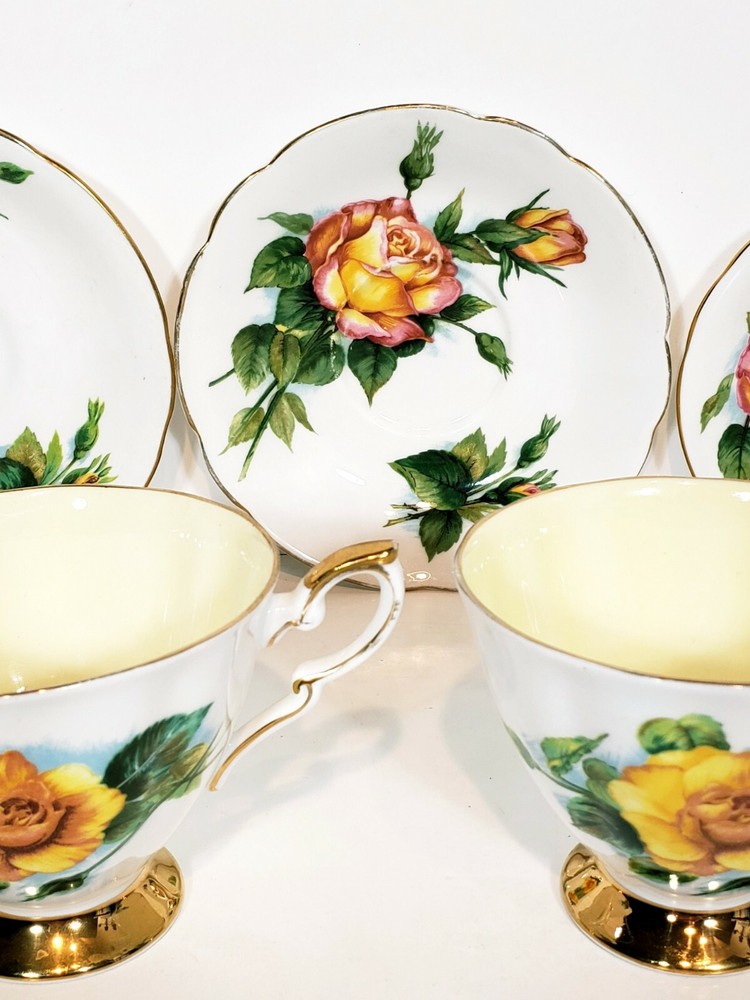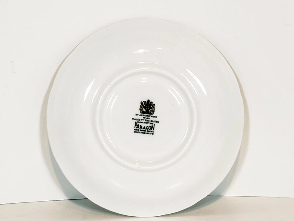 Paragon 5pcs Tea Cups & Saucers Appointment The Queen World Famous Roses. Very nice condition beautiful small mix of two patterns two peace pieces and 3 yellow rose pieces no chips or cracks some gold coloring rubbed off the top of the tea cups and one of the saucers. Two of the larger saucers measure 5 1/2" across the smaller saucer measures 4 3/4" across. Tea cups measure 3 5/16" across 3" tall