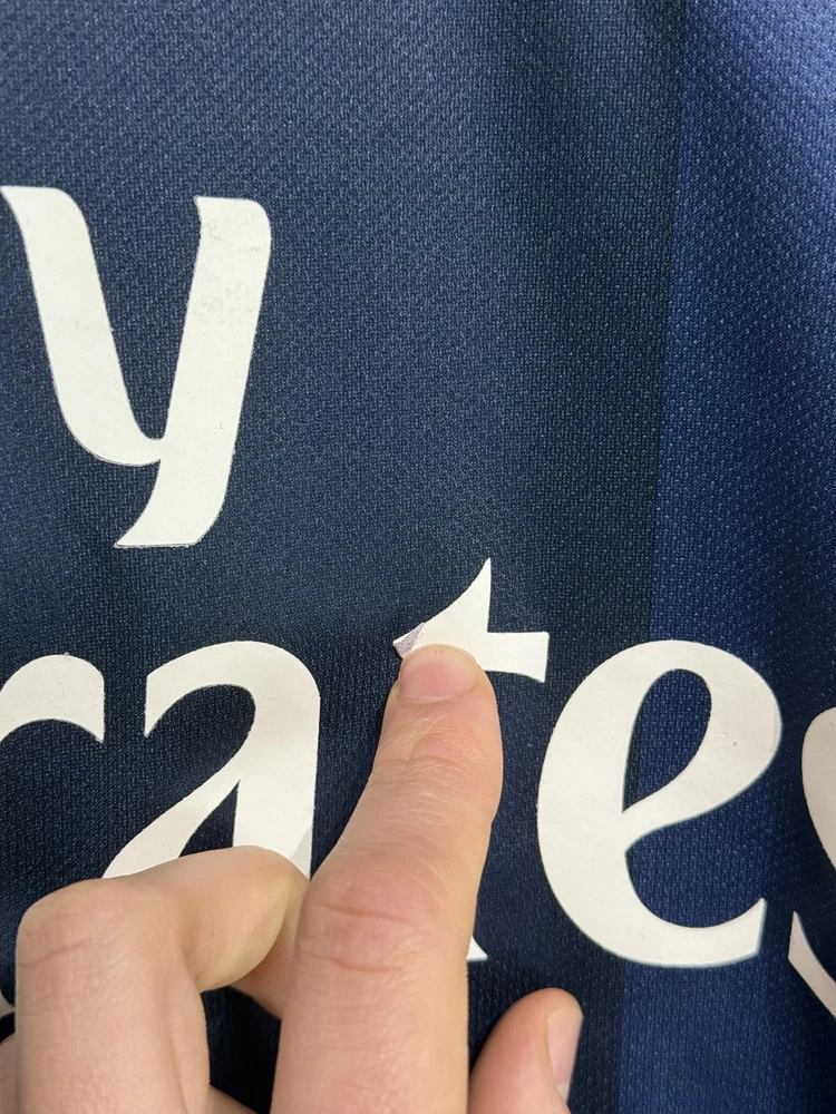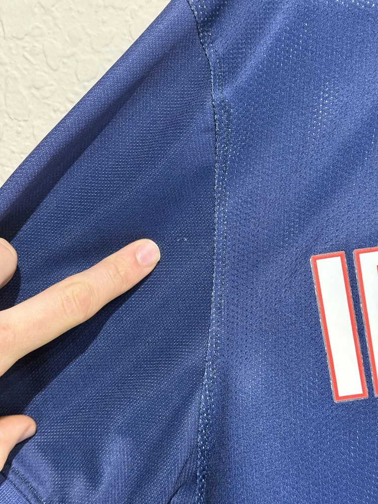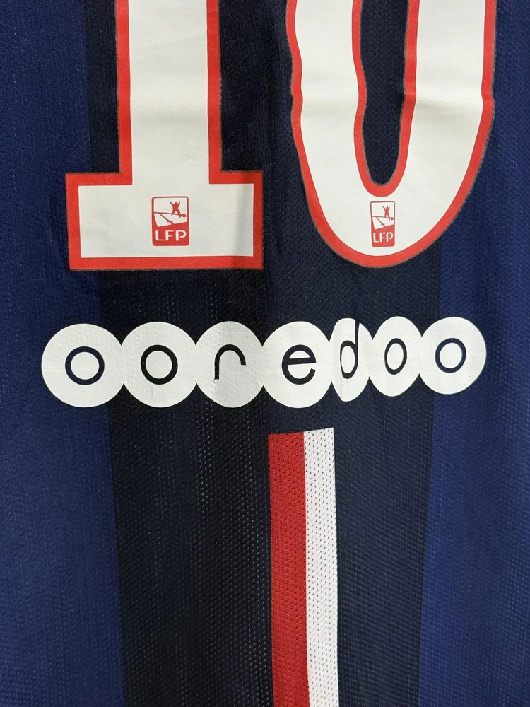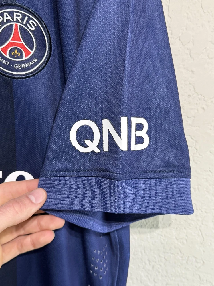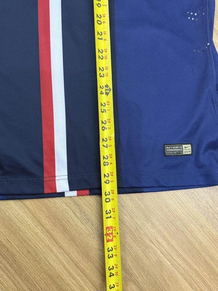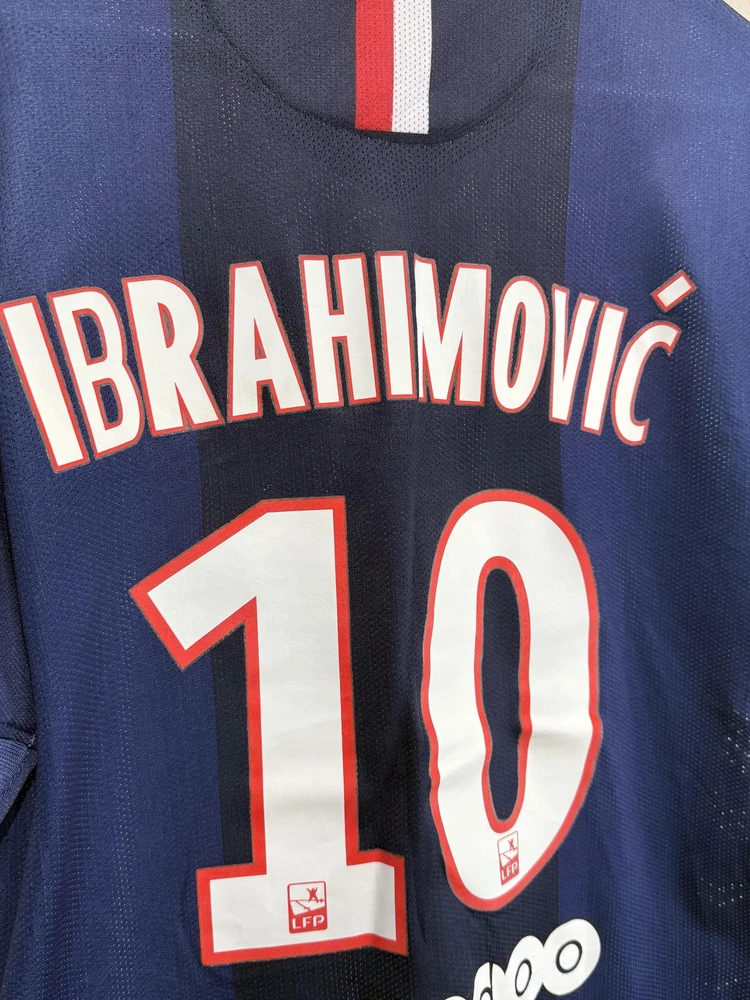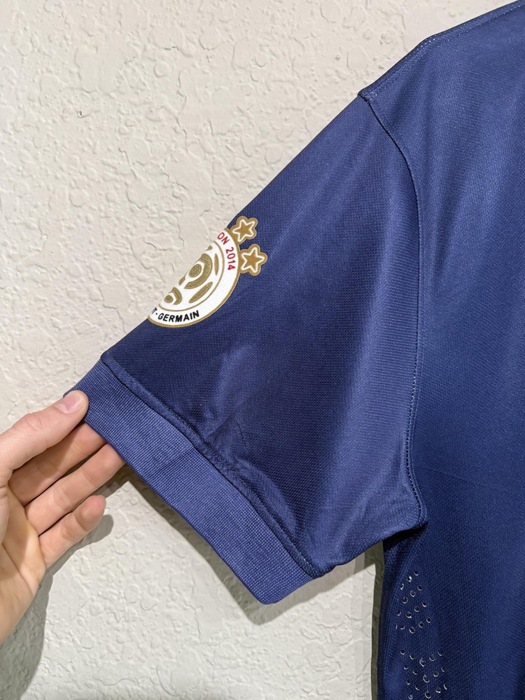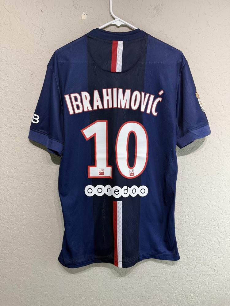 Brand: Nike Team: Paris Saint-Germain (PSG) Style: Authentic home soccer jersey with Zlatan Ibrahimovic name and number 10 on the back, central red and white vertical stripe, short sleeves. Season/Year: 2014-2015 with Champion 2014 Ligue 1 badge on sleeve. Color: Navy blue with darker navy striping and red and white accents. Size on tag: Large Materials: 100% polyester Dri-FIT performance fabric with mesh inner lining and laser-cut ventilation holes at the sides. Country of manufacture: Made in Thailand. Front details: Embroidered Nike Swoosh and PSG crest, Fly Emirates sponsor print, ICI CEST PARIS inner neck detail, authentic Nike 2014 jock tag with serial 000167113, Dri-FIT logo near hem. Back details: Ibrahimovic name set and large 10 with LFP logos, Ooredoo sponsor print, vertical red and white stripe. Additional sleeve detail: QNB sponsor print on one sleeve, Champion 2014 Paris Saint-Germain badge on the other. Inner tag codes: SU131204SYS, style code 479302-620. UPC: 826215900061
