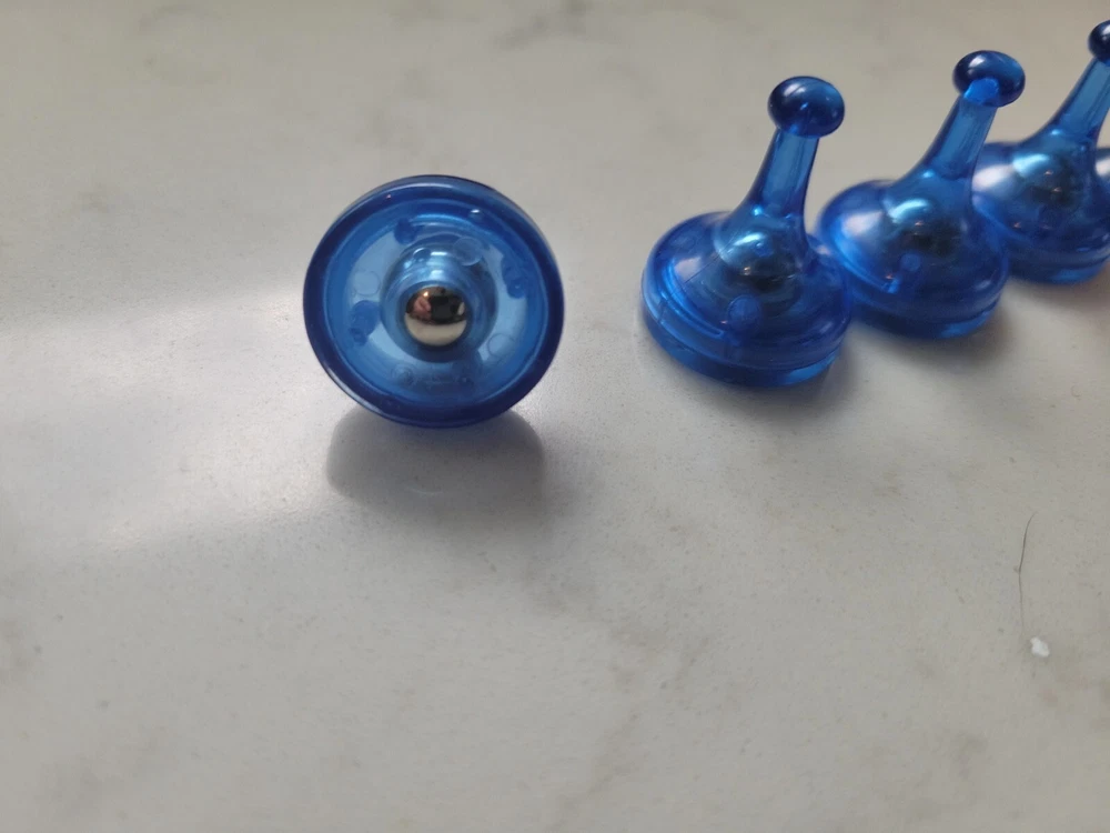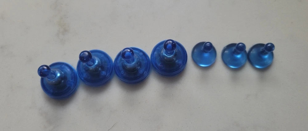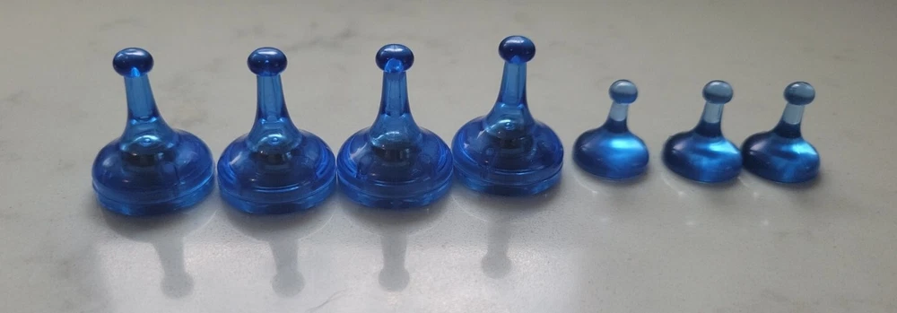 X 4 lage blue sider pawns and x3 blue mini pawns for Parker Brothers Sorry Sliders board game.