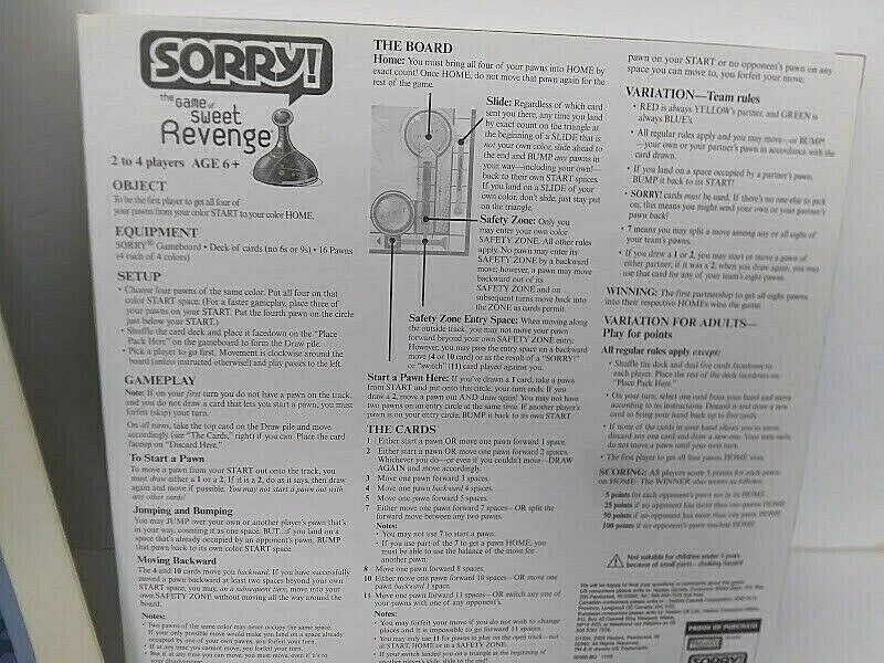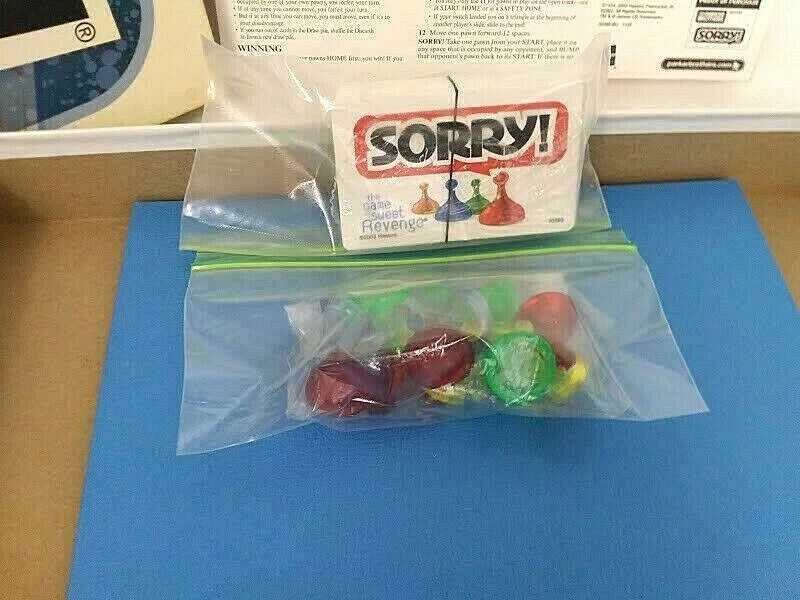 Parker Brothers SORRY Board Game The Game Of Sweet Revenge Ages 6 And Up Please Read The Return Policy,Descriptions And 1 Day Handling Times Carefully Before Purchasing *** ATTENTION !!! My Best Offer Is Set At $3.00 To $10.00 Less Than The Fixed Price *** *** All Photo's Are Of The ACTUAL Item(S) That You Will Receive Guaranteed *** *** Ships From The U.S *** (1 Or Same Day Handling Time ) **PLEASE READ!! *** Saturday-Cut Off Handling Time Is 7 Pm Eastern Standard Time(Will Ship On Monday) Sunday - Cut Off Handling Time Is 7 PM Eastern Standard Time(Will Ship Next Day On Monday) Mon.-Fri. - Cut Off Handling Time Is 1 PM Eastern Standard Time(If Ordered After 1 PM Will Ship Next Day) *** If Order On A Major Holiday We Will Ship The Day When The Post Office Reopens *** *** Ships USPS Priority Mail Package Delivery (Square Game Box) *** (U.S) *** Ships Ebay International Standard Delivery (Game Box/Paper) *** ( International ) Item Description : *** Pre-Owned *** This Game Is Basically NEW,Has Been Opened, But Never Played And Has Been Sitting In Storage... Box Has Very Little Dust Stains On It ( Has Been Cleaned Up A Bit ) **Be Sure To Inspect Your Item Immediately Upon Arrival Please Leave Positive Feedback If You Are Happy And Satisfied With your Purchase If By Any Chance That The Item Is Not As Described Please Contact Us So That We Can Fix It...Please Report The ERROR To Us. Condition- *** Pre-Owned *** *Location : From A Smoke Free And Pet Free Home ! *Payment : ALL TRANSACTIONS MUST BE HANDLED THROUGH EBAY ONLY!! *Shipping : We Ship All Items 1 Or Same Business Day Of Payments Clearing (Including Weekends And Holidays) We Ship Worldwide * Return Policy:Please Read Carefully !! *** If We Offer Returns *** We accept a return for any reason during 30 days after receiving the item Undamaged,in resalable condition and original package for a refund less ALL shipping costs plus restocking fee 10%. Items That are Broken,Taken Apart,Scratched from a smoking environment will not get a refund. Please be gentle with the item. We Provide you with Descriptions; If you need more information about the item ..Please don't hesitate to ASK ! We will be more than happy to help you to make the right purchase. HAPPY AND SATISFIED CUSTOMERS ARE OUR # 1 PRIORITY !!! ***** Contact Us ****** Please Feel Free to Contact us with Any Questions about the Item Thank You For Stopping By and Have a Great Day!!